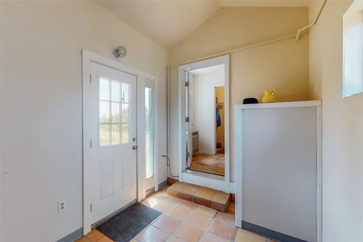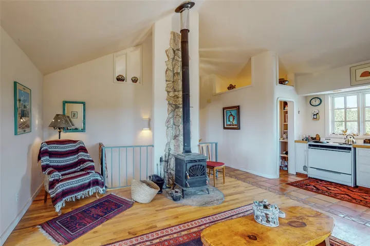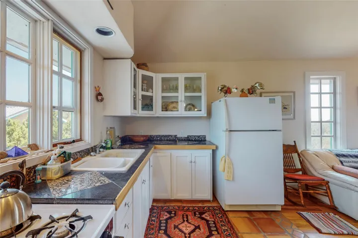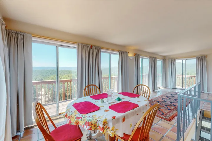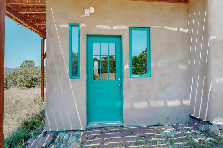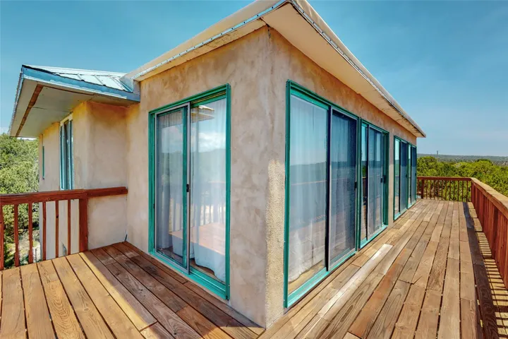 Country Living @ its best, 175 Hidden Valley Ranch Road, Ilfeld, on 5.025 acres, has much to offer buyers in a quiet rural setting. The land adjoins Val Kilmer’s former ranch for 661 feet, and the house offers undisturbed views of Rowe Mesa to the west and Cow Creek Valley to the east. The creatively designed two-story home has wrap around deck, two sunrooms( 1 on each level) with heat retaining floors, and is sited for privacy and views. There are three bedrooms (two up, one down) 2 bathrooms with Talavera Mexican hand-painted sinks and tile counters, a country kitchen with a walk-in pantry, a living room with vaulted ceiling and Waterford wood burning stove backed by floor-to-ceiling artistic stone heat shield. Other features include one car garage/shop, a 16′ by 12′ storage shed with electricity, a private well, an inviting mud room, two stairways (one metal, one oak), 1000 gallon water storage tank, all appliances -washer, dryer, oven/stove, refrigerator, Saltillo, Oak and Maple flooring and 1 of the 5 acres is dog fenced. For folks looking for a destination property 50 minutes from Santa Fe and 35 minutes from Las Vegas, please consider 175 Hidden Valley Ranch Road.