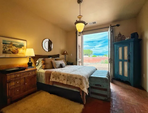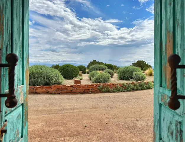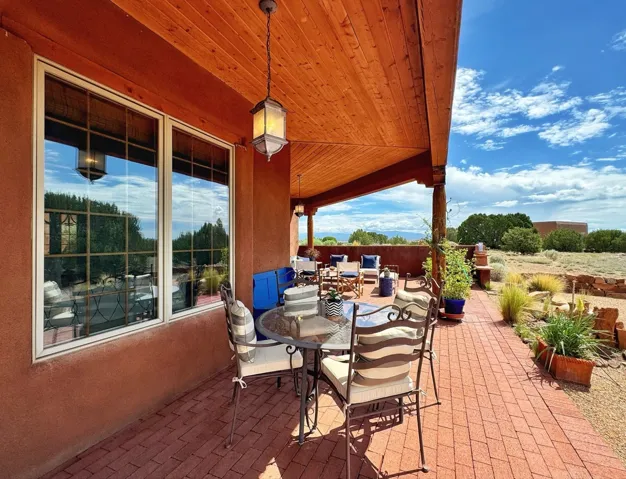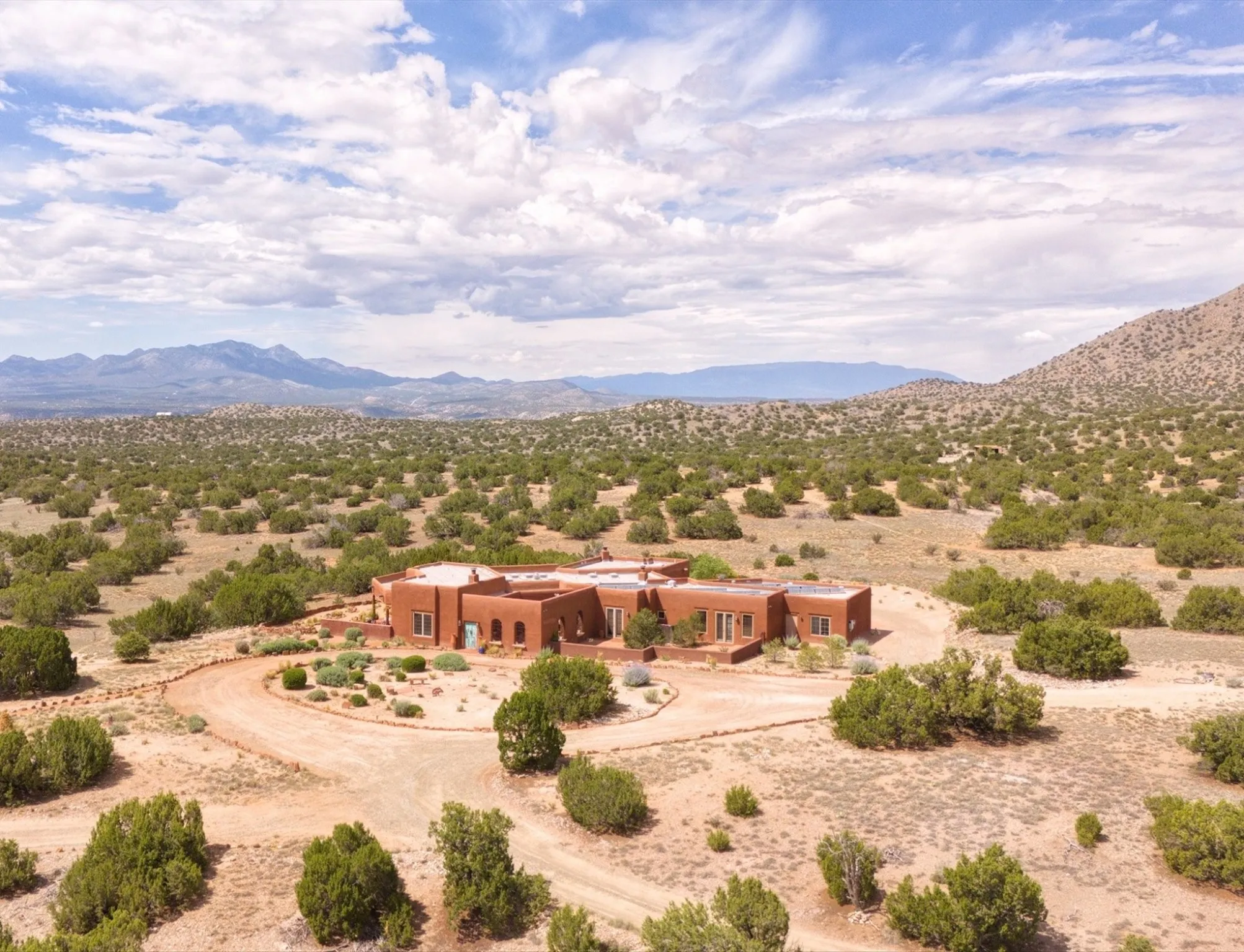 Luxurious single-level custom-built home in Silver Hills Ranch, just 20 mins from Santa Fe & 50 mins from Albuquerque International Sunport. Set on 14.37 acres adjacent to BLM and county open space, the property offers ample room to build equestrian facilities and accommodates up to 7 horses. The 3,360 sq ft main home—recently re-stuccoed—is paired with an 820 sq ft adobe casita—both enjoying 360° panoramic views of the Galisteo Basin, Cerrillos Hills, Sangre de Cristo, Sandia & Ortiz Mountains. The main home features 3 bedrooms, office/library, & 3 bathrooms (2 full, 1- 3/4), and welcomes you through a spacious courtyard with antique mesquite doors. Inside, the foyer features an exposed brick accent wall that adds character and warmth. The great room boasts soaring ceilings with wood beams & tongue-and-groove planks. A chef’s kitchen offers Viking Pro appliances, alder cabinetry, honed granite & slate countertops, dual islands, custom hood, & two sinks (granite farm & copper). The primary suite includes a spacious walk-in closet and a luxurious full bathroom with dual marble sinks. Additional features include a library/flex room, media room, & 3 wood-burning fireplaces w/gas starters. Elegant finishes include herringbone brick & fossilized stone floors, hand-troweled plaster walls & Pella Architect Series windows. Seven sets of elegant 8-foot Pella French doors open effortlessly to five serene patios and courtyards, providing expansive outdoor living spaces perfect for entertaining, relaxing, and enjoying breathtaking panoramic views. Modern comforts: central A/C, in-floor radiant & forced-air heating, built-in fridge & whole-home stereo. Eco-friendly features include 24 solar panels, 500-gal propane tank, & 3 rainwater-harvesting cisterns. The casita offers stylish modern finishes & a ¾ bath—ideal for guests. Located in a desirable neighborhood w/low HOA fees & sensible CC&Rs. A rare blend of luxury, functionality & sustainability in an unmatched natural setting.