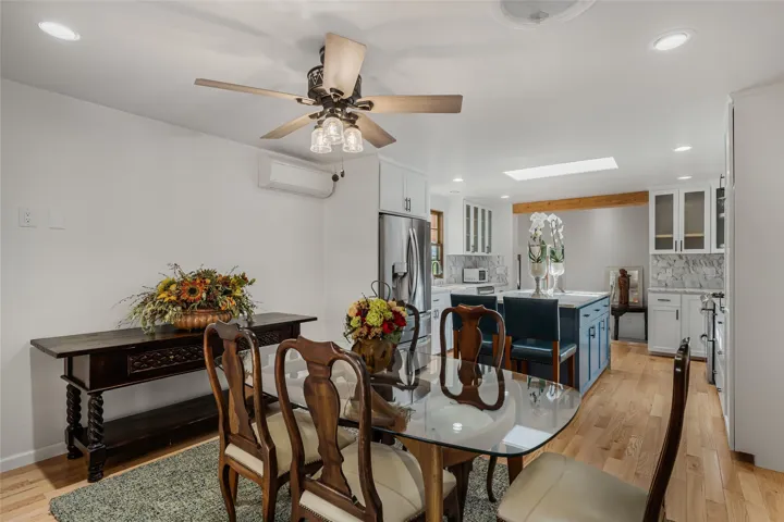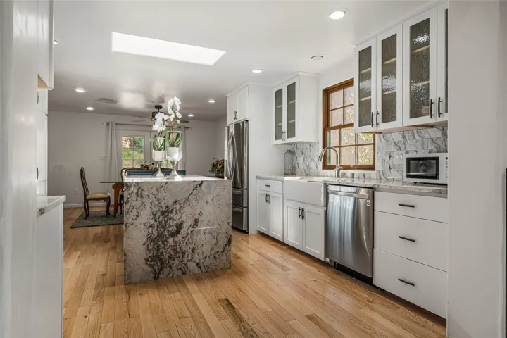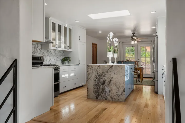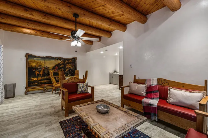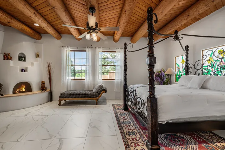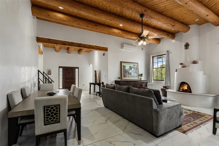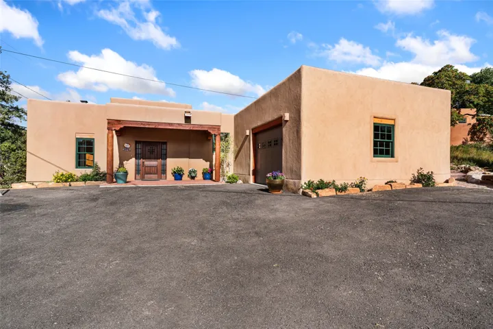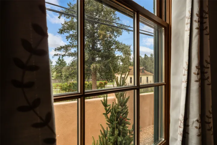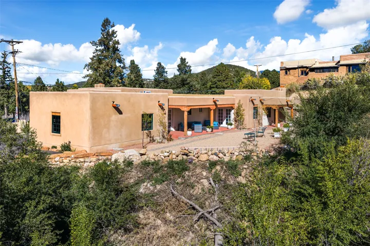 Elegant Eastside Living on Upper Canyon Road – Set in a premier Eastside location across from the tree-lined Santa Fe River Park, this beautifully designed and built 4-bedroom, 4.5-bathroom estate blends timeless Southwestern charm with modern luxury. Offering approximately 3,800 square feet on a 0.45-acre lot, the property includes a 3BD/3BA main residence and a 1BD/1BA guest suite, thoughtfully designed for comfort, privacy, and style. Inside, clean architectural lines meet regional authenticity with vigas, corbels, and nichos, complemented by diamond-finish plaster walls, wide porcelain tile, and rich wood flooring. The open-concept layout flows seamlessly through the home, anchored by a chefās kitchen with custom cabinetry, stainless steel appliances, a farmhouse sink, and an expansive marble center island. The living and dining spaces feature vaulted ceilings, art-worthy wall space, and abundant natural light. A serene primary suite offers a walk-in closet, artisan stained-glass windows, and a spa-like bath with soaking tub and glass-enclosed shower. Radiant heat and mini-split systems (with heat and a/c) throughout ensure year-round comfort. The landscaped grounds invite outdoor living with portals and patios ideal for entertaining or quiet reflection. A privacy wall encloses the property, and an oversized one-car garage offers additional storage. Located near the historic Cristo Rey Churchāa landmark by architect John Gaw Meemāthis property captures the essence of Santa Fe living: elegant, rooted in history, and surrounded by natural beauty.