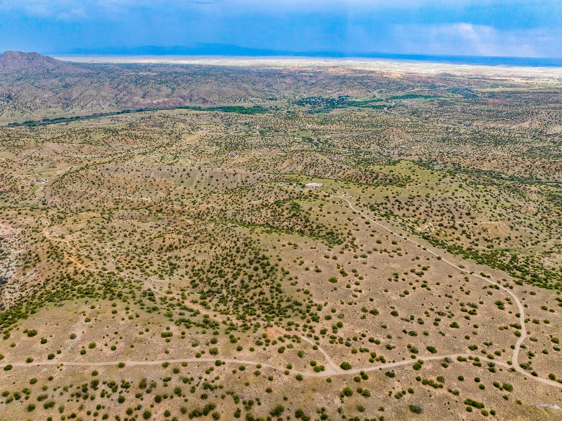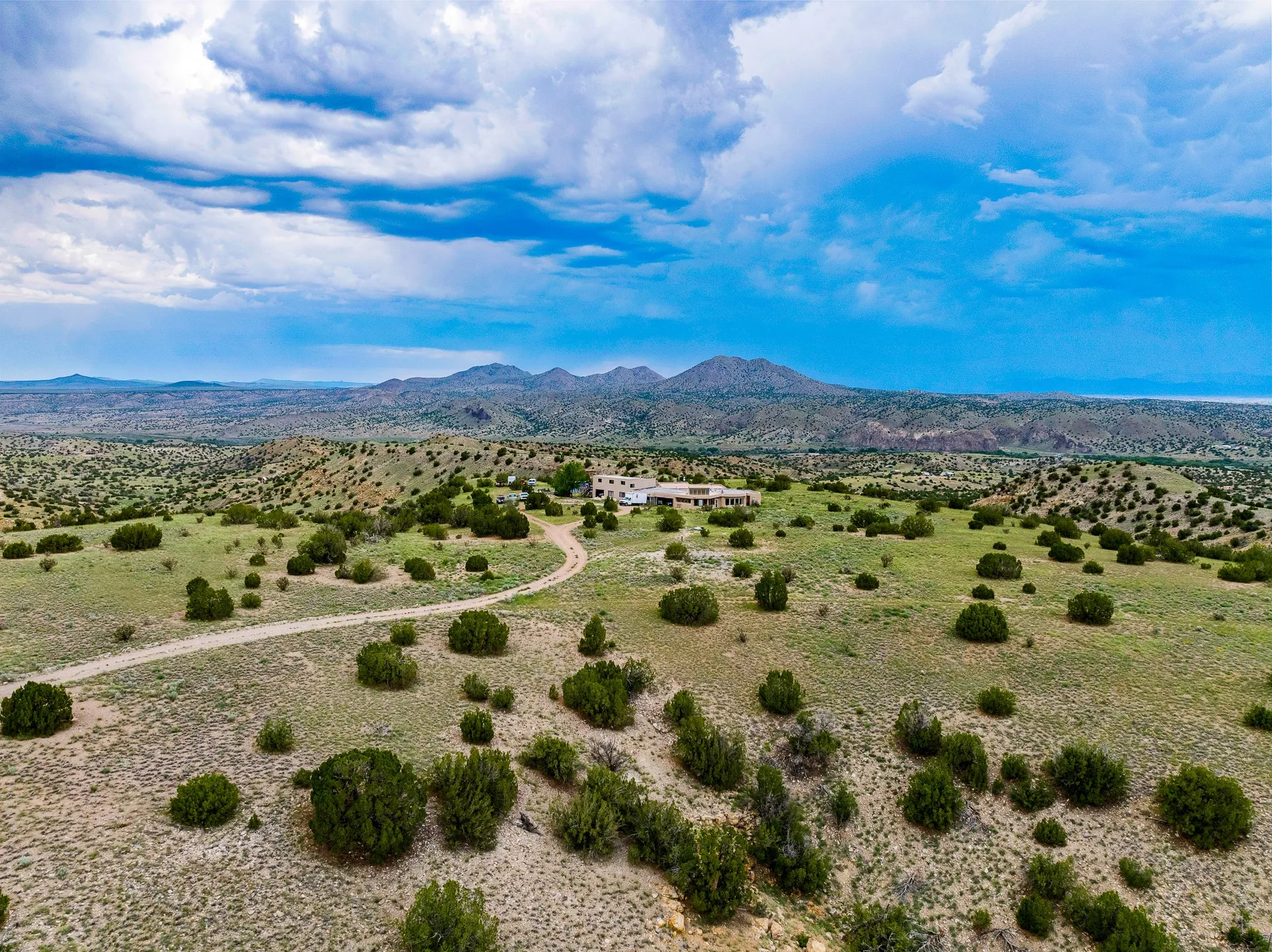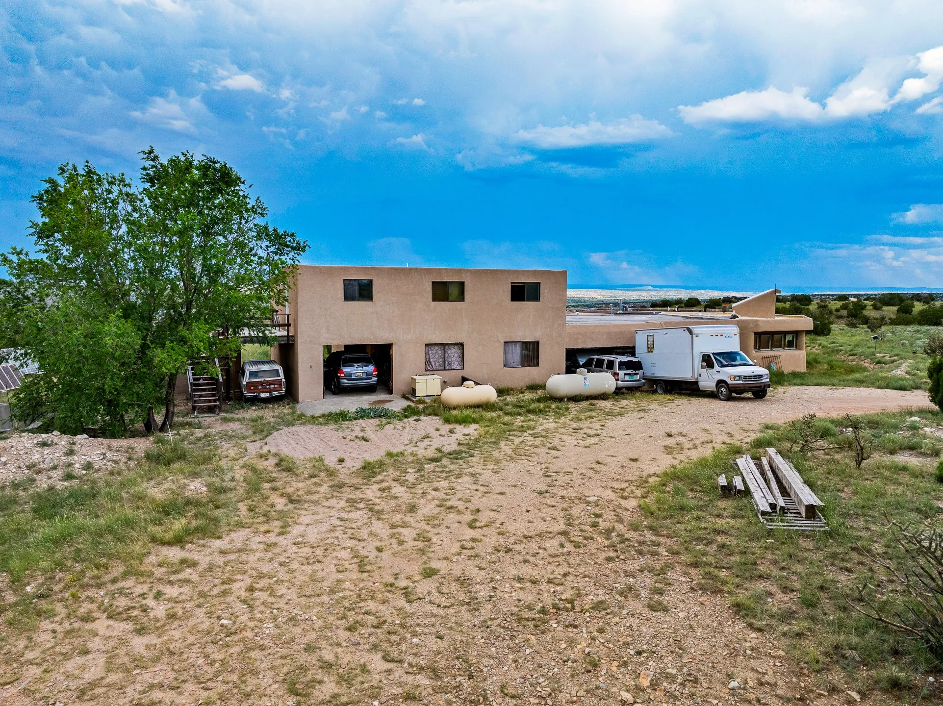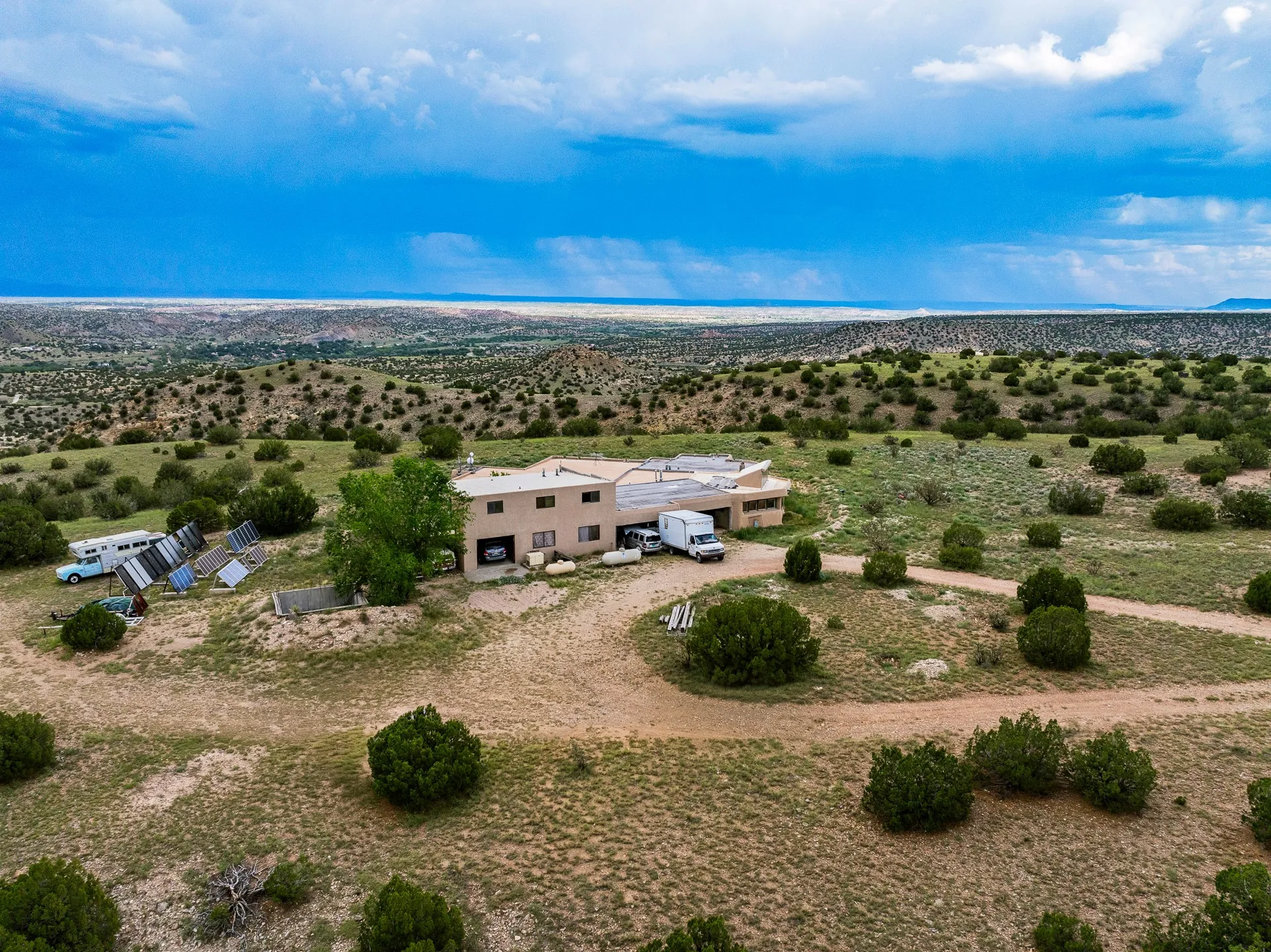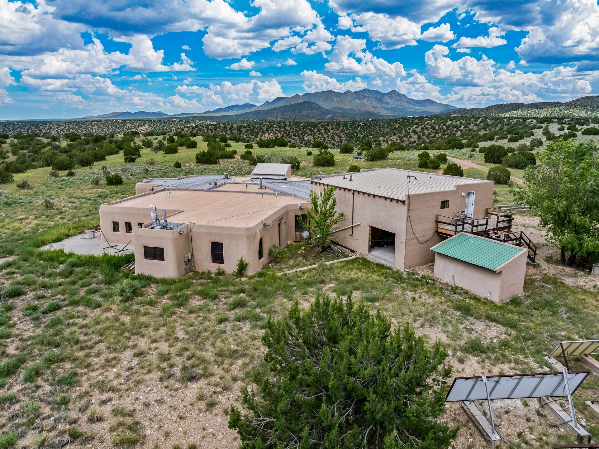 Mesa-top views, space and privacy from this substantial off-grid home on 53 acres, two miles from Madrid and Highway 14. Primary residence is 4474 square feet all on one level, with generous, ample rooms, an open concept kitchen, a separate media nook, home office, and a light-filled living room. A kiva fireplace warms the dining area. Two large bedrooms and two bathrooms are in the main home. A separate upstairs apartment has its own kitchen and bath. The home features rammed earth construction with exterior walls two feet thick, and plaster interiors, radiant flooring, and solar power. The upstairs apartment, with its own entrance, is 1008 sq. ft. and offers guest, caretaker, or rental opportunities. 1132 sq. ft. of shop and garage space provides room for parking up to 5 cars. Acreage would be ideal has for gardening, horses, etc. Home has some deferred maintenance and needs finishing in places, and is priced accordingly, bring your vision and energy for an opportunity for considerable sweat equity.