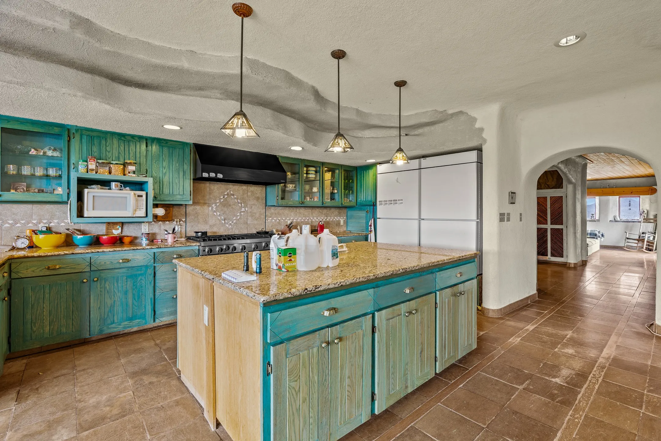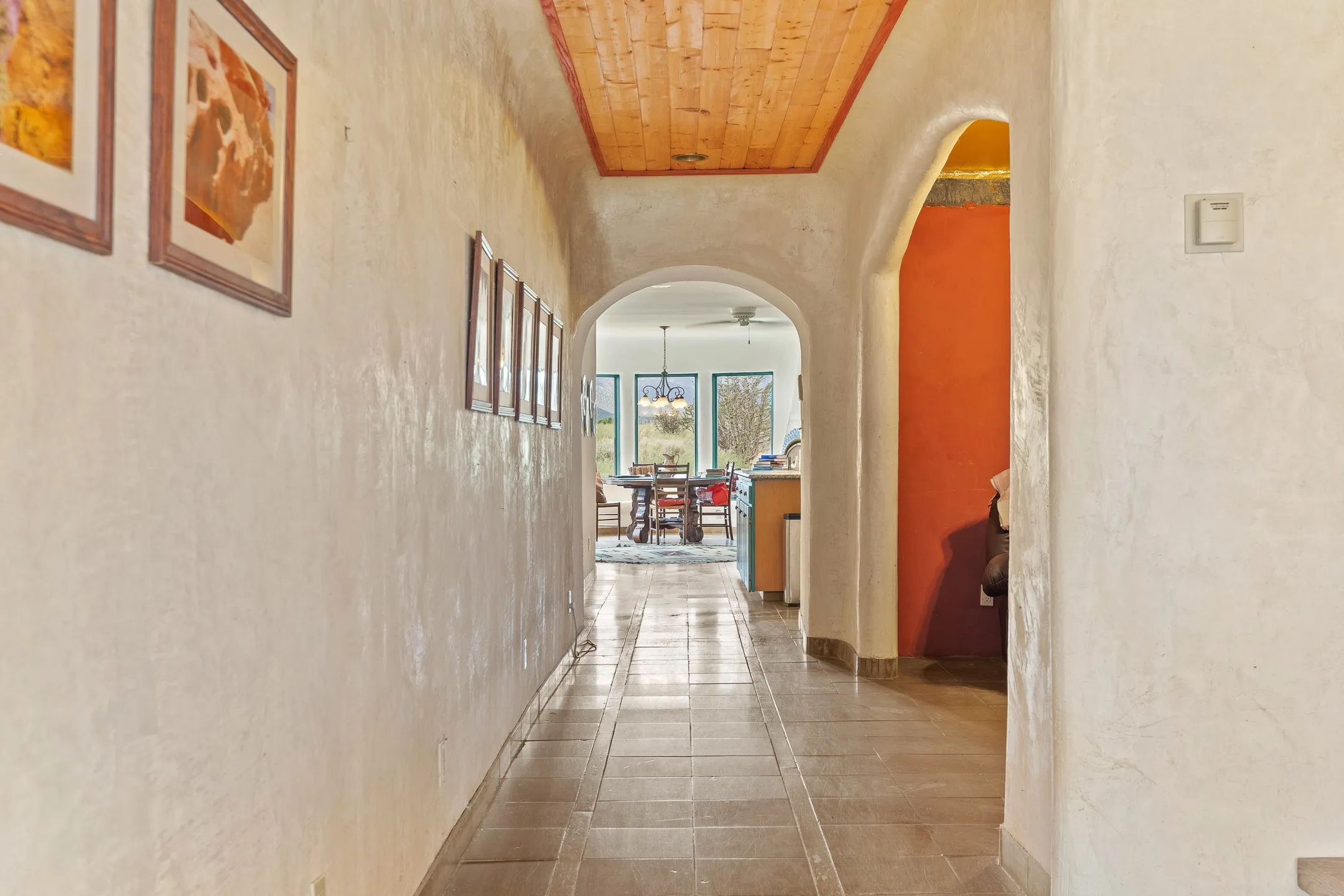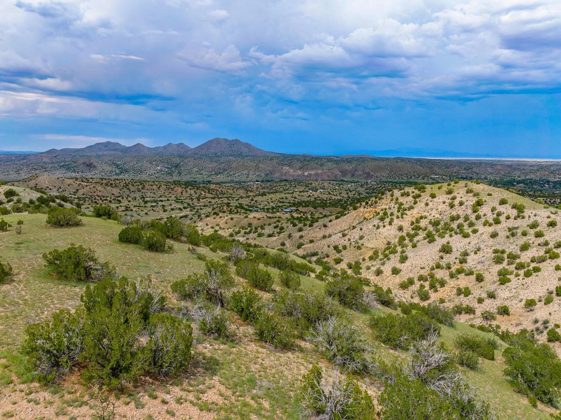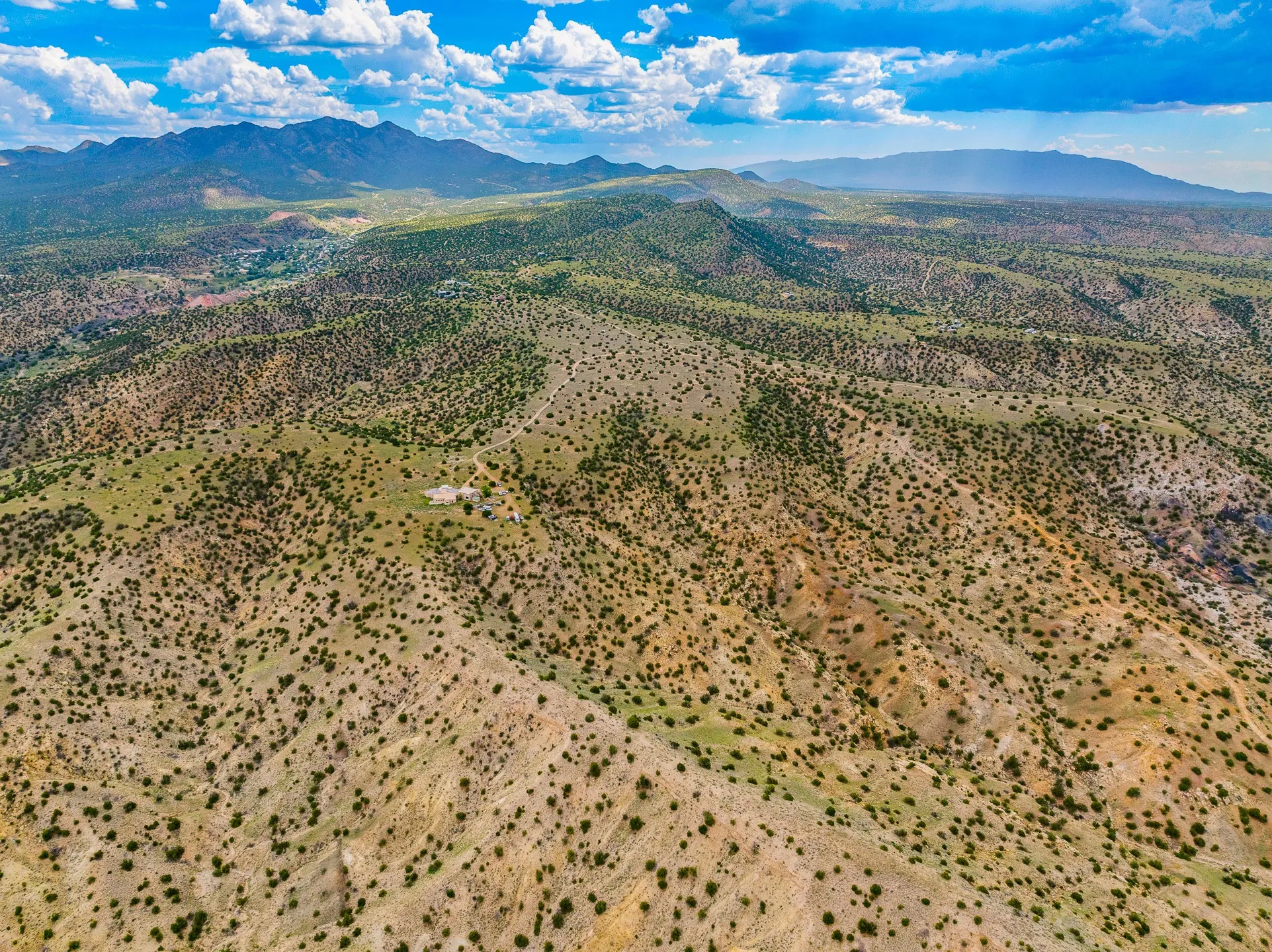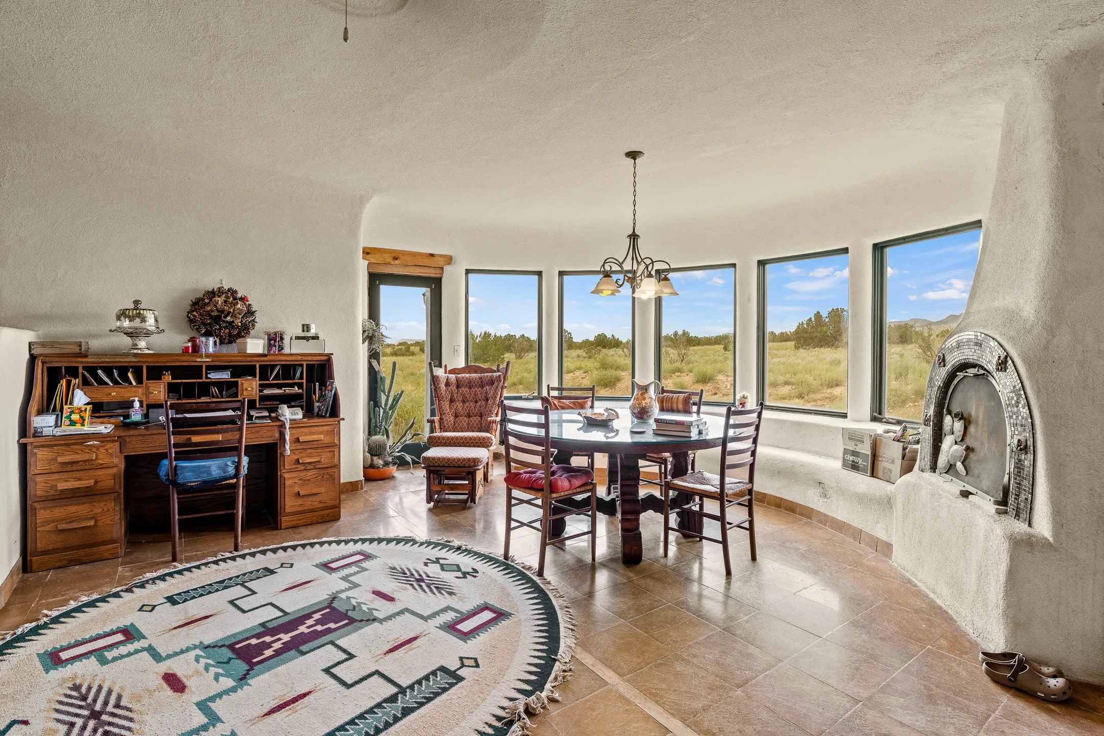 Mesa-top views, space and privacy from this substantial off-grid home on 53 acres, two miles from Madrid and Highway 14. Primary residence is 4474 square feet all on one level, with generous, ample rooms, an open concept kitchen, a separate media nook, home office, and a light-filled living room. A kiva fireplace warms the dining area. Two large bedrooms and two bathrooms are in the main home. A separate upstairs apartment has its own kitchen and bath. The home features rammed earth construction with exterior walls two feet thick, and plaster interiors, radiant flooring, and solar power. The upstairs apartment, with its own entrance, is 1008 sq. ft. and offers guest, caretaker, or rental opportunities. 1132 sq. ft. of shop and garage space provides room for parking up to 5 cars. Acreage would be ideal has for gardening, horses, etc. Home has some deferred maintenance and needs finishing in places, and is priced accordingly, bring your vision and energy for an opportunity for considerable sweat equity.