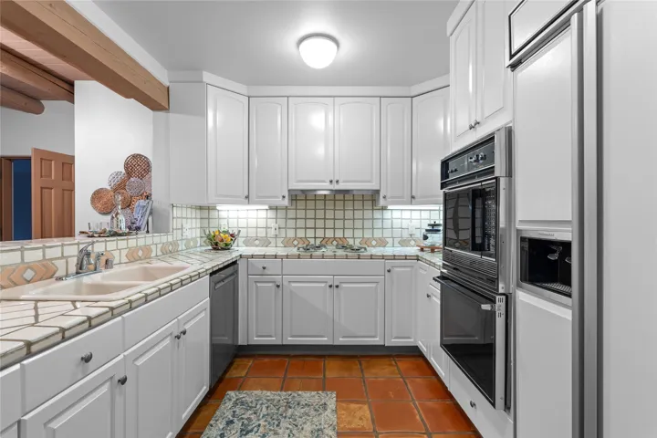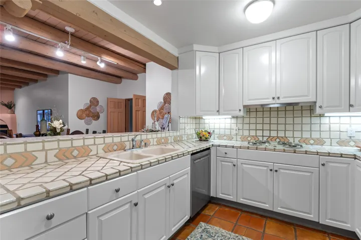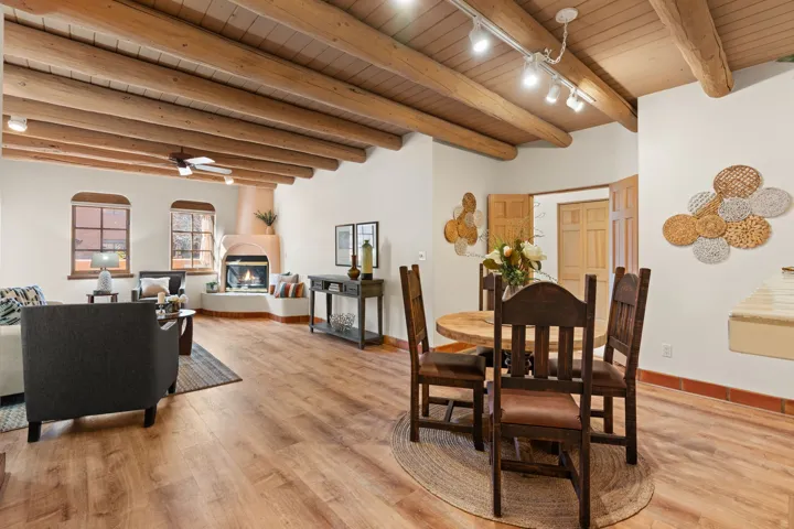 Inside, the condo features a spacious kitchen with Mexican tile counters and a brand-new dishwasher, blending traditional charm with modern convenience. The living and dining areas boast wood-look luxury vinyl flooring, complemented by a cozy corner Kiva fireplace, ideal for relaxing evenings.