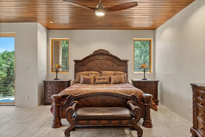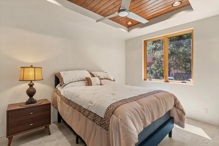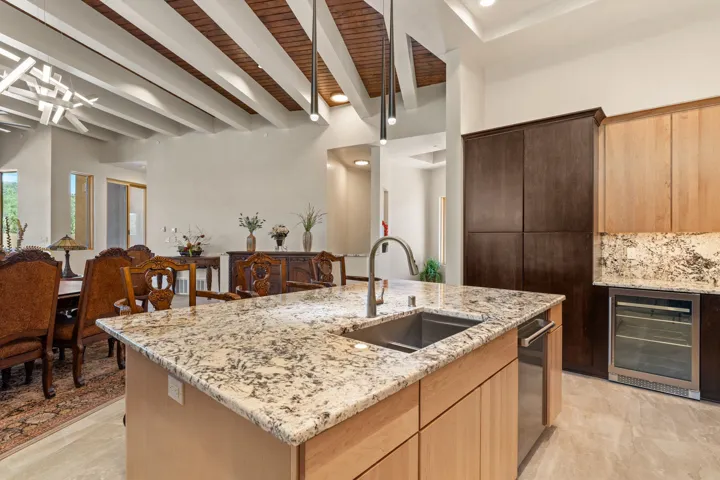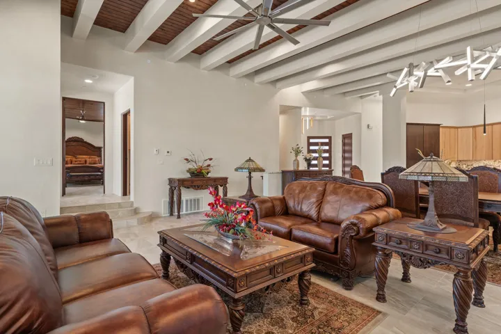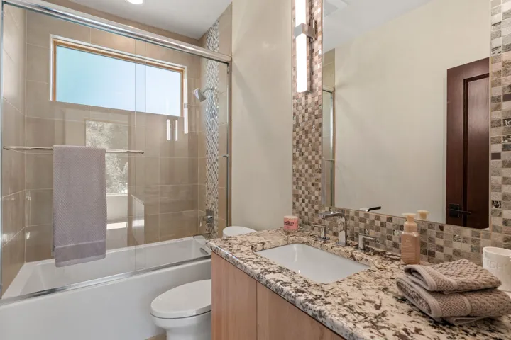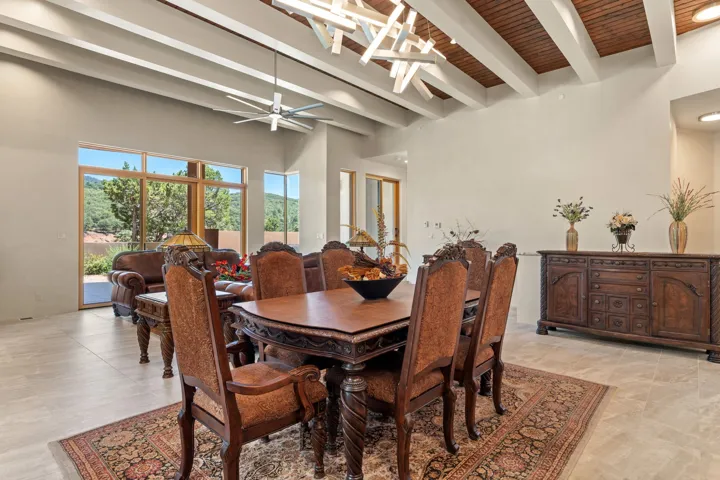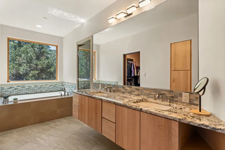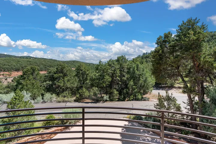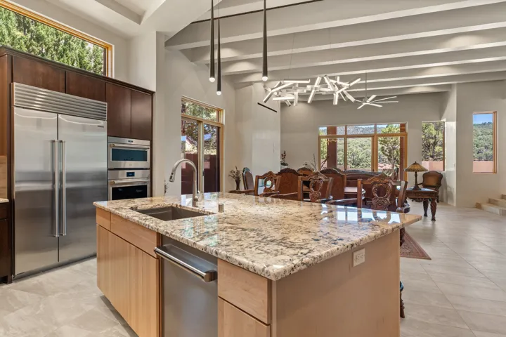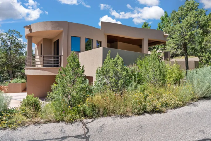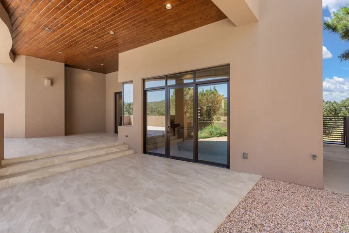Outstanding contemporary home in the gated, private and paved Santa Fe Summit Subdivision located just minutes from Santa Fe’s historic plaza, Canyon Road and the Santa Fe Ski basin. Sophisticated high-end property featuring a sleek and modern design with a 3-car finished garage, an open concept living room with 13′ high beamed ceilings, a lineal fireplace and fabulous views. The spacious kitchen features a large center island, granite countertops, maple cabinets, and Wolf/Sub-Zero appliances. The elegant master suite has a wood ceiling, covered view deck, a sitting area with a lineal fireplace, and a well-appointed master bathroom with a jetted whirlpool. All of the living areas have plastered interior walls (diamond finish), 12″ thick exterior walls (finished), 8′-10′ tall contemporary Pella sliding doors and windows, stylish lighting and polished nickel fixtures, floating vanities, Italian porcelain flooring, thick maple doors, in-floor radiant heat, and refrigerated air conditioning (2 systems). This home was sited and designed to maximize views of the spectacular Sangre de Cristo mountains with a large exterior rear deck plus 3 covered portals. The circular driveway is surrounded with custom rockwork and the entire lot is fully landscaped with a drip-irrigation system, 4 planters, and numerous perennials, pinon and pine trees.