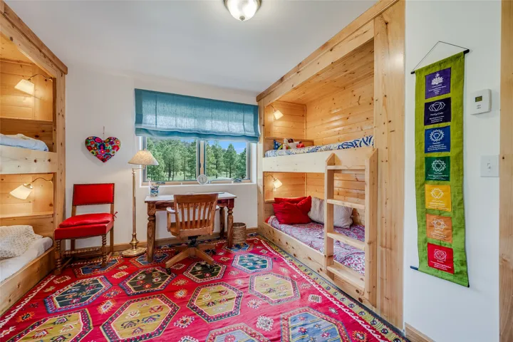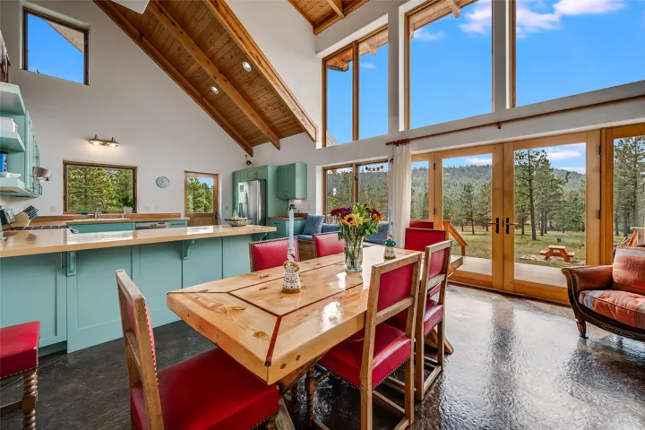 Located within the community of Blue Deer Ranch is a thoughtfully designed, off-the-grid, solar-powered, self-sufficient two-story house, garage with upstairs studio, two sleeping cabins, a greenhouse and raised beds for gardening. The main home is spacious with a vaulted tongue & groove fir ceiling and a loft that extends the full length of the house. At either end of the loft there is a 10 by 8.5-foot open space. The primary suite is upstairs with a full bathroom and balcony. Downstairs there is a guest bedroom with an ensuite bathroom, a second bedroom with 4 built-in bunk beds and a third bathroom with tiled walk-in shower. The kitchen, dining area and living room span an open floor plan. The expansive windows offer stunning views of the surrounding forest and ridge. The home is encircled on three sides by an 8-foot lifetime aluminum deck. The house is extremely well insulated with a passive solar design and maintains an excellent level of comfort even in the dead of winter on sunny days. There is a 3 cubic foot wood stove that burns up to 10 hours and in-floor propane radiant heating. During the warm months, no cooling is required, by opening several windows at night and shutting them in the morning to maintain a cool, fresh atmosphere all day. The property sits at 7,300 feet and the nights are always cool. Blue Deer Ranch comprises 703 acres in total and is shared with neighbors in a unique shared land ownership arrangement. There are 16 individual use area parcels, each approximately 10-acres. This property includes 4 individual use areas giving the owner a 25% indivisible interest in the entire 703-acre ranch. The house sits on individual use area #4. The three other individual use areas (5, 6 & 7) are undeveloped. The remaining 543 acres of the ranch is community land that is available for hiking and exploration.