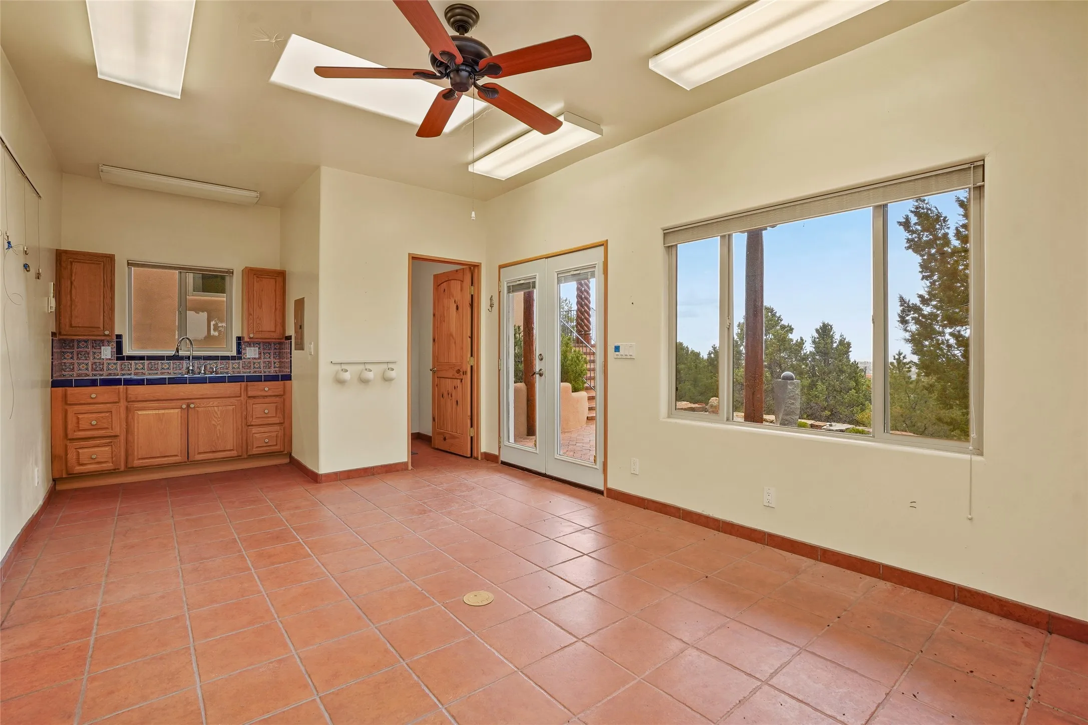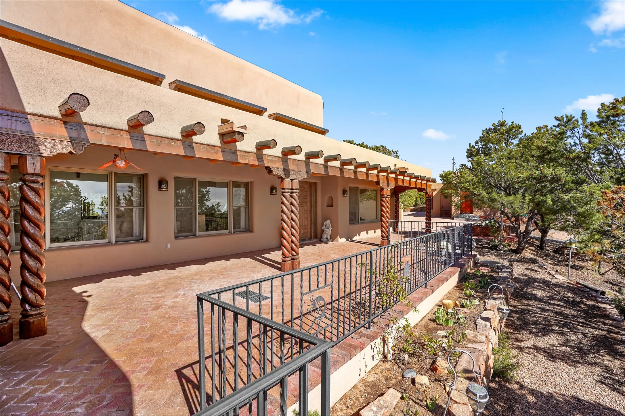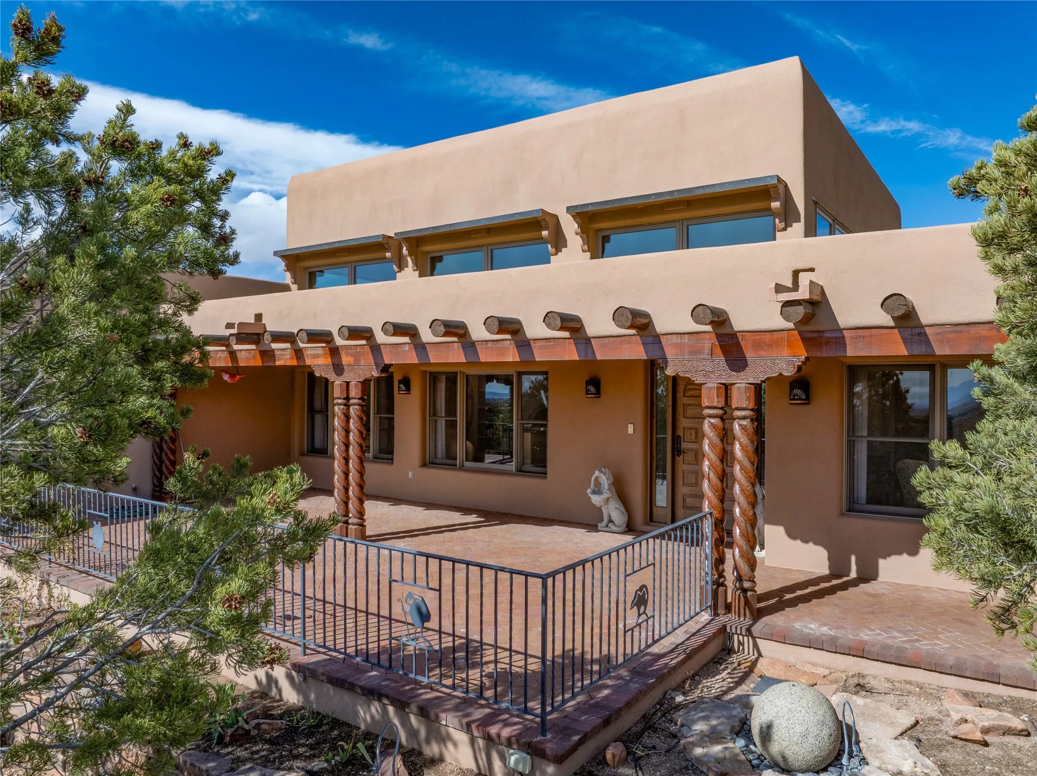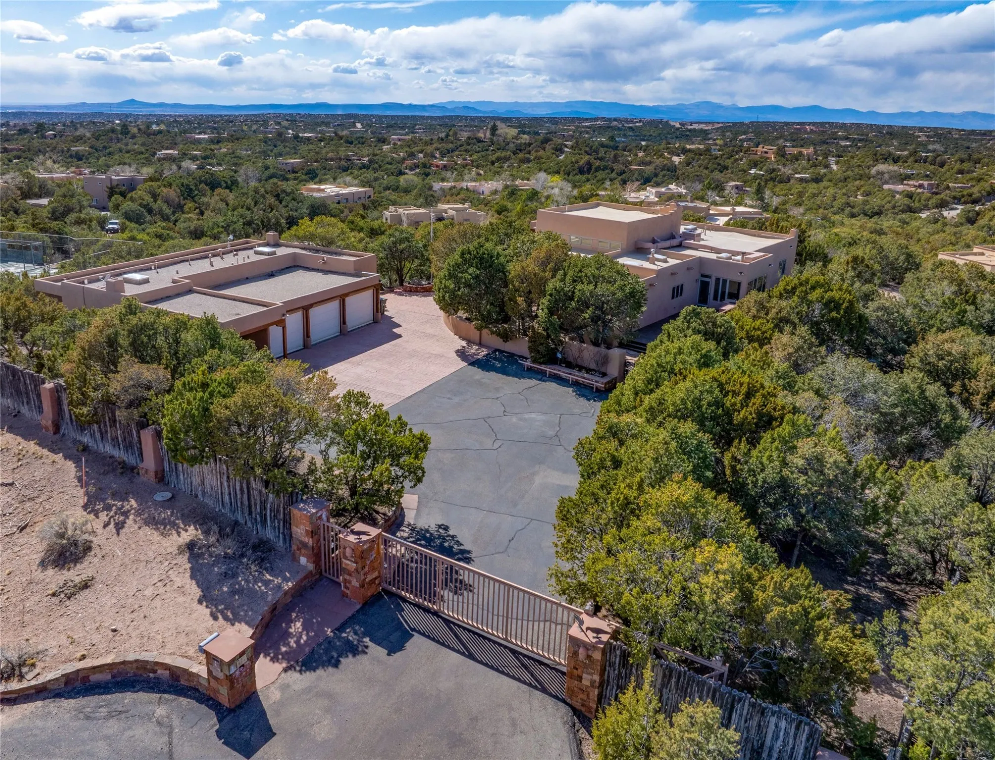 A very special estate offering approximately 1.5 miles to the Historic Santa Fe Plaza. Convenient to Highway 285, Tesuque Village, Ski Santa Fe and The Santa Fe Opera. The single level main house commands exquisite views of Downtown Santa Fe, the Jemez Mountains and a gorgeous, nestled view of the Sangre de Cristo Mountains. The gorgeous Kitchen is well designed and equipped. The guest casita has two fireplaces and also has a great view to Downtown from the large south facing veranda. The beautiful art studio is a perfect workspace with a kitchenette (partial kitchen: Sink, counter, cabinets. No appliances) and 1/2 bath. A 3- car garage is a great addition to this estate compound. There is also a tennis court included with this offering. The tennis court needs work, though it is thoughtfully located on the property with views of Downtown. The Great Room has 14′ high ceilings with hand carved beams. The ceiling also has viga and cedar latillas. A wet bar is also located in the Great Room. This is an extremely well-designed home as well as are the additional structures. This property is coyote fenced and gated with many security features.