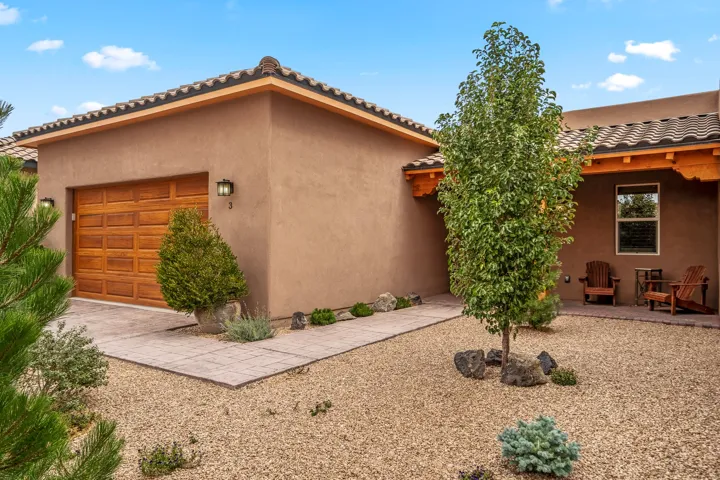 Upgraded features throughout include Hunter Douglas window treatments and wood-like porcelain tiles throughout. The primary suite offers a deep walk-in closet, a soaking tub and an overhead rain shower that enhances the feeling of luxury. Nichos in the hallway add a touch of Santa Fe charm, while the Spanish clay tile roof and portals offer great curb appeal.