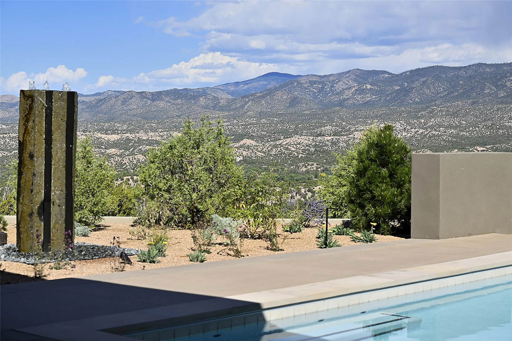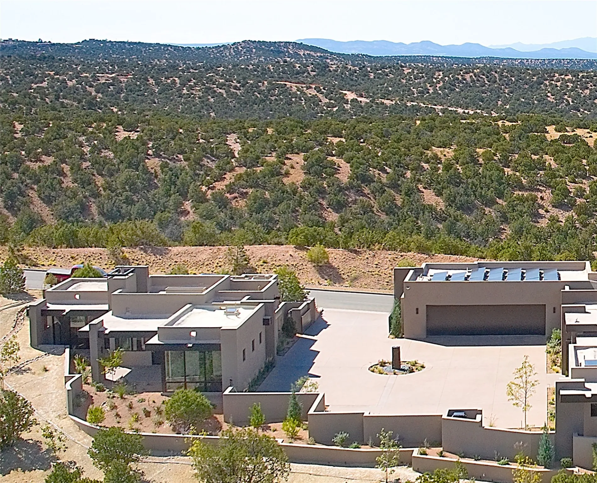 One of the most magnificent contemporary homes in Santa Fe, this new residence and guesthouse in the coveted northside enclave of Monte Sereno was designed and built by Dressel Construction. The heart of the main residence is a spectacular showplace for grand gatherings or quiet moments of private relaxation and reflection while appreciating Santa Fe’s impossibly blue skies and the majesty of the Sangre de Cristo and Jemez Mountains and the Badlands. Open, airy, and inviting, it includes a strikingly dramatic wine room, a wet bar, and a vast living space with walls of glass affording a cinematic view and opening to an equally inspiring portal and patio with a pool. A media room and a library or office adjoin, offering more intimate spaces for day-to-day living and tasks. Nearby, an elegant kitchen includes a host of superior appliances and surface along with a well-equipped plating kitchen, a walk-in pantry, and a breakfast area with built-in seating and portal access. The owner’s suite and a versatile additional room—ideal for an office or in-law suite—are secluded in their own wing, while a pair of guest bedroom suites enjoy the privacy of their own wing accessed by a sunlit hallway. A three-car garage completes the lavish picture. Across a dramatic motor court with a central fountain is a charming two-bedroom guesthouse with a well-equipped kitchen, laundry facilities, a fireplace, and spaces for outdoor enjoyment. The nearly three-acre property—consisting of a rare combination of two lots—is accessed via a regal gated drive, basks in stunning views from its enviable perch, and enjoys unprecedented peace and privacy. Native flora surrounds the estate, and the hallways of the main residence open to a dazzling landscaped courtyard with a modern water feature. Monte Sereno is a desirable community located near the world-renowned Santa Fe Opera and a short drive from the historic Plaza and other attractions.