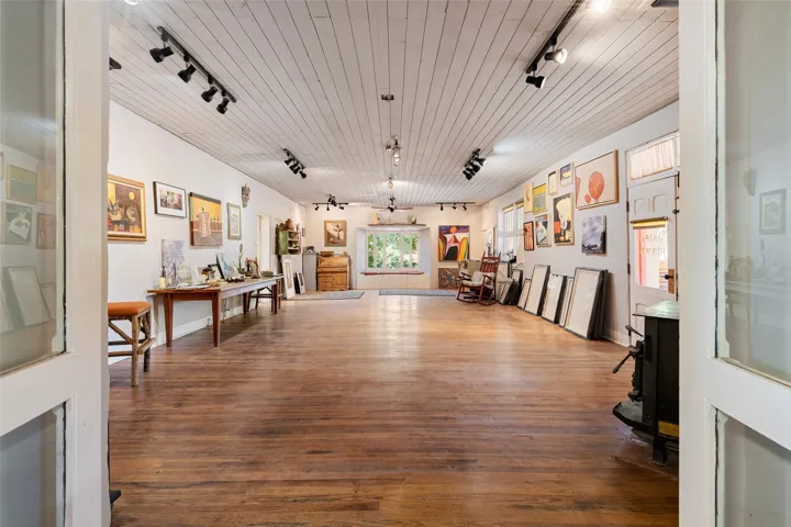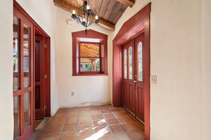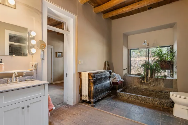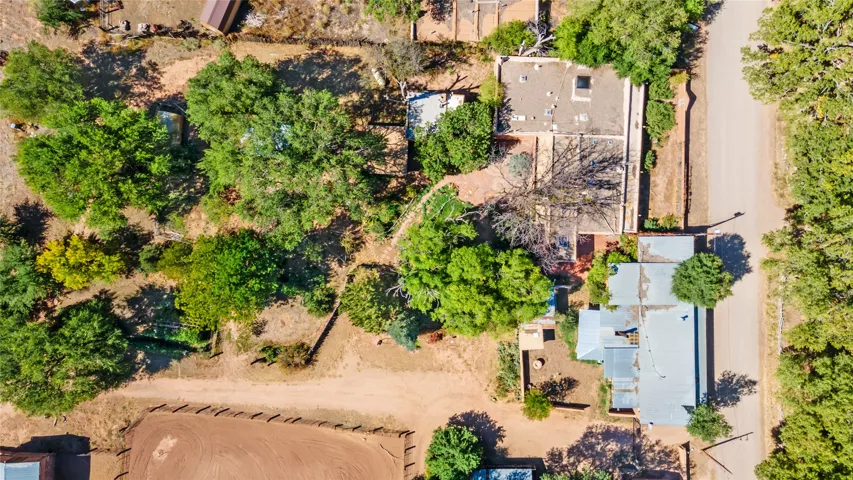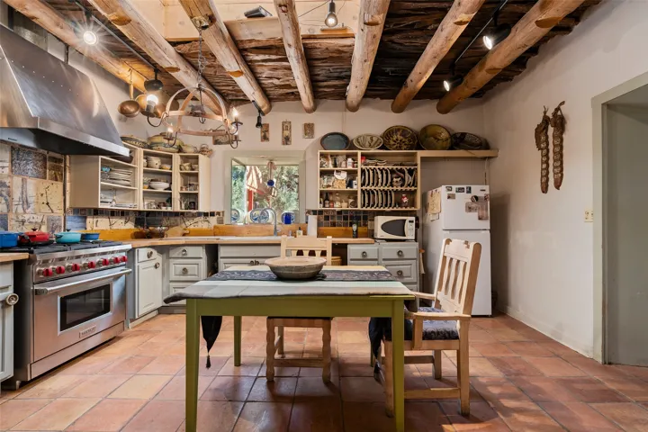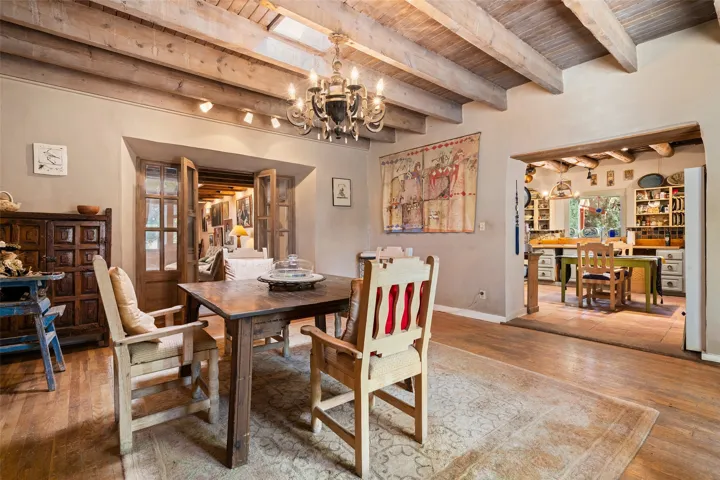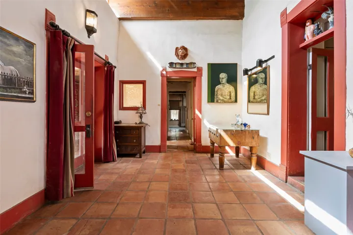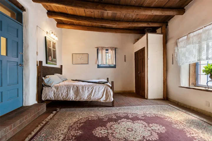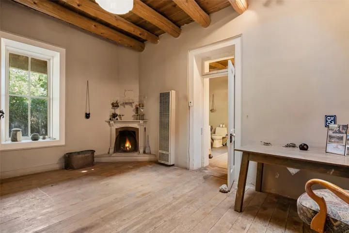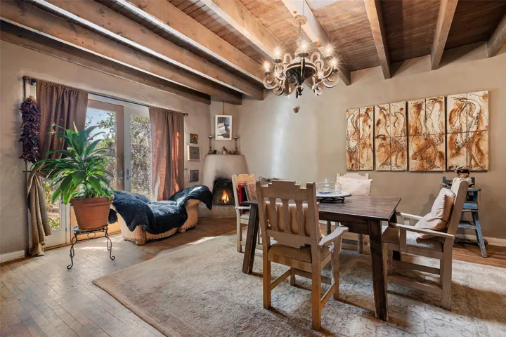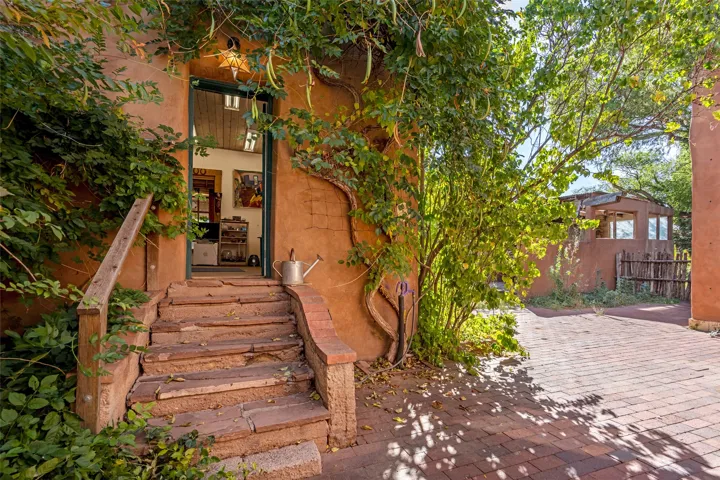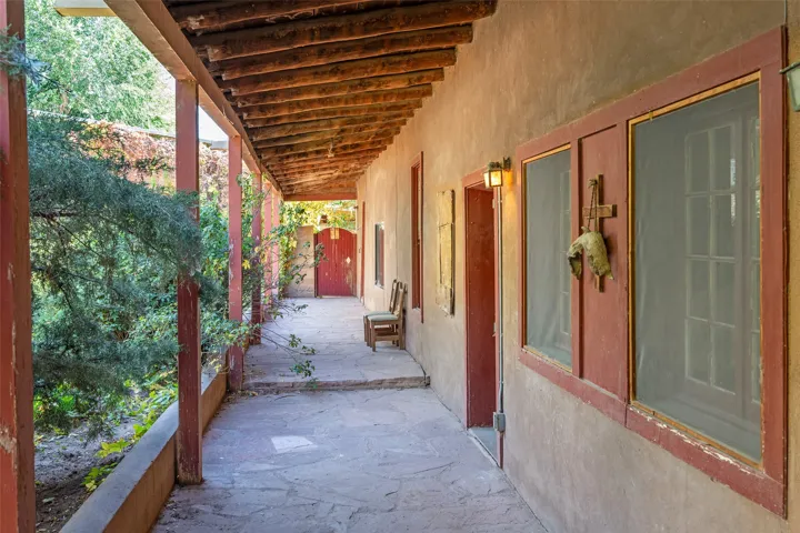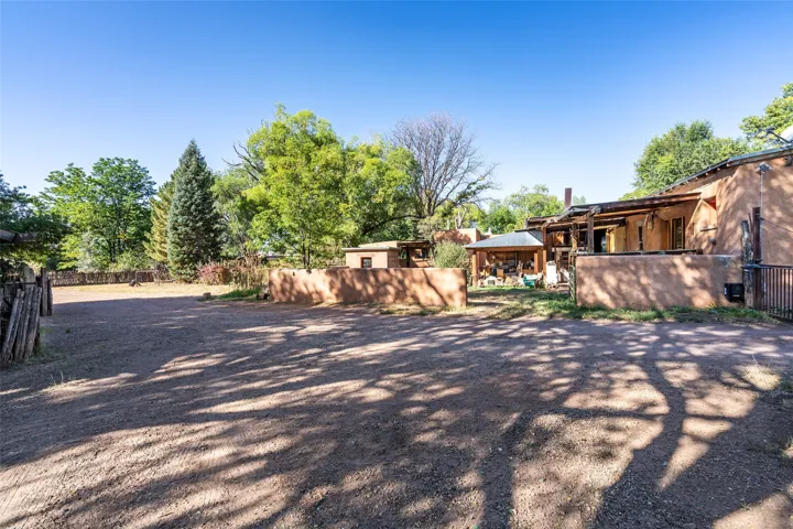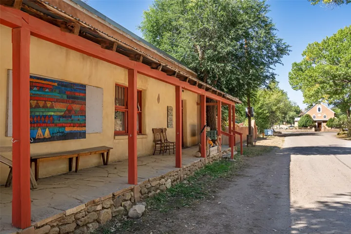 This historic Hacienda embodies the essence of old-world New Mexico charm and a true Galisteo history with the spirit of this old adobe reflecting the lore, legend and mystery of the Galisteo Basin. Beginning in the 1800s this was the Headquarters of Don Jose Ortiz y Pino’s sheep empire – a gathering place, a general store – and more recently, for several decades beginning in the late 1970s this was the home, studio and gallery of the award-winning potter and visual artist Priscilla Hoback, and a source of creative nurturing for the arts community. This iconic estate is nestled in the center of Galisteo Village, still with its vibrant art scene, and the long portal of the art gallery sits along a central road. Behind the gallery and studio is the large adobe main house, with its intimate and grand spaces. The hacienda is composed of two wings – one with a single bedroom and bathroom, the other with two bedrooms and two bathrooms. There is a large library, grand living room, formal dining room, several unique fireplaces and an array of charming details. The generous inner courtyard is an oasis of calm; the ancient willow tree casts shade on the koi pond, the gnarled old apricot tree frames the main doorway under a second large portal. This, combined with the central kitchen and spacious living room, create a home that is perfect for entertaining and large receptions. The property is verdant with a variety of mature trees, fruit trees and flower gardens. There are outbuildings for storage. So much potential and so many possibilities – come make YOUR history in Galisteo