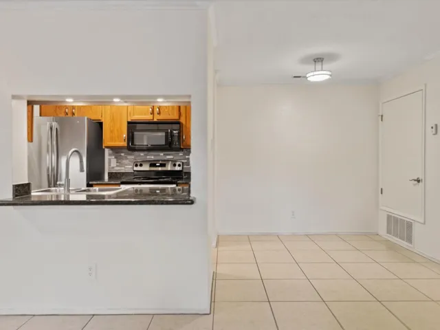 The adjacent dining area seamlessly connects to a partly enclosed kitchen, which is equipped with appliances. The kitchen has a granite countertop, dual sink, and ample cabinetry, providing plenty of storage space. A convenient laundry area with a washer and dryer is tucked within the kitchen for easy access.