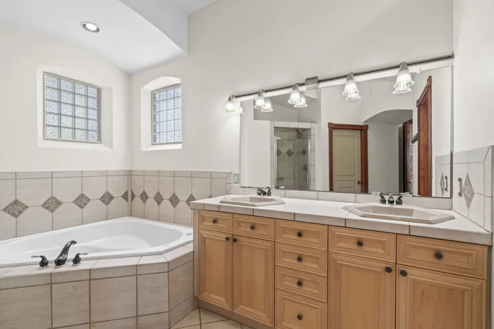 Welcome to this beautifully updated, single-story home, where comfort and style meet. With a freshly painted interior and a one-year-old roof with a ten-year warranty, this home offers peace of mind and modern elegance. The inviting floor plan features 3 spacious bedrooms, including a separate, luxurious primary suite that exudes warmth and charm. The primary bedroom boasts a stunning gas fireplace framed by a decorative rock wall, creating a cozy ambiance. Custom French doors lead to the tranquil retreat, while the expansive bath offers double sinks, a separate shower, a large triangular tub, and an organized, spacious closet.