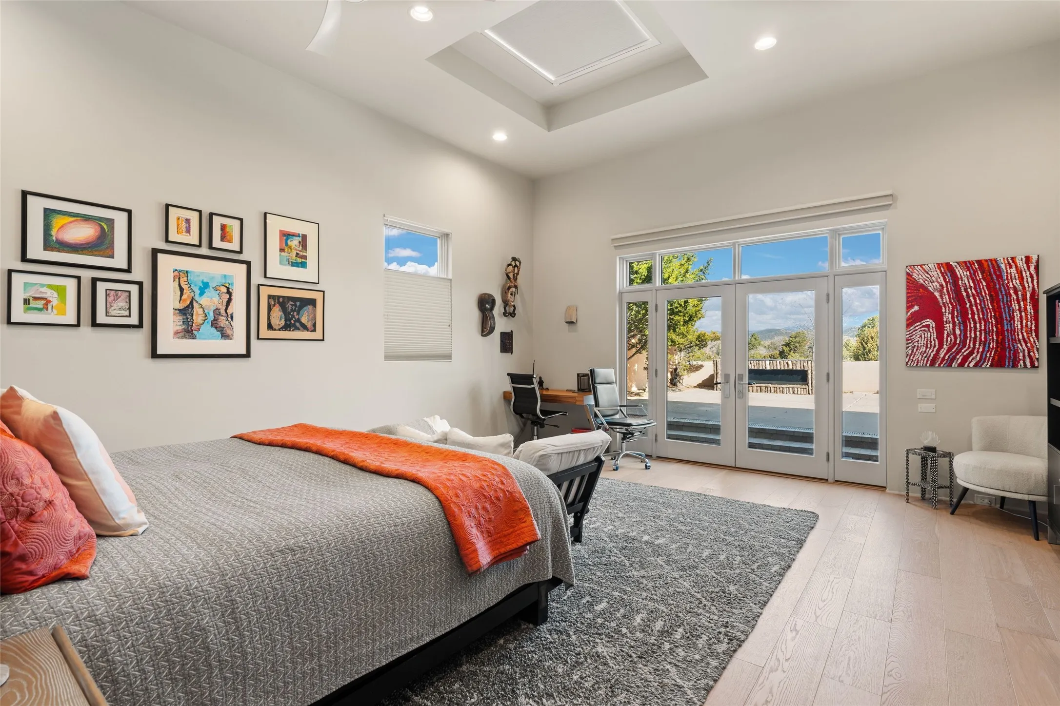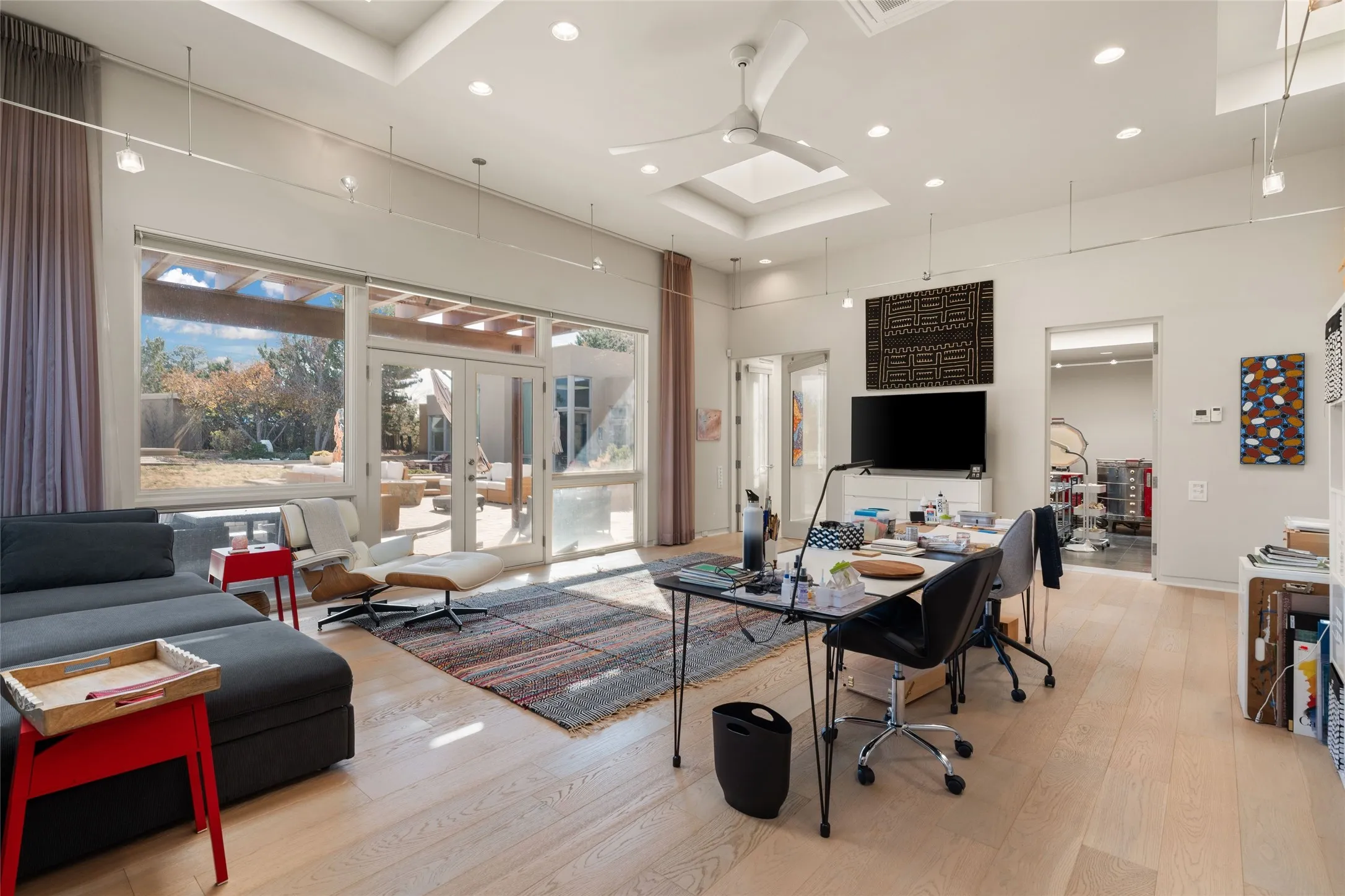 The next space in the north section of the house functions as a ceramics studio for the current owners, but could be a command-central home office sharing the attributes of the media room as well or an extended master closet. The great primary suite with views and volume, is cloistered away from the rest of the home for privacy and quiet and is serviced by a brand new bathroom.