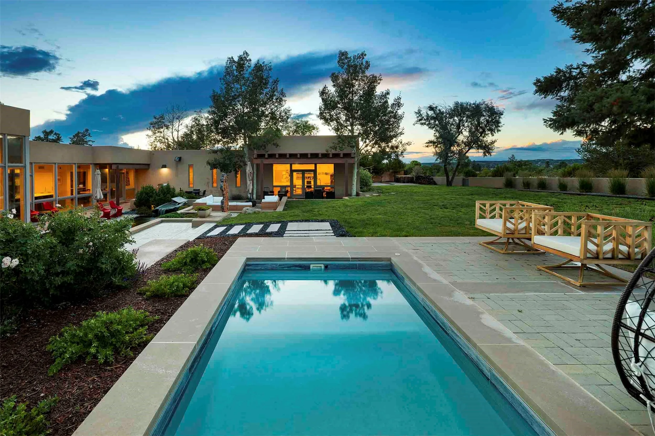 Remarkable. To be on Old Santa Fe Trail with majestic, panoramic views overlooking dedicated open space towards the Sangre de Cristo Mountains in a one-level, light filled Contemporary Masterpiece that had a major renovations done in 2021 is a singular opportunity. The home features a gleaming new kitchen, spectacular new baths in the main suites, expansive open spaces and your own private resort in the backyard.