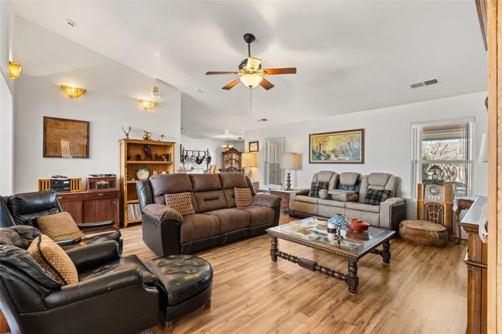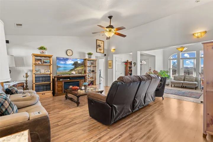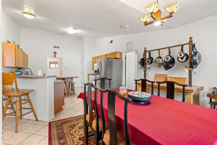 This lovely modern home boasts a beautiful, private setting in rural Chimayo with an orchard behind and pastures in front opening onto spectacular views of the barrancas and Sangre de Cristo Mountains. Enjoy clean, bright, open spaces inside with three bedrooms and 2 bathrooms. Outside an enclosed courtyard has covered portal and patio. The property has a finished attached garage, a carport and a detached garage along with a storage building. Perfect for the car enthusiast. Private Well and Surface water rights for your orchard and gardens. The location is quiet, far from the traffic and yet only 35 minutes from Santa Fe. A short distance to the Chimayo weaving and art galleries and the Santuario. Plenty of outdoor activities in the area include hiking, snow skiing, biking, fishing, rafting and horseback riding.