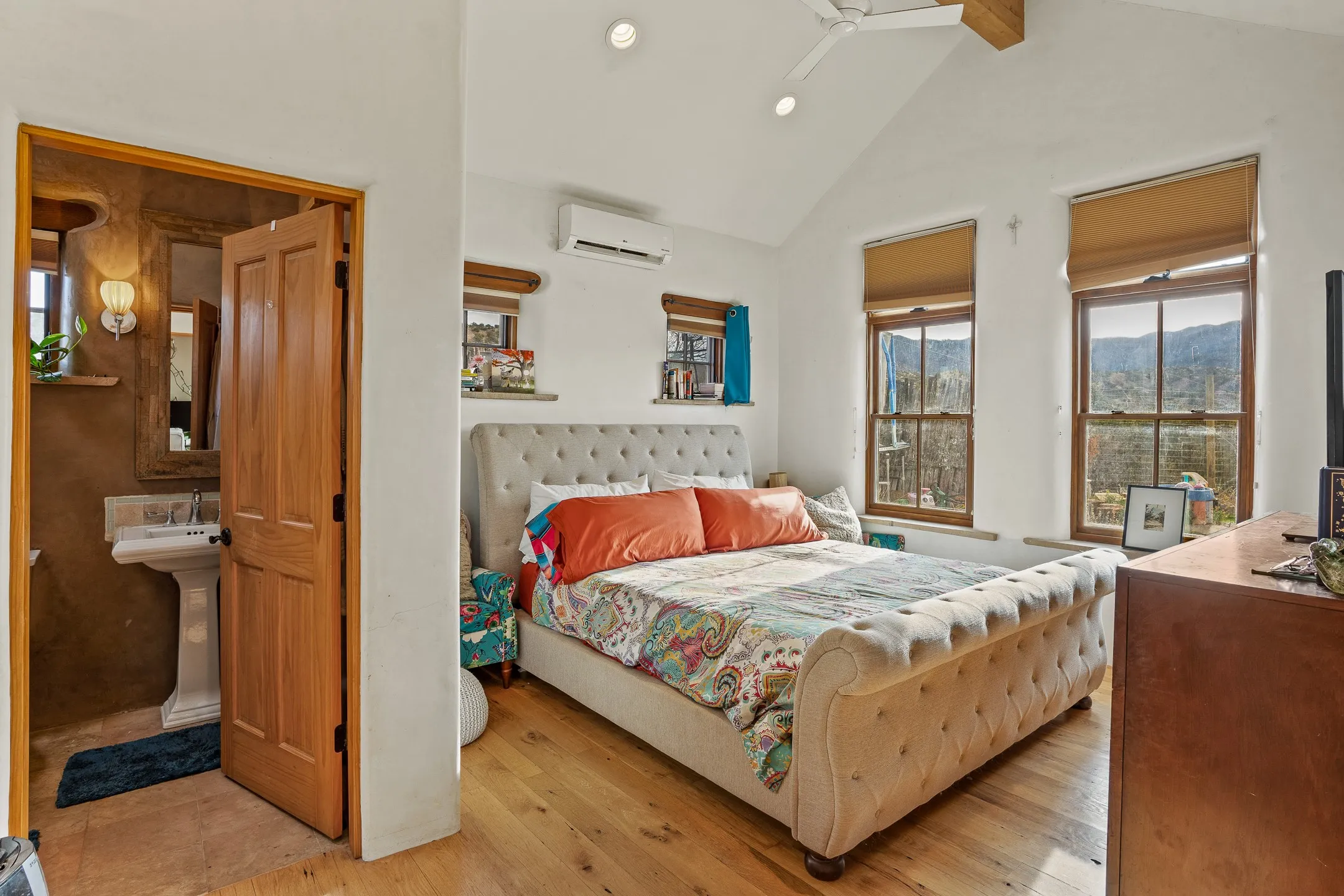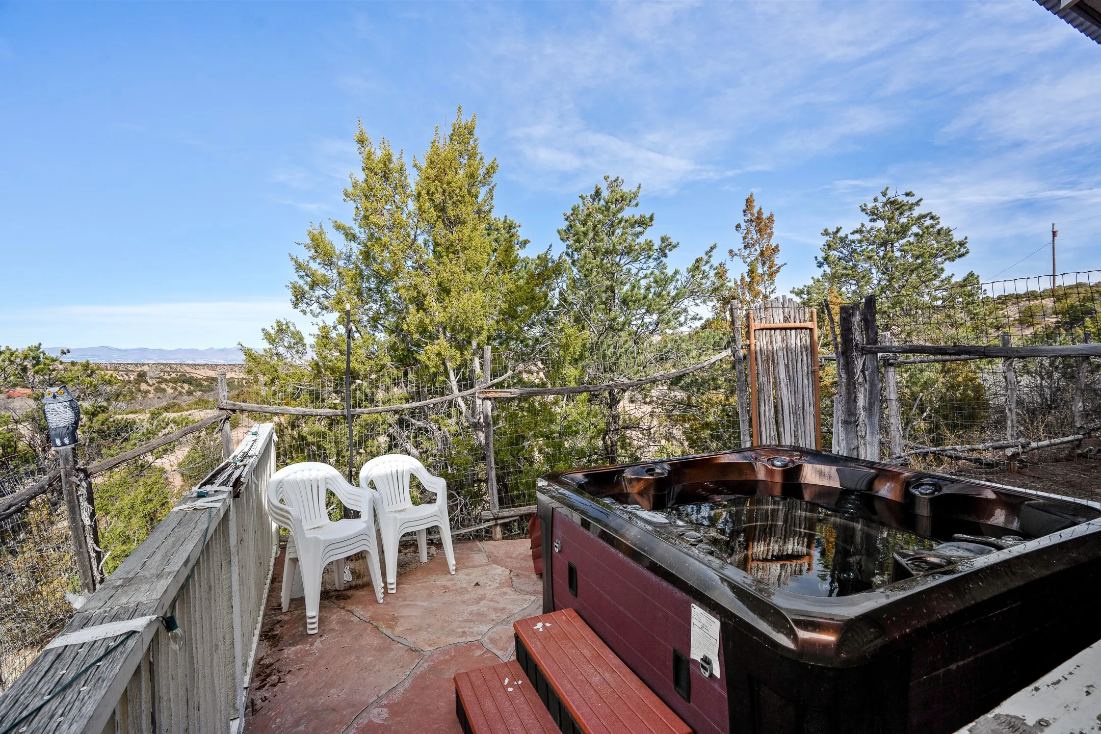 Just Appraised! Perched amid the enchanting landscape of Chupadero, this rare 1.82 acre sanctuary offers an authentic Northern New Mexican lifestyle with breathtaking views. The adobe main residence (1,500+ sq ft) features curved plaster walls, kiva fireplace, vaulted ceilings with vigas and beams, and flagstone window seals. This 3-bedroom, 2-bath home showcases artisanal craftsmanship. The primary suite includes a walk-in closet and spa-like bathroom with rock shower. The guest bath features a clawfoot tub. Recent upgrades include new appliances, tankless water heater, water filtration system, mini-splits, and solar installation. The property offers an office space and loft area. Outdoor features include multiple portals, a hot tub, artificial turf and a dog run. The second property offers excellent investment potential. Enjoy modern conveniences while surrounded by natural beauty. Google maps shows this property as: 75A Camino Chupadero