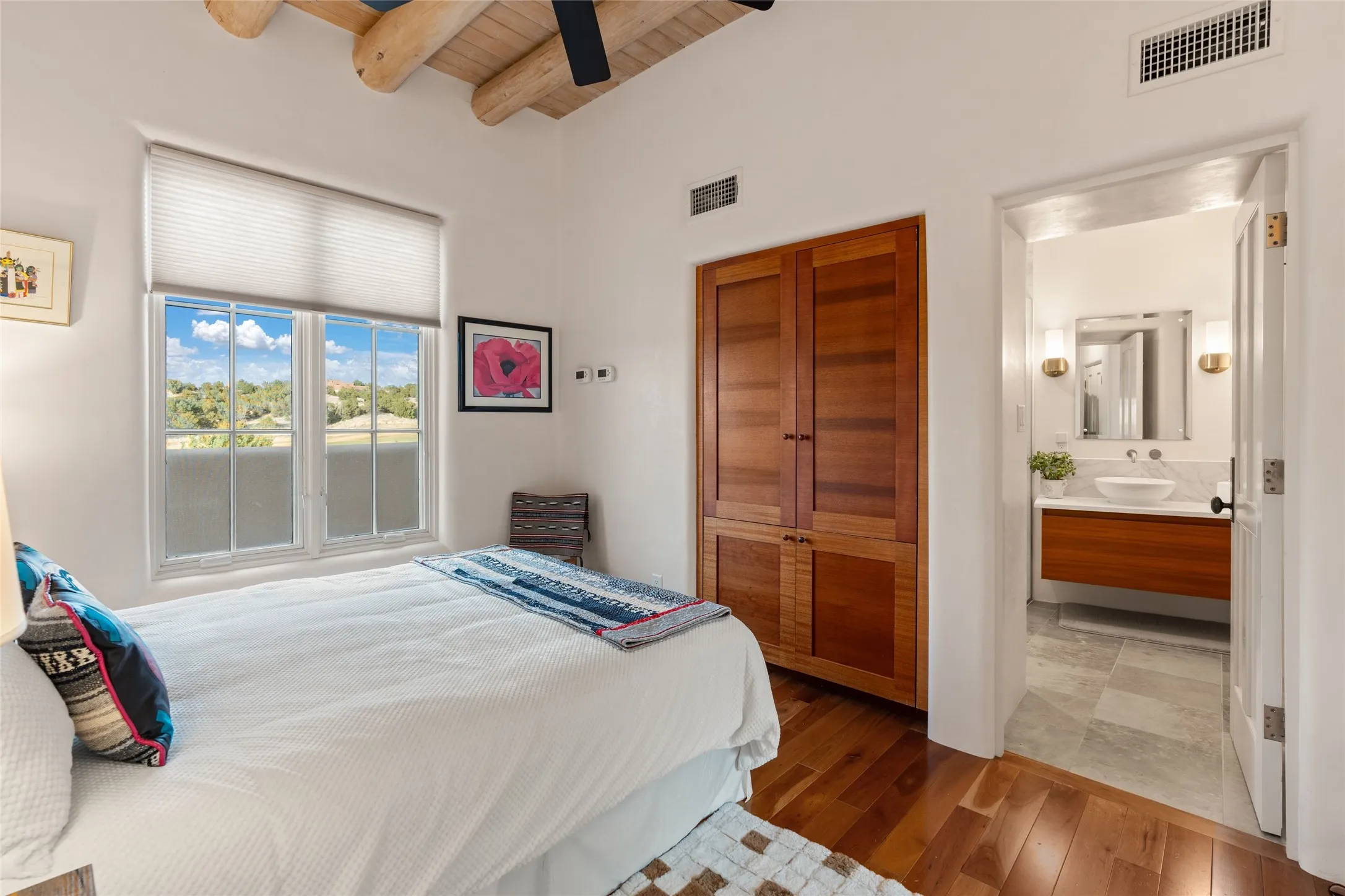 Panoramic Golf Course & Sangre de Cristo Mountain views are yours at this Soft Contemporary Masterpiece in Gated Las Campanas w 3 Bedrooms + Office + Media + 3-1/2 Baths, including a Guest House & 3-Car Garage & 6 Fireplaces. Spacious Living Room features a distinctive fireplace, wet bar & access to the back portal thru 4 glass doors that vanish into the wall, creating a 16-foot opening to the view. The Dining Room has space for 8 & a Chandelier of 6 stunning glass sculptures. The impressive Media Room has 11.2 sound system, refrigerator & reclining sectional couch. Gourmet Kitchen is designed for effortless meal preparation, w Wolf gas range/oven, Vent-a-Hood, Sub-Zero Refrigerator, double dishwasher + 4’ x 9’ island w prep sink & Insta-Hot water. The cozy Kitchen Nook has a wood-burning fireplace, room for casual dining + 2 lounge chairs.. The Main Bedroom Suite has a wood-burning fireplace, walk-in shower, 16-foot closet & & jetted tub w golf course view. Bedroom 2 is in a separate wing, located near the Den/Office. The free-standing Guest House offers the ultimate in privacy, w a Kitchen, Living area, Bedroom & washer/dryer. This Exquisite Residence has it All – 3 Bedrooms, Office, Media, 3-car garage, free-standing Guest House & recent major Stucco maintenance & GACO Roof Coating..The Outdoor Amenities make it a self-contained resort – Synthetic Putting Green, Fire Pit, Portal for the BBQ plus Golf & Mountain Views – Live the Resort Lifestyle in Las Campanas!