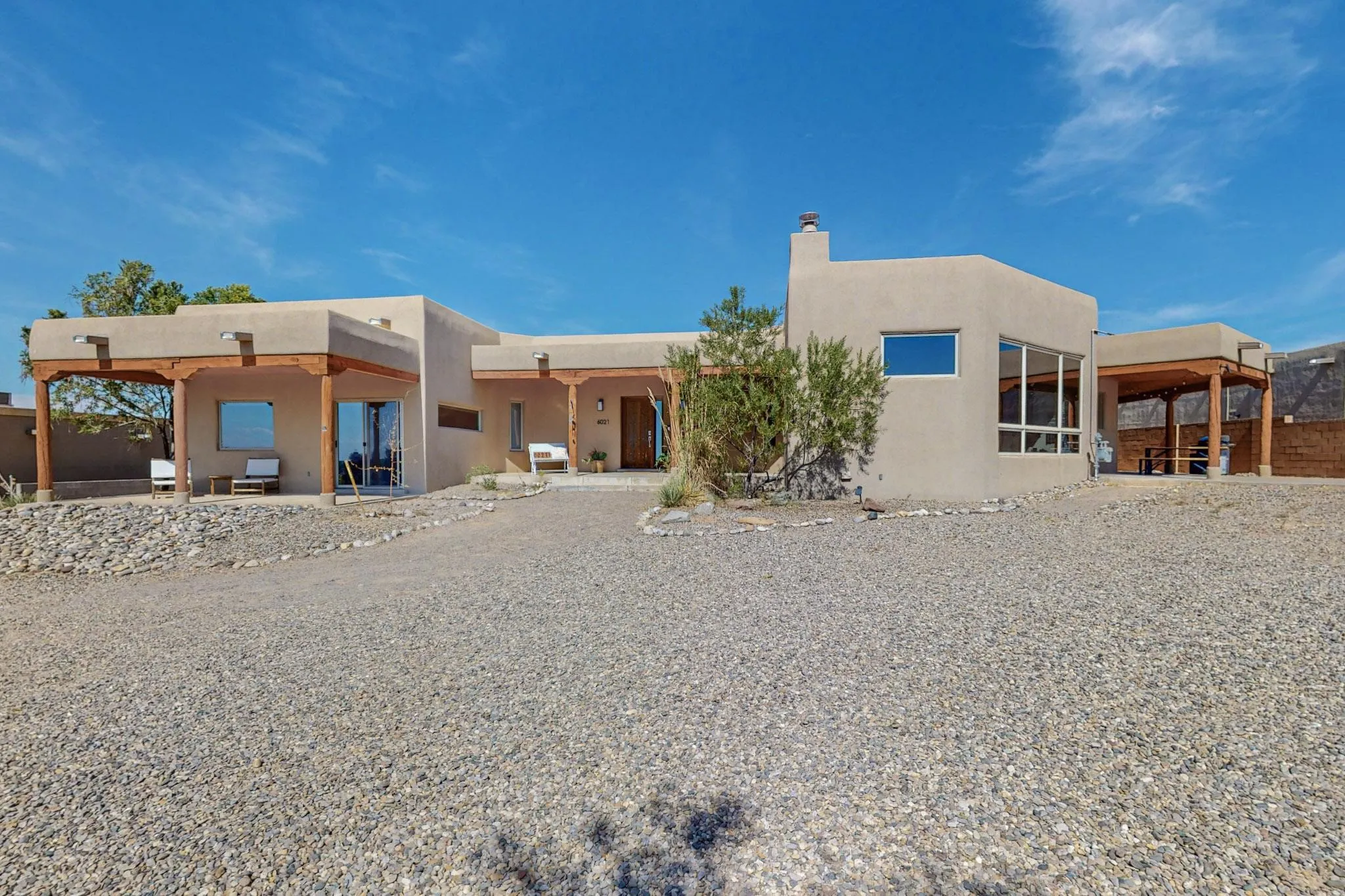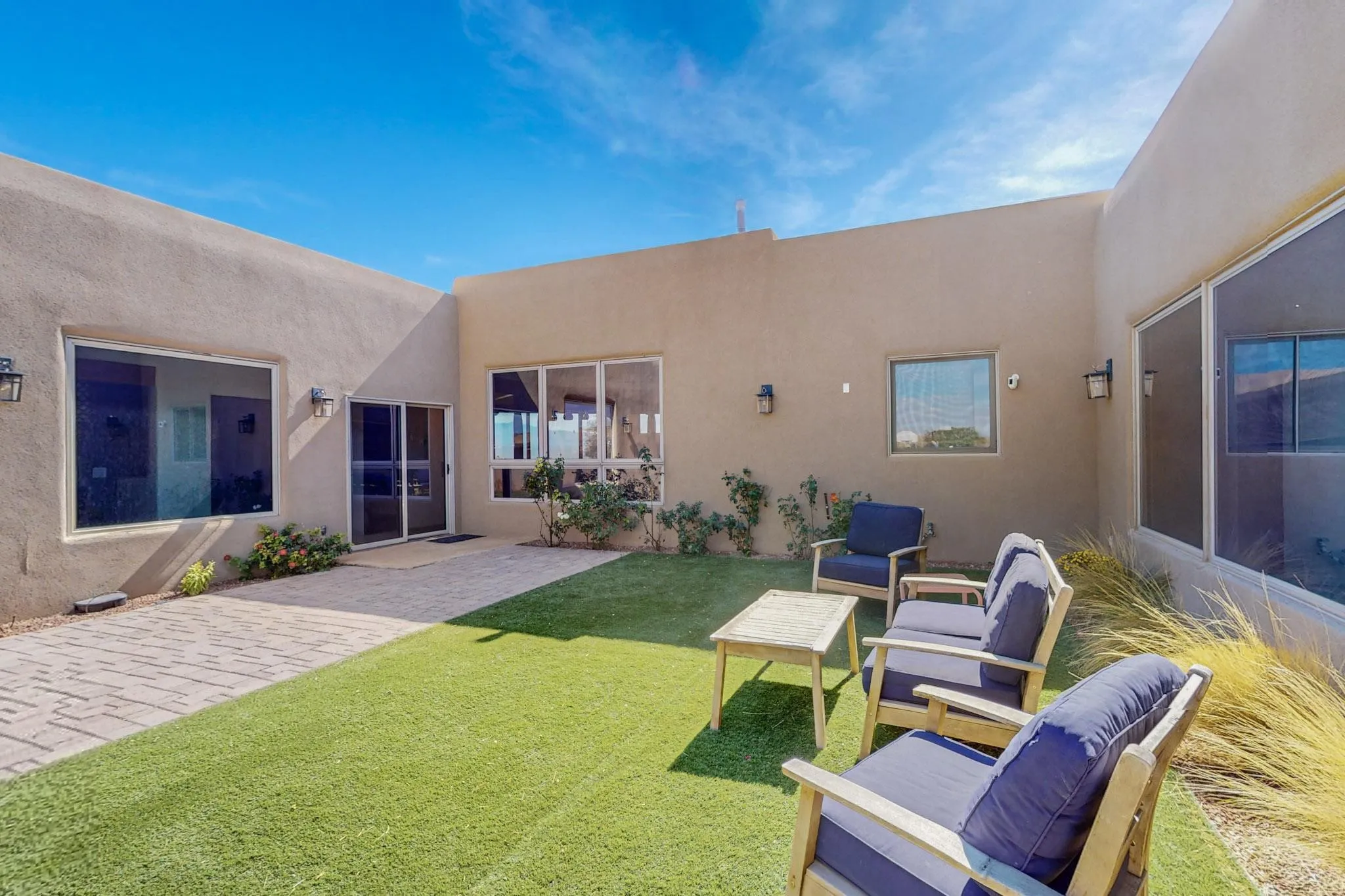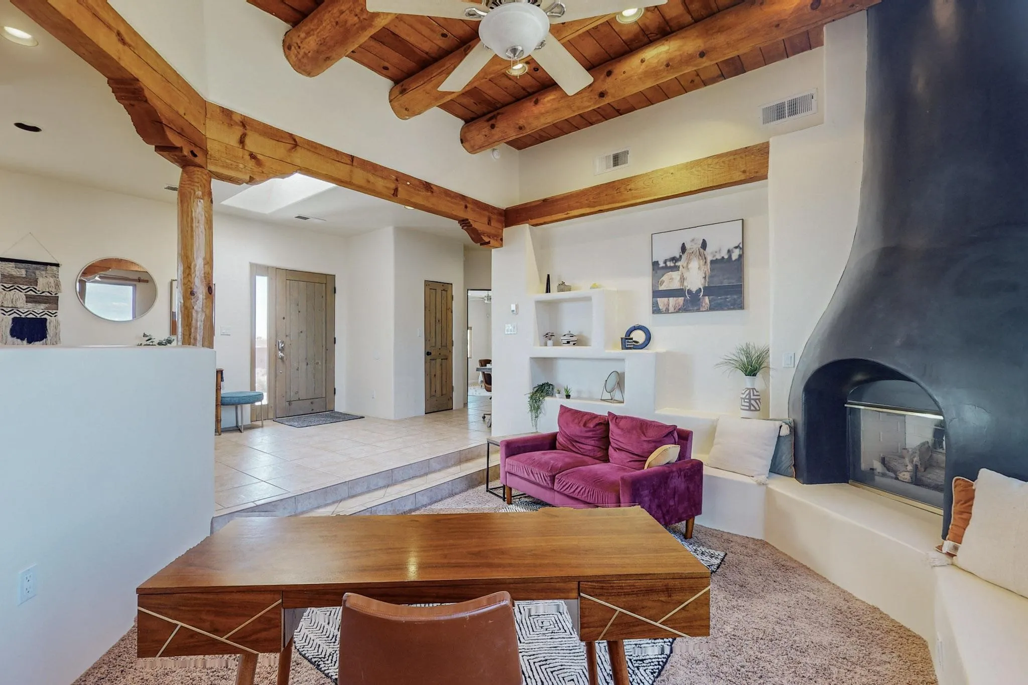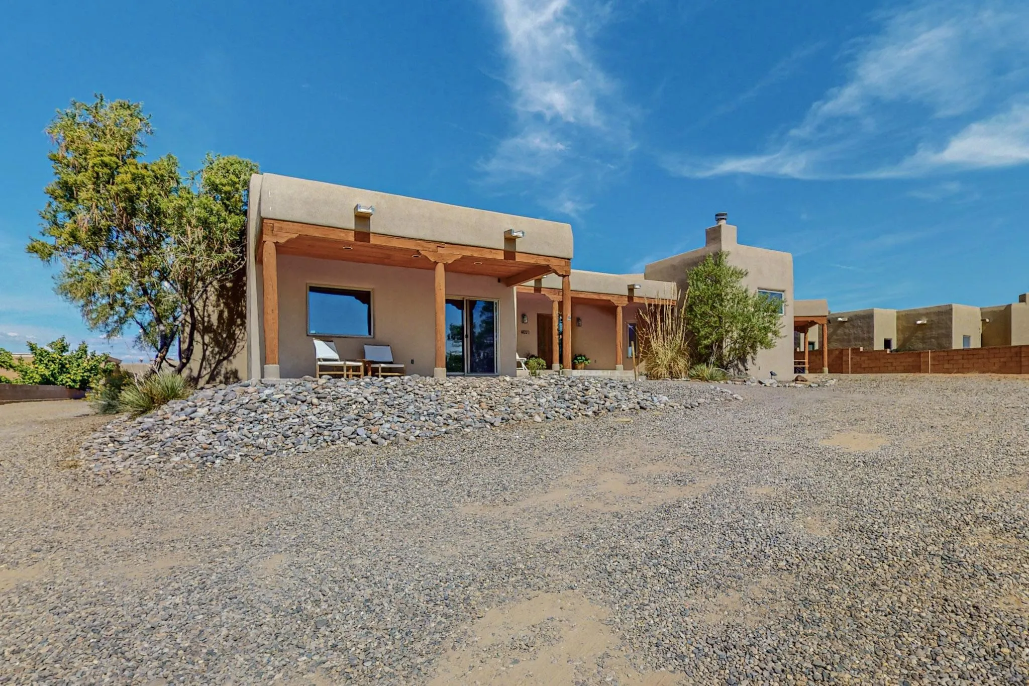 SW Luxury Living Where Style, Sustainability & Adventure Meet: Priced below appraised value – Ask your Broker for more info. Step into this one-of-a-kind architectural masterpiece designed w/open floorplan that brings the breathtaking SW views into every corner of your home. Whether you’re relaxing at the hearth of the kiva or cooking up something tasty in the kitchen, every angle connects you to something extraordinary. Surrounded by portals with beautiful tongue & groove ceilings, you’ll discover multiple gathering spots ideal for morning coffee or evening cocktails. At the center of the home lies a private 600+ sqft courtyard, an oasis perfect for anything from stargazing to sunbathing. Retreat to your luxurious master featuring a spa-style ensuite with soaking tub, separate shower, double vanity, & a massive walk-in closet designed to fit your active lifestyle.