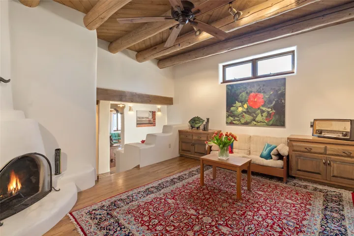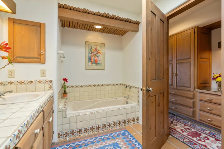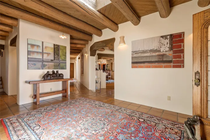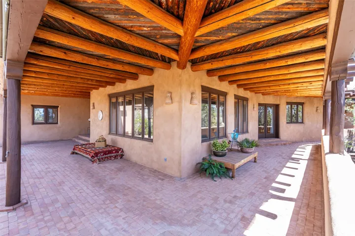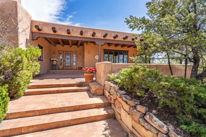 Located in the prestigious gated community of Los Caminitos in Tesuque, New Mexico, 61 Calle Encanto is a spacious residence that offers both comfort and tranquility sited on 8+ acres of scenic land. Traditional Santa Fe features are abundant. The property boasts panoramic views of the Jemez and distant mountain ranges, as well as the Santa Fe Opera house, providing a backdrop of natural beauty that enhances its peaceful, private setting. Sunrises, sunsets, and starry nights will delight. This gracious four-bedroom, five bath home features two primary suites and a private guest wing – thoughtfully separated from the main living areas. The floor plan offers privacy for all and generous living spaces. Additionally, there is an inviting den/library with ample shelves and a cozy fireplace. Another of the home’s highlights is its large wrap-around portal, offering shaded spaces for enjoying the serene environment and views or hosting gatherings. The mature landscaping complements the property’s natural surroundings. In addition to the property’s private amenities, residents of Los Caminitos have access to an inviting clubhouse, with a pool, tennis court, and pickleball court ā adding to the lifestyle appeal.