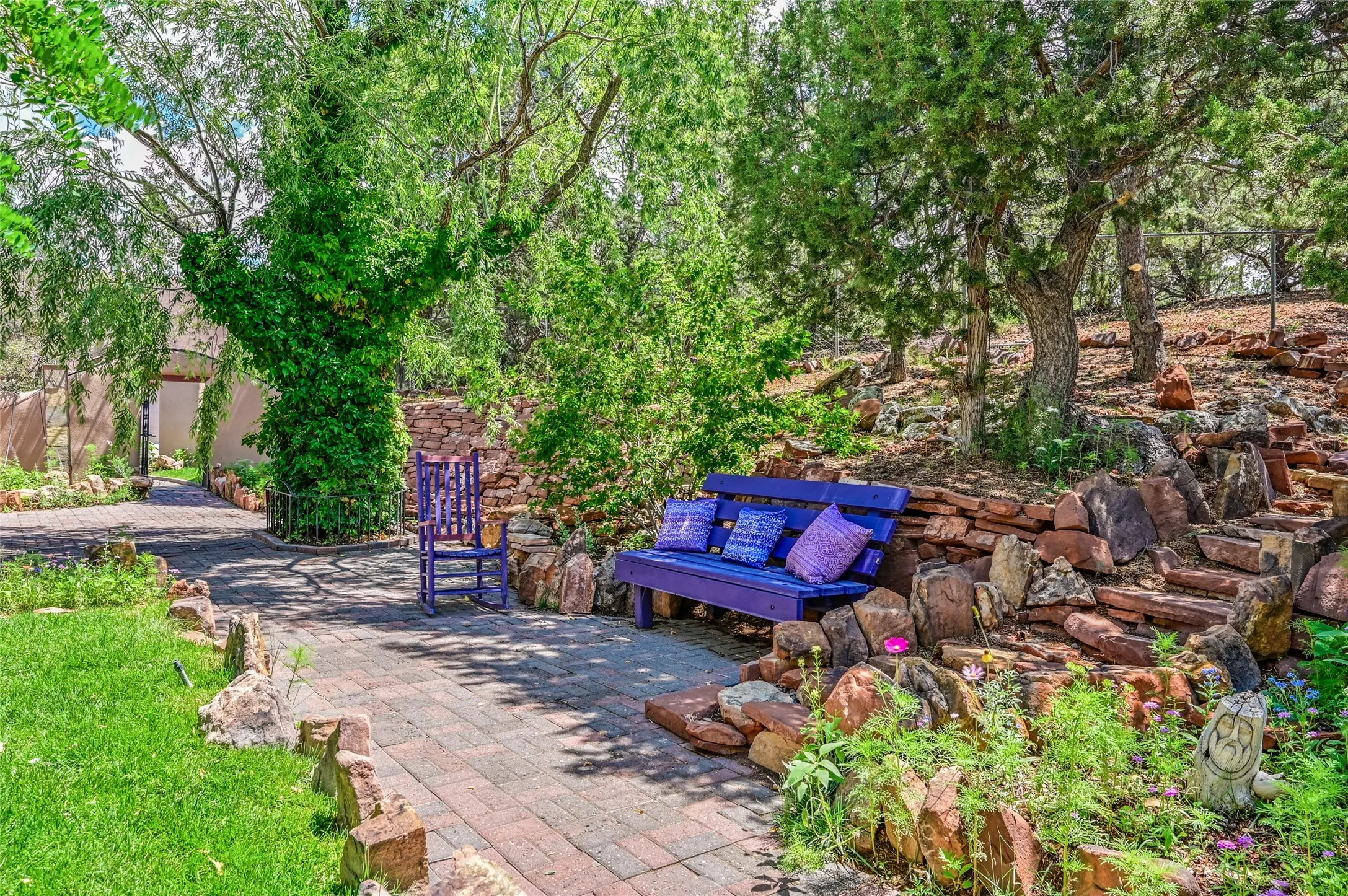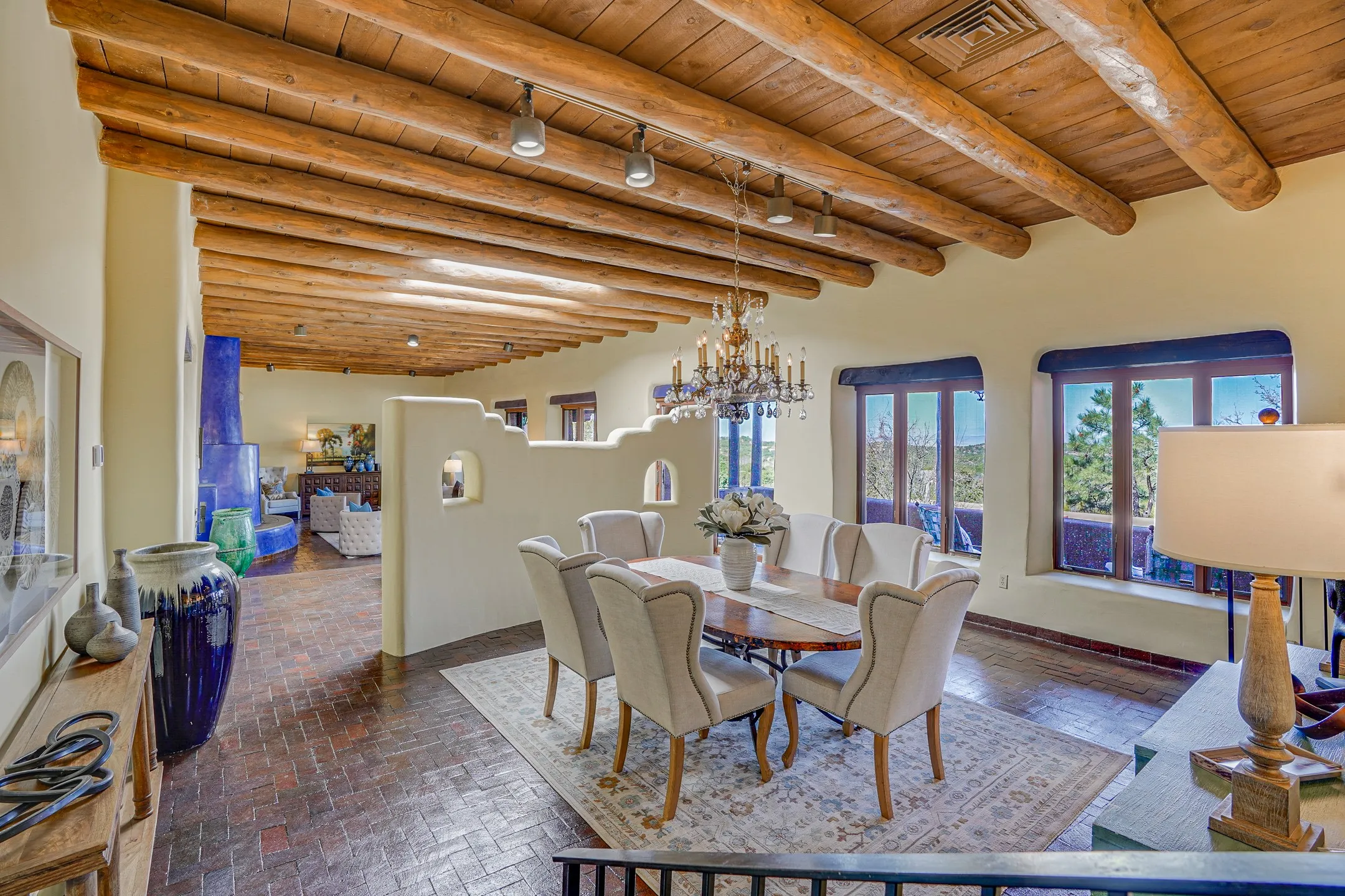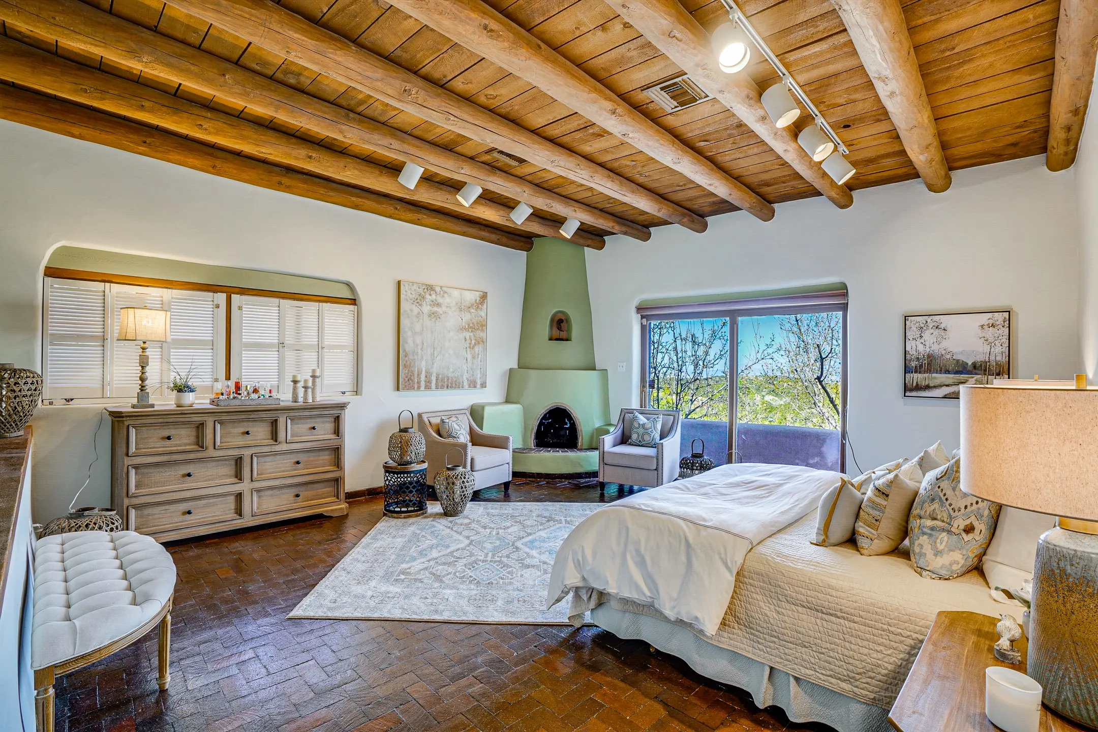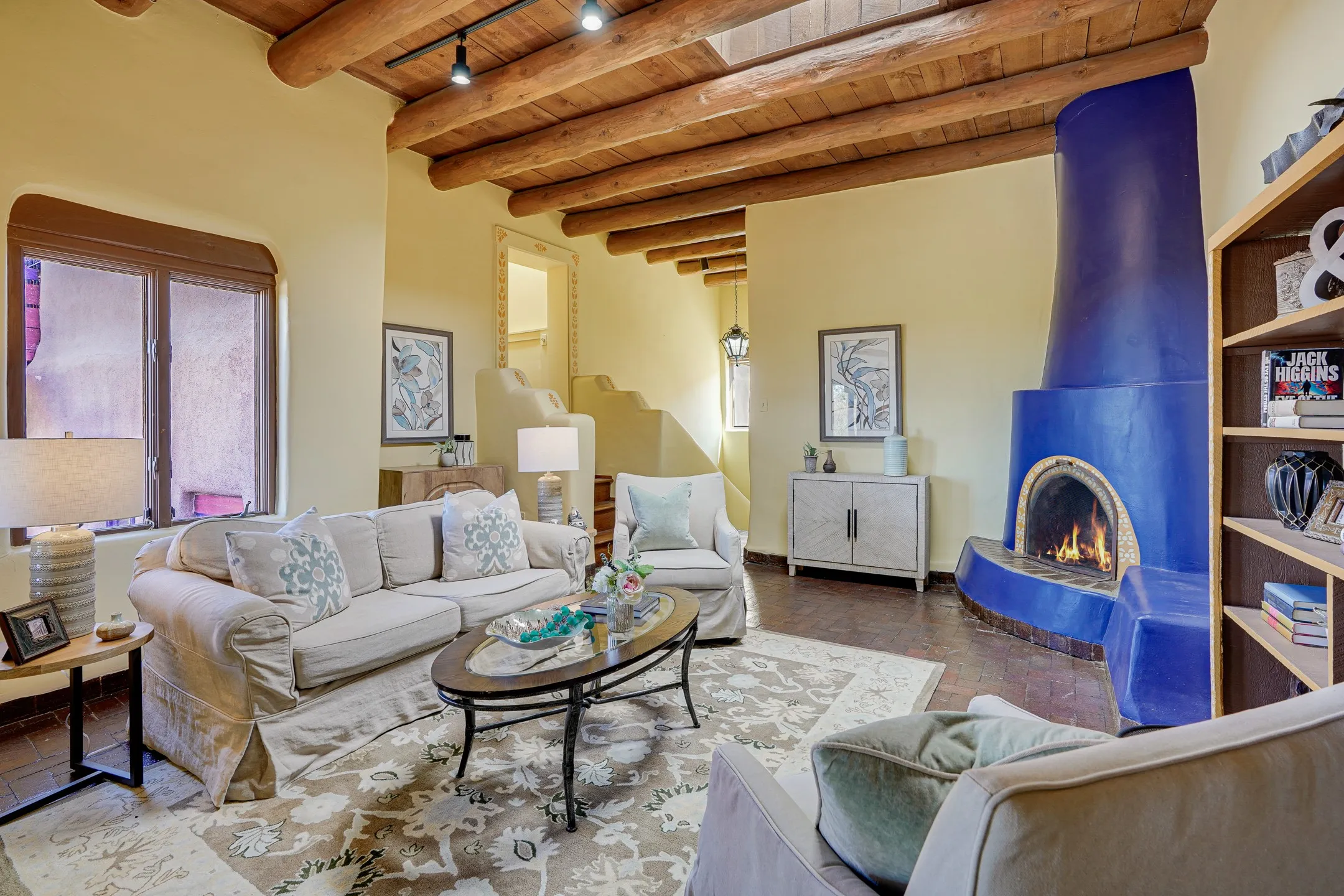 The main residence features a grand living and entertaining space adorned with multiple cozy kiva fireplaces, high viga accented ceilings, brick floors, iron work, colorful floral wall motifs, and traditional craftsmanship. Many recent practical improvements to the roof, exterior, and systems have also been made.Four spacious bedrooms make this a comfortable retreat for full-time living or hosting of guests. Not to be missed is the spacious, upstairs artistās retreat with panoramic views – the perfect place to paint, work, write, and create! The primary suite is private and appointed with a large ensuite bathroom, access to the enclosed in-ground spa, patio access, and sweeping sightlines across the high desert landscape. The grounds are equally serene with water features and fountains, multiple garden beds, and private patio enclaves. A long western-facing, covered portal, spanning the length of the main living room is the perfect outdoor extension to the main homeās grand indoor living. A detached 1BD-1BA guest house, with its own garage, offers privacy and comfort for visitors, family or invites the potential for rental generating income. Whether youāre soaking in the golden hour light from one of the many outdoor living spaces or relaxing by one of the propertyās four fireplaces, this one-of-a-kind property offers an unparalleled canvas equipped with undeniable tranquility, vistas and convenience to Santa Feās exquisite destinations.