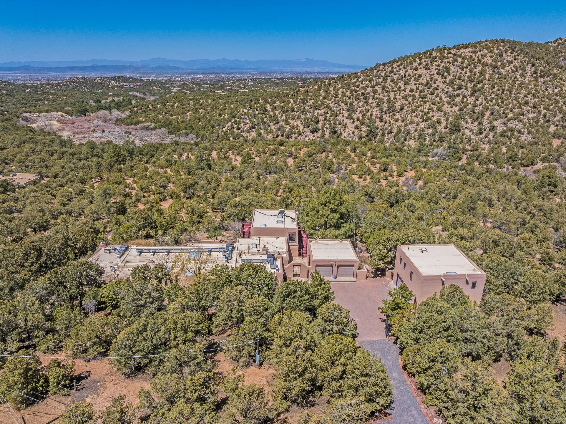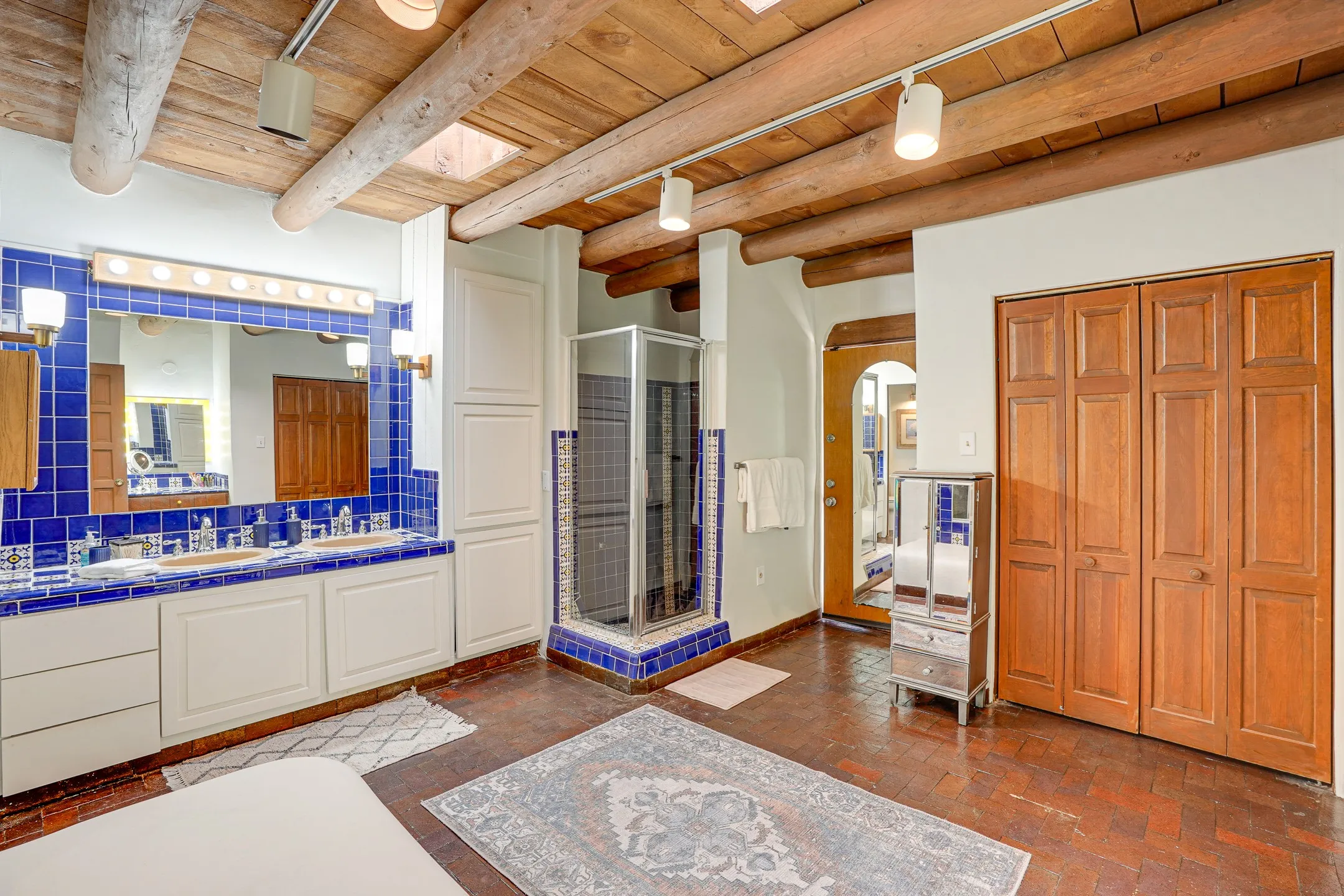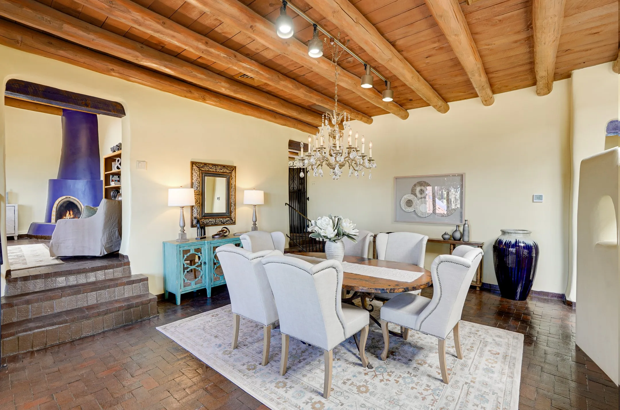 The main residence features a grand living and entertaining space adorned with multiple cozy kiva fireplaces, high viga accented ceilings, brick floors, iron work, colorful floral wall motifs, and traditional craftsmanship. Many recent practical improvements to the roof, exterior, and systems have also been made.Four spacious bedrooms make this a comfortable retreat for full-time living or hosting of guests. Not to be missed is the spacious, upstairs artistās retreat with panoramic views – the perfect place to paint, work, write, and create! The primary suite is private and appointed with a large ensuite bathroom, access to the enclosed in-ground spa, patio access, and sweeping sightlines across the high desert landscape. The grounds are equally serene with water features and fountains, multiple garden beds, and private patio enclaves. A long western-facing, covered portal, spanning the length of the main living room is the perfect outdoor extension to the main homeās grand indoor living. A detached 1BD-1BA guest house, with its own garage, offers privacy and comfort for visitors, family or invites the potential for rental generating income. Whether youāre soaking in the golden hour light from one of the many outdoor living spaces or relaxing by one of the propertyās four fireplaces, this one-of-a-kind property offers an unparalleled canvas equipped with undeniable tranquility, vistas and convenience to Santa Feās exquisite destinations.