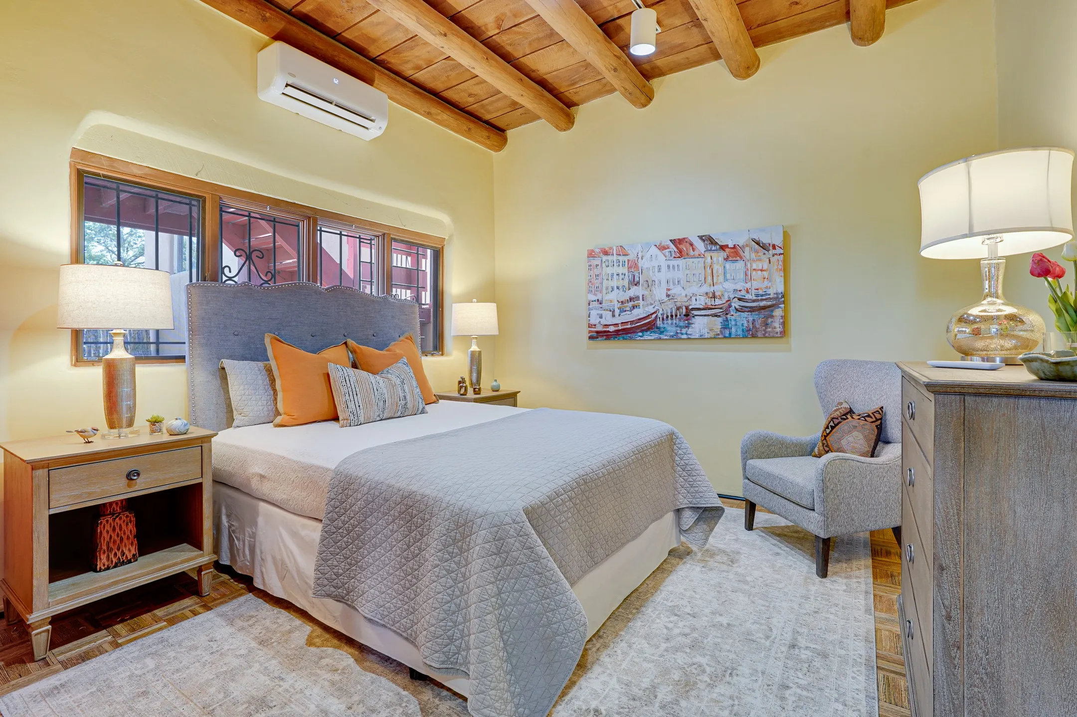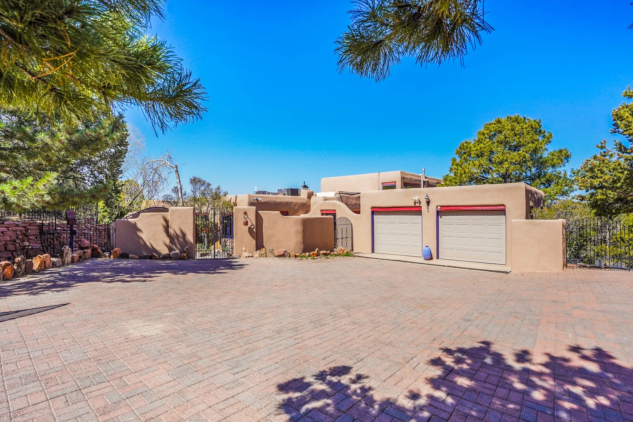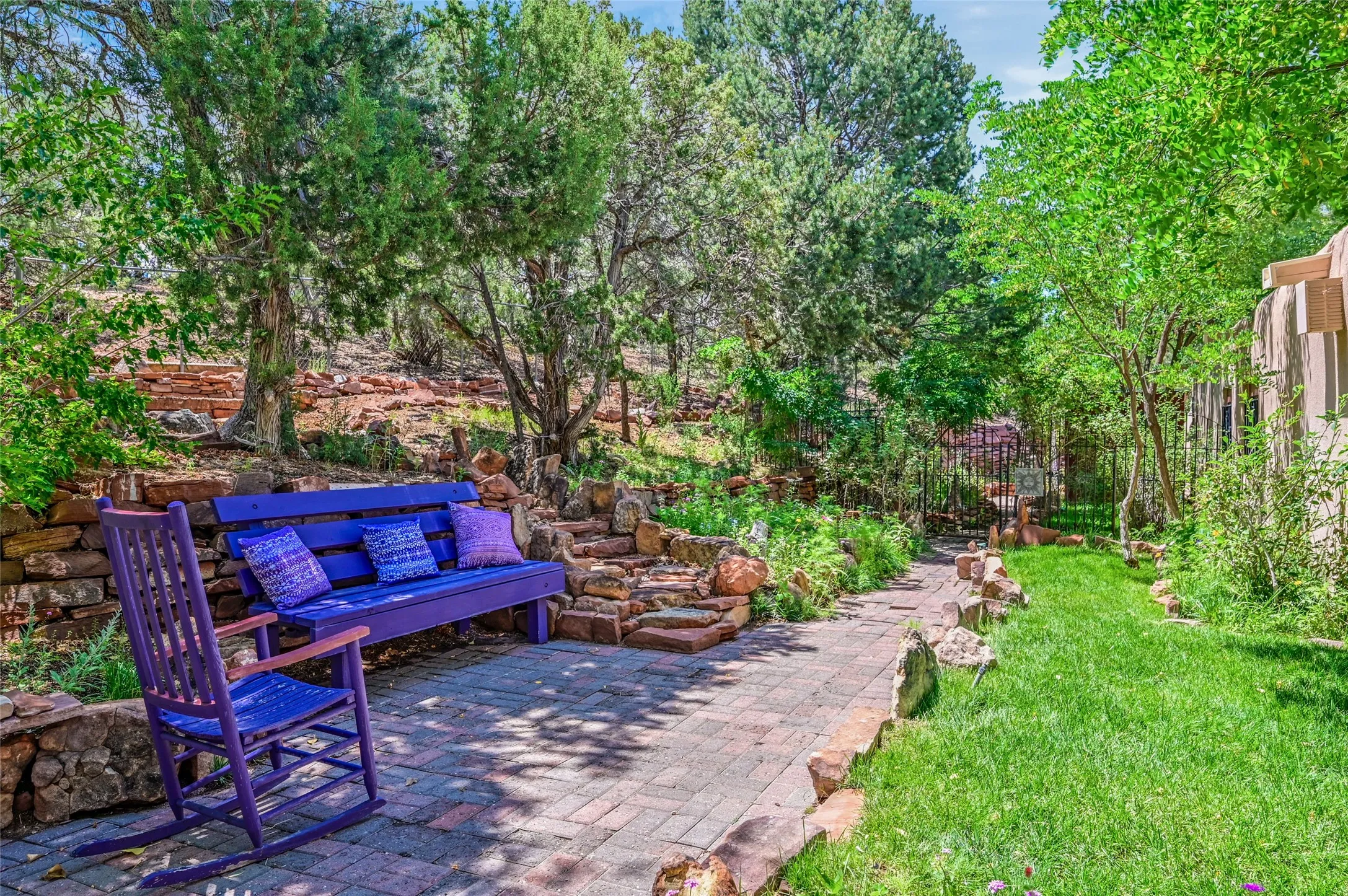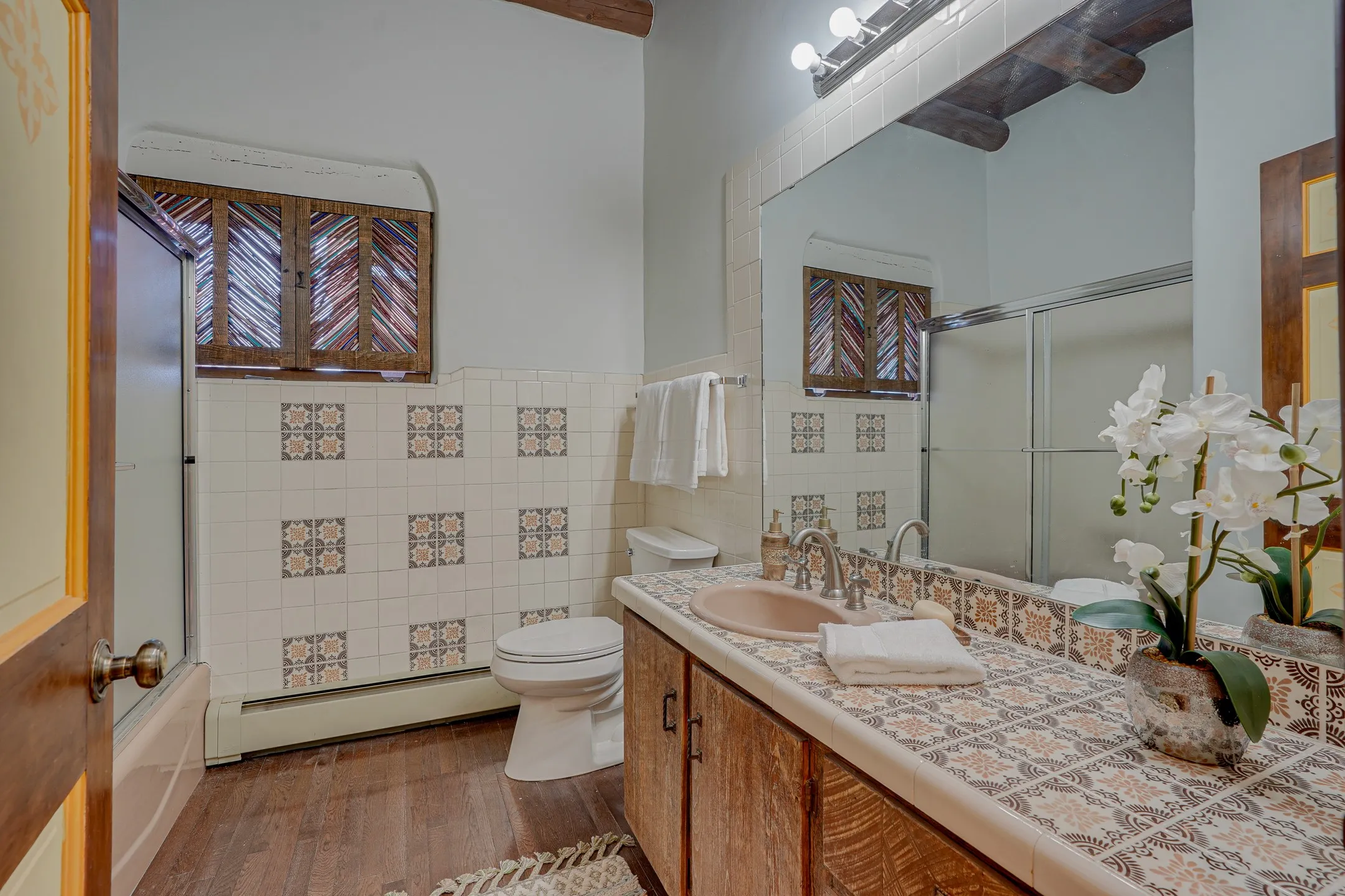 The main residence features a grand living and entertaining space adorned with multiple cozy kiva fireplaces, high viga accented ceilings, brick floors, iron work, colorful floral wall motifs, and traditional craftsmanship. Many recent practical improvements to the roof, exterior, and systems have also been made.Four spacious bedrooms make this a comfortable retreat for full-time living or hosting of guests. Not to be missed is the spacious, upstairs artistās retreat with panoramic views – the perfect place to paint, work, write, and create! The primary suite is private and appointed with a large ensuite bathroom, access to the enclosed in-ground spa, patio access, and sweeping sightlines across the high desert landscape. The grounds are equally serene with water features and fountains, multiple garden beds, and private patio enclaves. A long western-facing, covered portal, spanning the length of the main living room is the perfect outdoor extension to the main homeās grand indoor living. A detached 1BD-1BA guest house, with its own garage, offers privacy and comfort for visitors, family or invites the potential for rental generating income. Whether youāre soaking in the golden hour light from one of the many outdoor living spaces or relaxing by one of the propertyās four fireplaces, this one-of-a-kind property offers an unparalleled canvas equipped with undeniable tranquility, vistas and convenience to Santa Feās exquisite destinations.