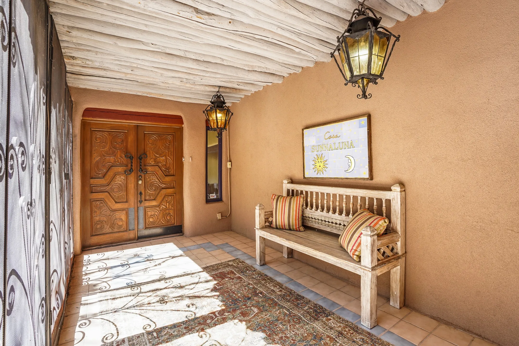 CASA SUNNA LUNA. Nestled just minutes off of the historic Old Santa Fe Trail and only 15 minutes from the heart of downtown Santa Fe, this adobe estate captures the essence of classic Southwestern elegance and modern comfort. Set on 5-acres, the property offers total privacy and breathtaking panoramic vistas of the Jemez Mountains and Santa Fe city lights.