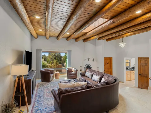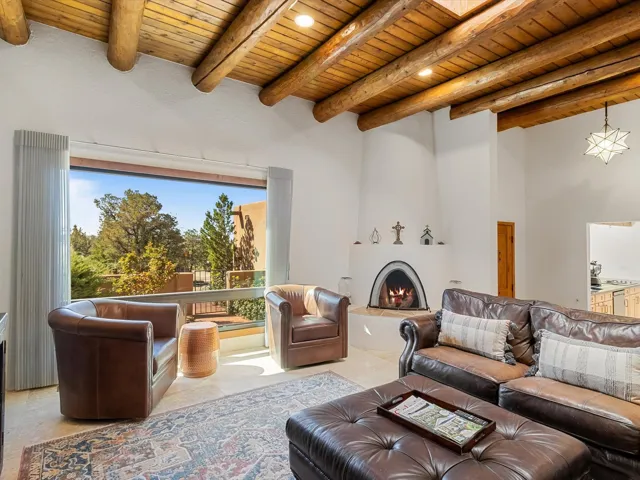 Spanning over 2,000 square feet, the home offers a welcoming floor plan filled with natural light and thoughtful design. The living room features soaring ceilings with classic vigas and a cozy kiva fireplace, seamlessly connecting to a formal dining area and a generous eat-in kitchen with a bright breakfast nookāperfect for entertaining or everyday living. Use one of the bedrooms as a dedicated office/study to provide ideal space for remote work or a quiet retreat, while the split-bedroom layout ensures privacy and comfort for both residents and guests.