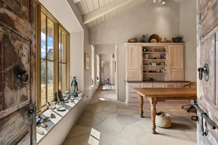 An extraordinary opportunity to embrace a luxurious, self-sustaining lifestyle in this Northern New Mexico farmhouse within the gated community of Tesuque Villas. This single-level home with guesthouse is designed for off-grid potential including: a solar photovoltaic electric system, and backup generator, rainwater harvesting, private well, 10,000-gallon underground water storage tank, and 3,000-gal propane storage. Designed as a healthy home with consulting architect Paula Baker-Laporte. Inside the main home, the kitchen is equipped with a built-in Subzero refrigerator and freezer, Wolf six-burner gas stove, and Bosch dishwasher. The attached butlerās pantry provides Wolf appliances including double ovens, steam oven, Miele coffee cappuccino maker, second Bosch dishwasher, and a storage room. Black walnut and locally sourced flagstone floors throughout the home with radiant in-floor heat. The great room presents a central kitchen island with solid amazonite countertop. Ā Adjacent office space provides a convenient area for work/study. The primary suite features an infrared sauna, steam shower, heated towel rack, expansive closet, laundry, and library. With inviting outdoor kiva-style fire pit and roof deck with 360-long-range views this home exemplifies the perfect blend of modern luxury and natural beauty. Sited within the Sangre de Cristo mountains with a spectacular view of the Jemez Mountain range, this private location is just a short drive from downtown Santa Fe and minutes from the Four Seasons Rancho Encantado Resort and Tesuque Village Market.
