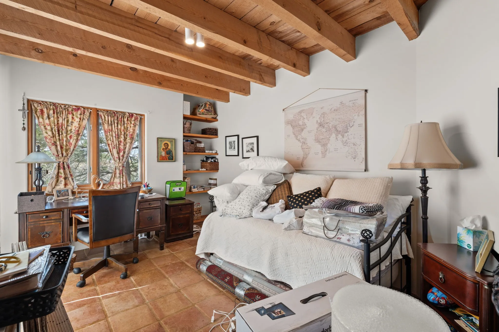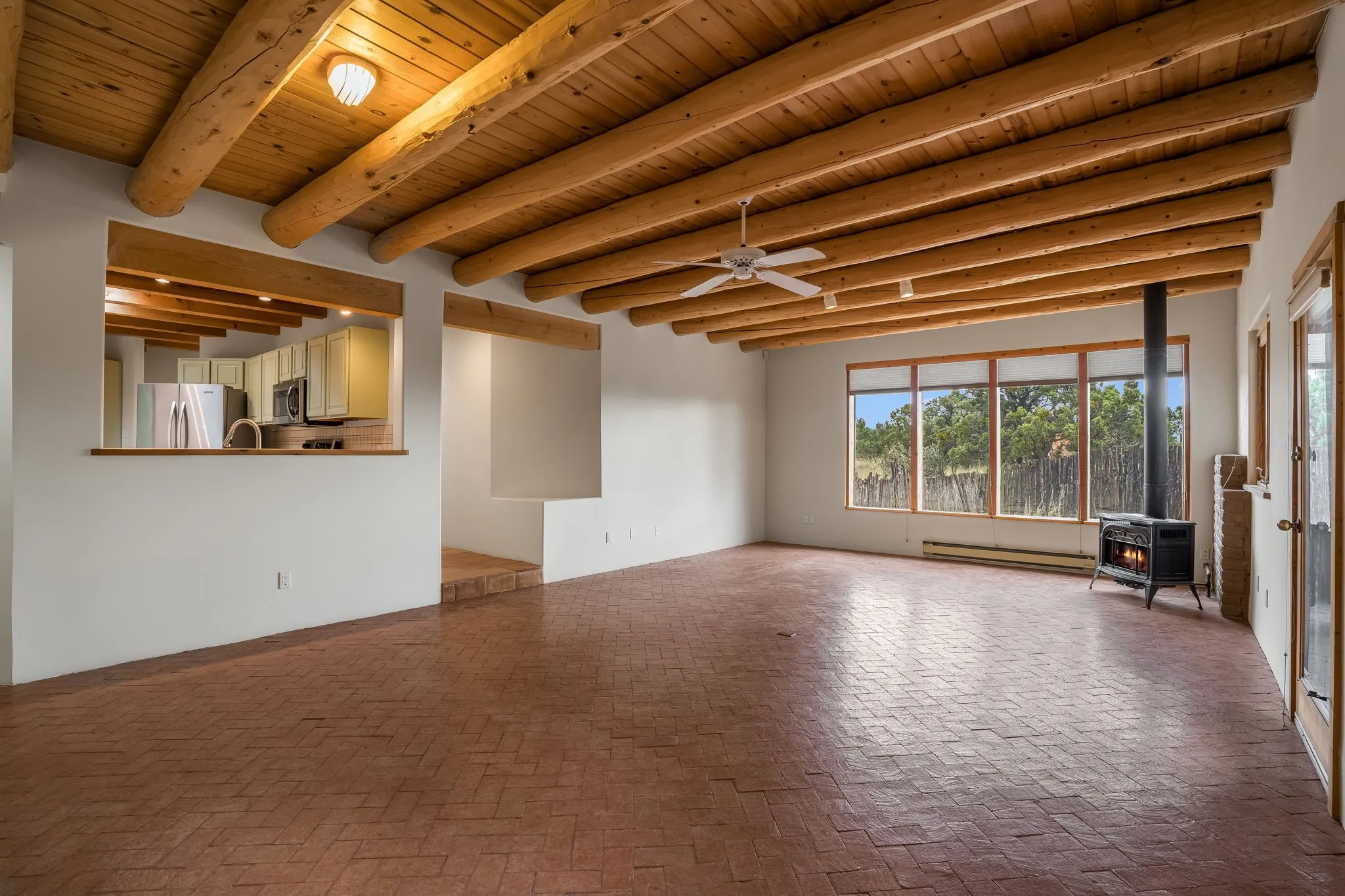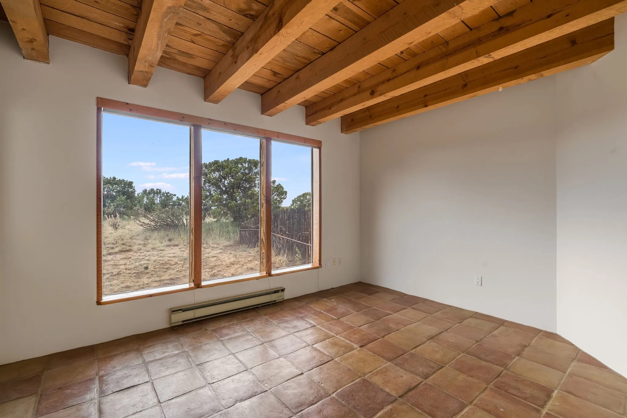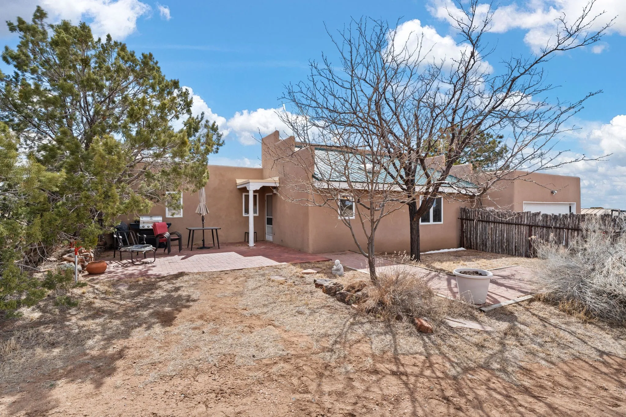 Come see this classic passive solar designed home in Eldorado, set on a private lot that backs to open space. The views are panoramic and the lot is covered with large pinon and juniper. The split floorplan includes 3 bedrooms, 2 full baths and a separate office space. Tall windows fill the spaces with light and warmth, and the beamed wooden ceilings carry throughout the house. Brick and saltillo floors complement the Southwest charm. The kitchen is open and has ample storage and stainless appliances. The living room has a gas stove and access to a covered brick patio. The TPO membrane roof was recently installed, as was the new elastomeric stucco. The Eldorado subdivision has many amenities, including a community pool and miles of hiking/bike trails. Schools, shopping and restaurants are part of the community, which also supports a local library and senior citizen center.