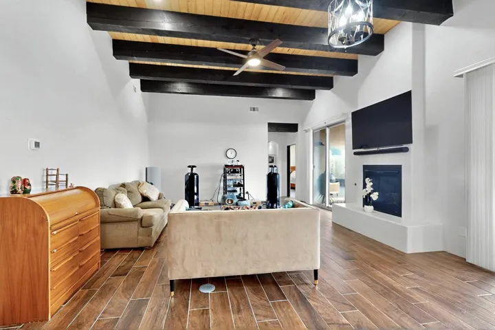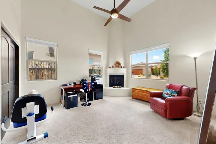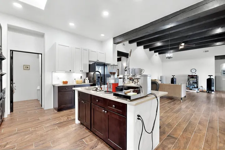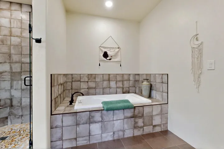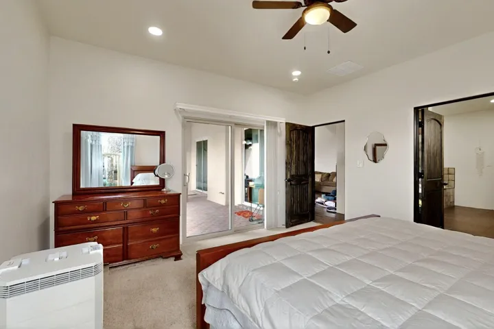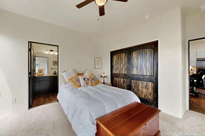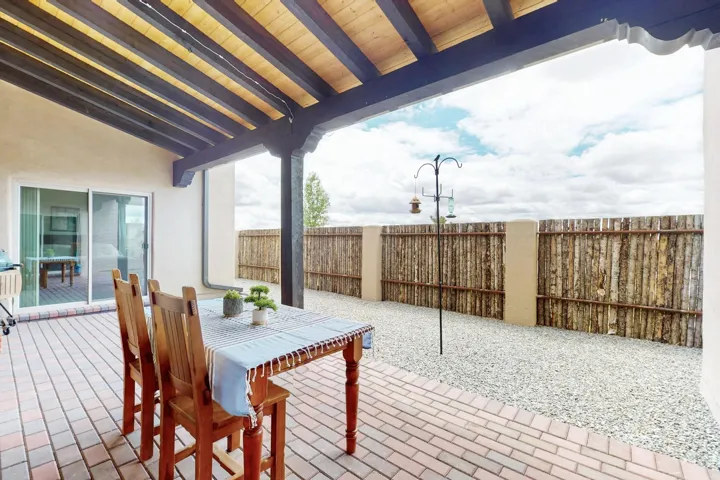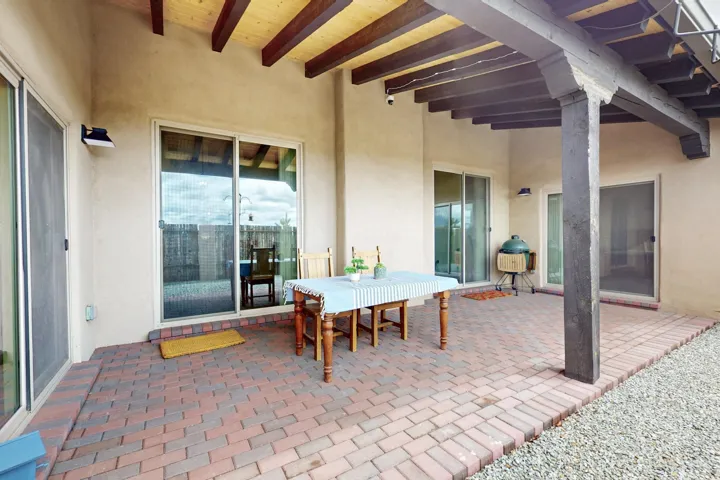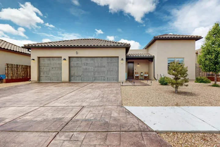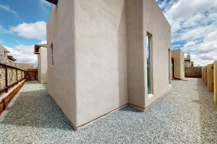 This pitched tiled roof Santa Camila plan has a three-car garage with a stamped concrete drive. The landscaped front yard leads to an eight-foot-high entry door opening into a gracious entry with a barrel vault ceiling. To the right of the entry is a bedroom/office with a 14-foot ceiling and a kiva fireplace. The lovely open living/dining area has beamed and T & G ceilings and a fireplace. The living room opens to a covered portal with brick pavers. The kitchen includes a double oven, an adjoining walk-in pantry with a skylight, and a utility room with a laundry sink and cabinets. The Owner’s suite opens out to a covered portal. This home is beautifully landscaped.