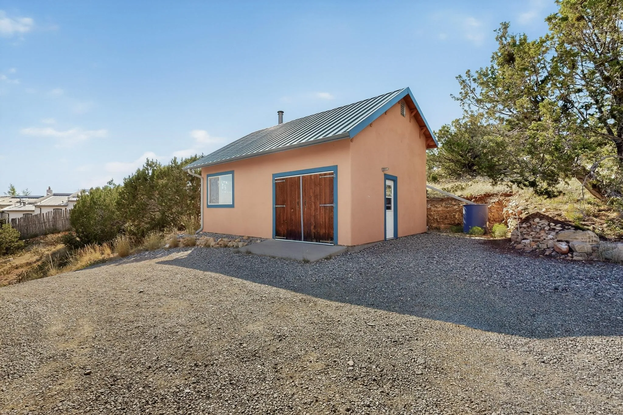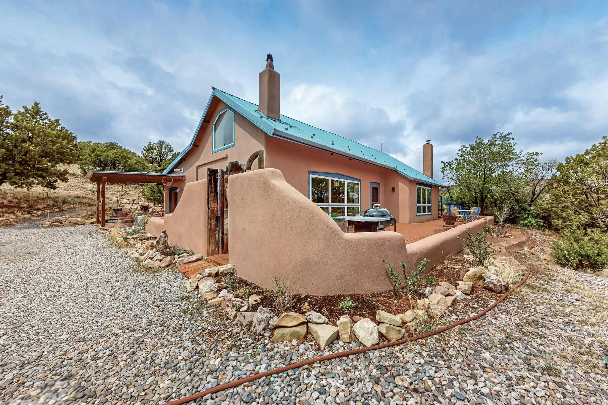 hillside location just before the historical village of Lamy. This passive solar, open plan,