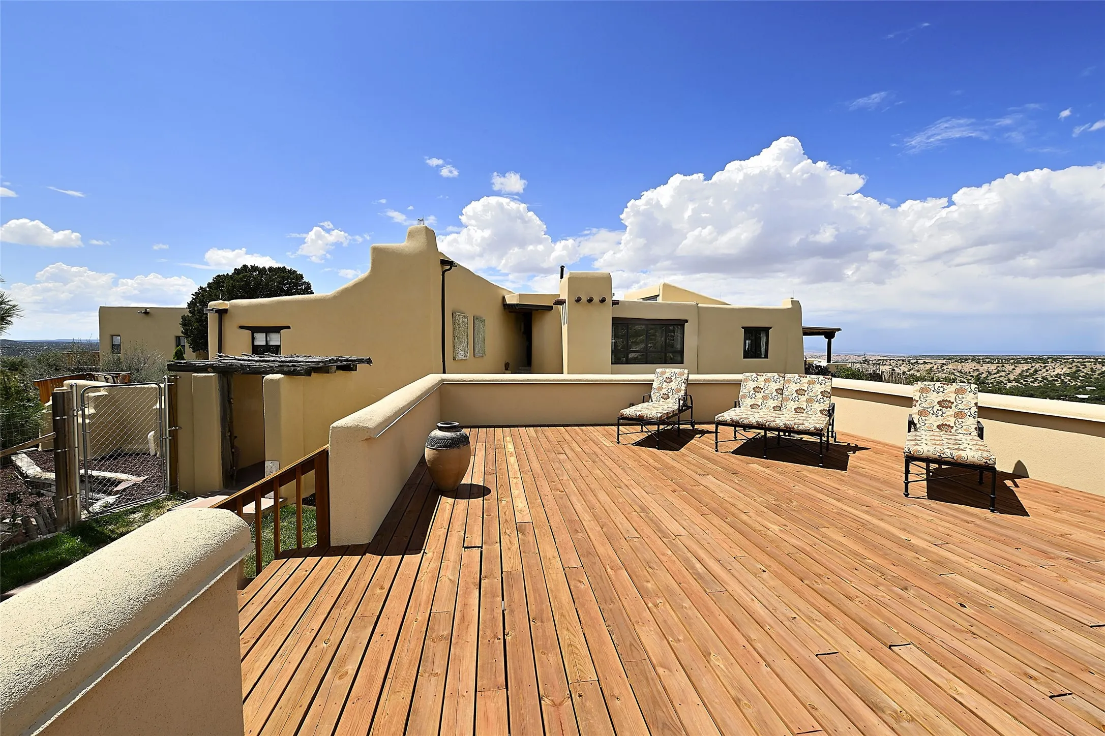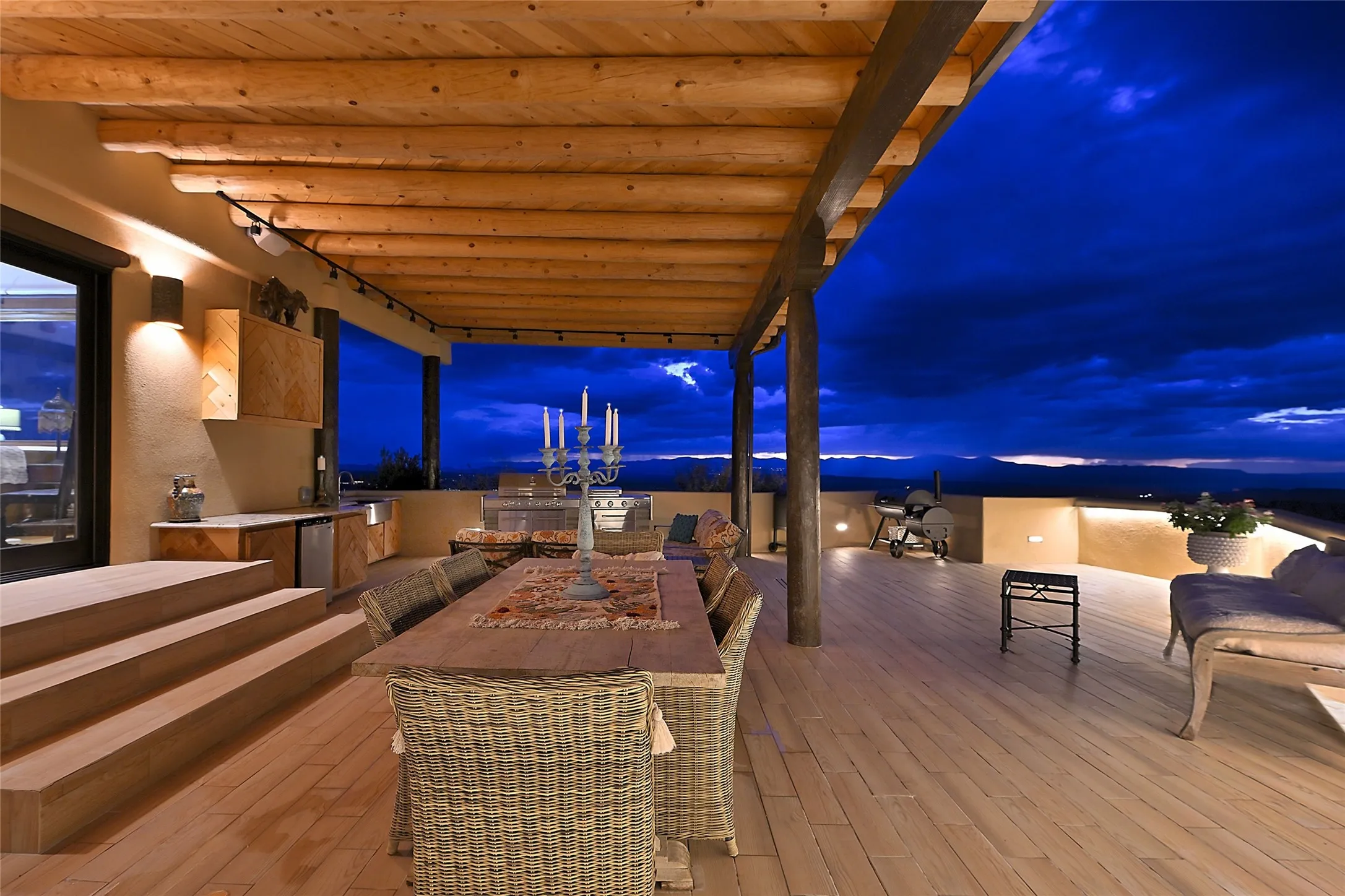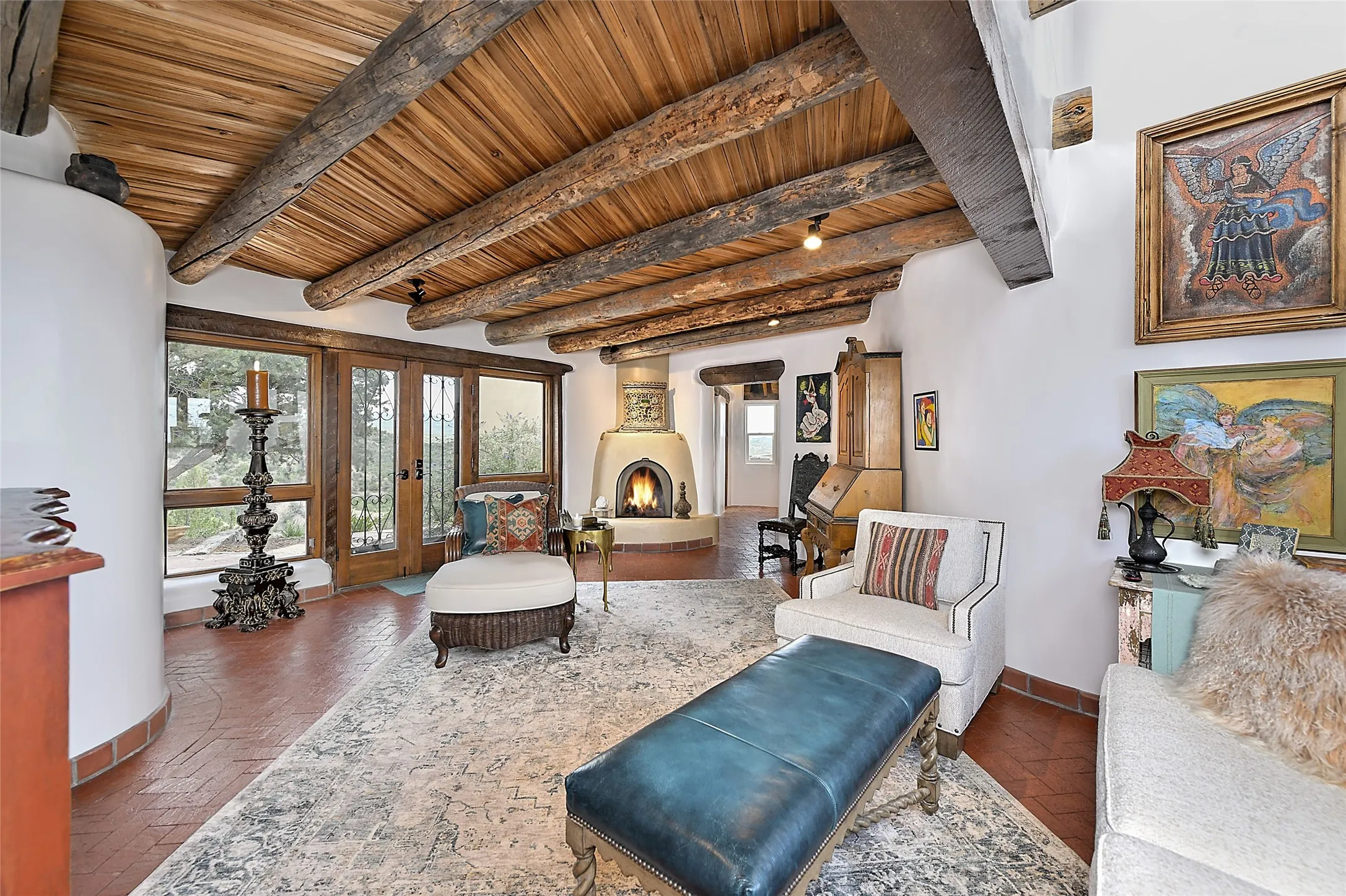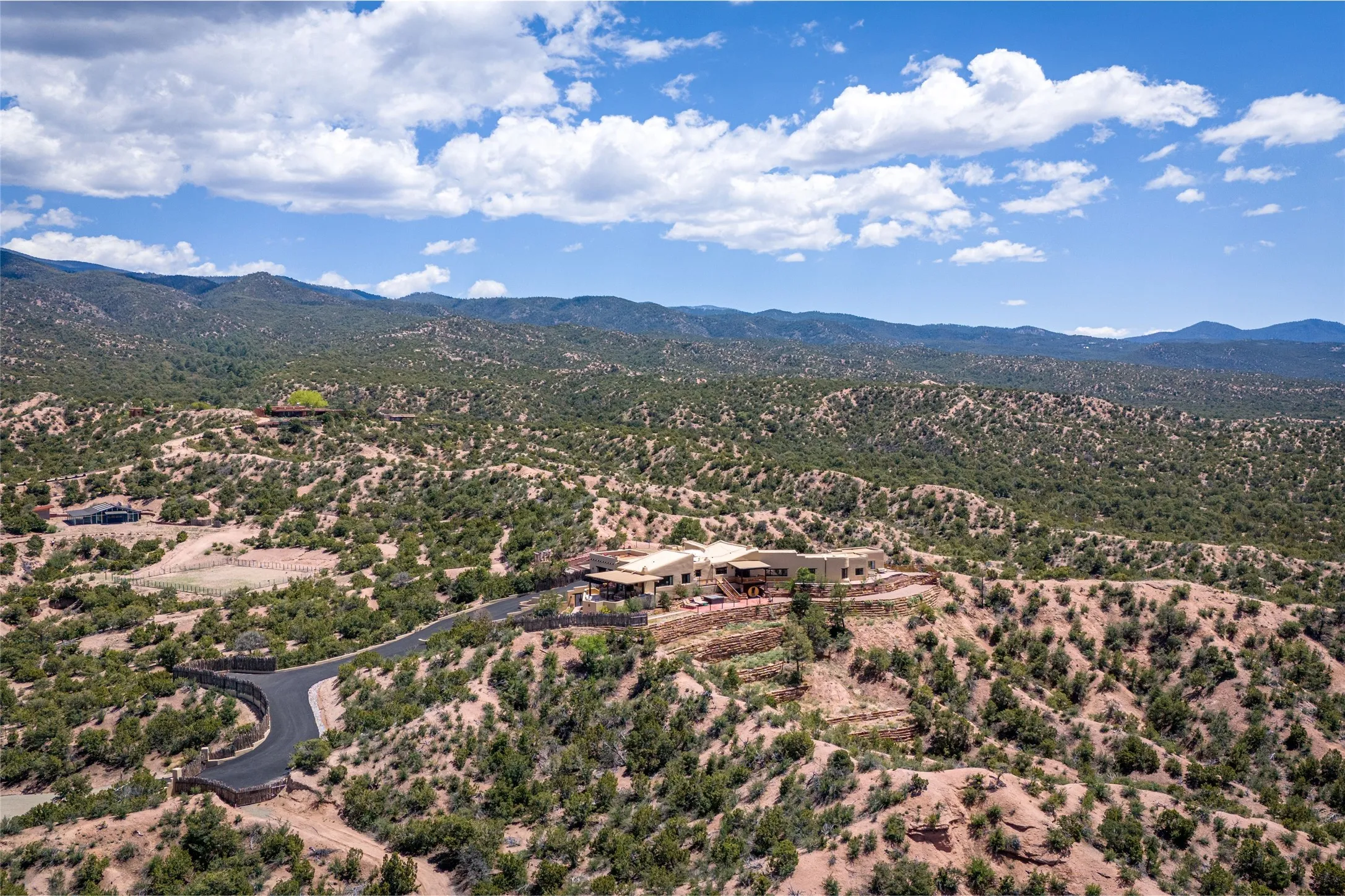 Welcome to this breathtaking 10-acre estate in the prestigious Tesuque community, where luxury meets unparalleled natural beauty. Quite possibly the best views in Tesuque, perched majestically on a private mountaintop, lovingly nicknamed āTop of Tesuque,ā offering 360-degree panoramic views that make you feel as though you’re sitting atop the world. Spanning approximately 6,614 sq ft, this 4-bedroom home is a masterpiece of design and function, featuring many new upgrades for a modern lifestyle. This fully restored and expanded adobe home seamlessly blends classic Santa Fe design with modern upgrades, preserving its timeless charm. This property has a new roof, lighting, stucco. Truly turn-key in every way. Inside, the floor plan seamlessly blends indoor and outdoor living, creating an ideal setting for both relaxation and entertaining, including 6 Kiva Fireplaces as well as 1 wood-burning stove. The brand-new kitchen features handcrafted solid wood cabinetry and top-of-the-line luxury appliances, perfect for any culinary enthusiast, while the adjacent dining and living areas boast spectacular views. The primary bedroom suite includes a separate sitting room, offering a private retreat within the home. Enjoy the convenience of a dedicated office space and den, a media room, as well as a game room complete with a wet bar, perfect for hosting guests. Step outside to the covered portal with outdoor kitchen & TV, complete with matching granite countertops, where you can entertain in style. The outdoor kitchen has all new (never been used) grill, pizza oven and smoker! Terraced gardens also feature a brand-new (never been used) Sauna and Hot Tub. A newly built garage has an observation deck on top. There are new entrance gates for privacy, a new driveway surface, and new additional parking areas ensure privacy and convenience. The addition of an electric lift from ground level to main level of residence also ensures accessibility and ease for loading and unloading. Mexican Porcelain tile terrace at the front entrance welcomes you. There is an enclosed dog park, as well as fully irrigated garden beds surrounding the house. The property is beautifully illuminated with 40 handmade copper light fixtures, adding a timeless touch to the outdoor spaces. With no HOA restrictions, this home offers the freedom and tranquility you’ve been searching for in the village of Tesuque.