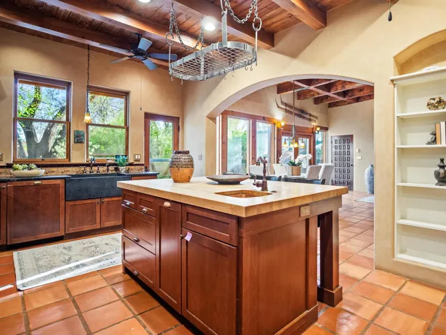 Elegant retreat with Guest Quarters on a quiet, leafy cul-de-sac just a five minute walk from the shops and restaurants of Taos plaza and Kit Carson Park, 310 Ortiz Lane is a stunning, versatile property, blending traditional charm with modern comforts ā as a primary home, ski lodge, art studio, retirement haven and family getaway. With well over 4,000 square feet of living space across a main house, a lock-off āsecond homeā ā the original house ā and a separate guest casita ā also perfect for a studio/workshop ā this unique home offers exceptional flexibility for multi-generational living, rental income, or live-work needs. MAIN RESIDENCE (Approx. 3,600 SF) Step into a warm, adobe-toned interior great room featuring high ceilings, custom woodwork, arched doorways, and classic Southwest design details throughout. The living and dining areas flow seamlessly, anchored by a cozy double fireplace, built-in shelving, wood floors, and Saltillo tile. To the side, a wide, fan-cooled patio opens onto a flowered adobe-walled Eden shaded by a glorious towering Siberian elm āvisible and accessible from the great room interior. The recently added gourmet kitchen is a cookās (and hostās) dream ā with custom cabinetry, a spacious island with bar-stool seating, ample storageā including a separate multi-shelved pantry room and a coveted AGA stove. Large windows invite morning light and offer garden views. Upstairs, the primary suite includes a private sitting area, walk-in closet, fully remodelled bath with tub and walk-in shower, plus an adjacent office, bedroom or bonus space. The LOCK-OFF IN-LAWDWELLING remains connected to the main homeābut has its own private entrance and patio. It features a second kitchen, full bath, open-concept living and dining areas, fireplace, one bedroom with French doors leading to a covered patio and wall fountain. This space offers an ideal setup for extended family, guests, or even rental use. CASITA (Approx. 400 SF) across the front courtyard is a charming detached guest suite with vaulted ceilings, wood floors, built-in shelving, and a ¾ bathāalso perfect as an art studio, short-term rental, or private retreat. And a 100-square-foot workshop has its own separate entrance. OUTDOORS & AMENITIES ⢠Fully enclosed and beautifully xeriscaped yard with russet gravel, brick pavers, mature landscaping, and adobe privacy walls ⢠Multiple patios, both covered and open, offering outdoor living in every season ⢠4 off-street parking spaces, including 2 under attached carports ⢠Whether you’re looking for a hidden gem to call home or a flexible compound with income potential, 310 Ortiz Lane delivers exceptional style, thoughtful design, and an unbeatable in-town location.
