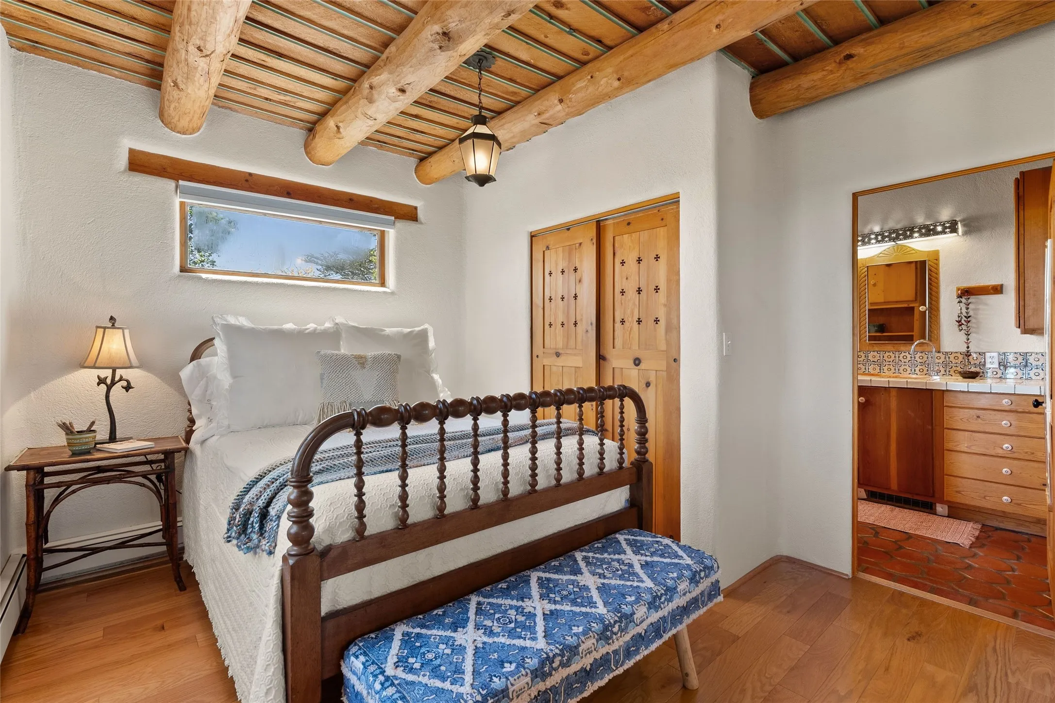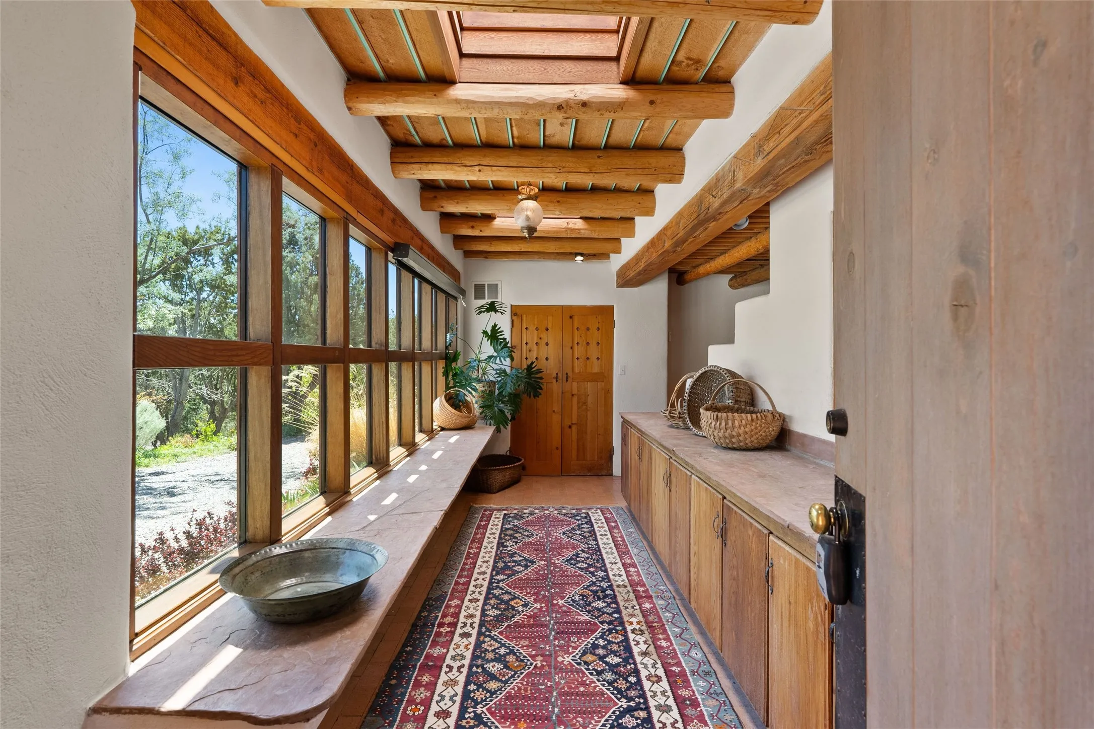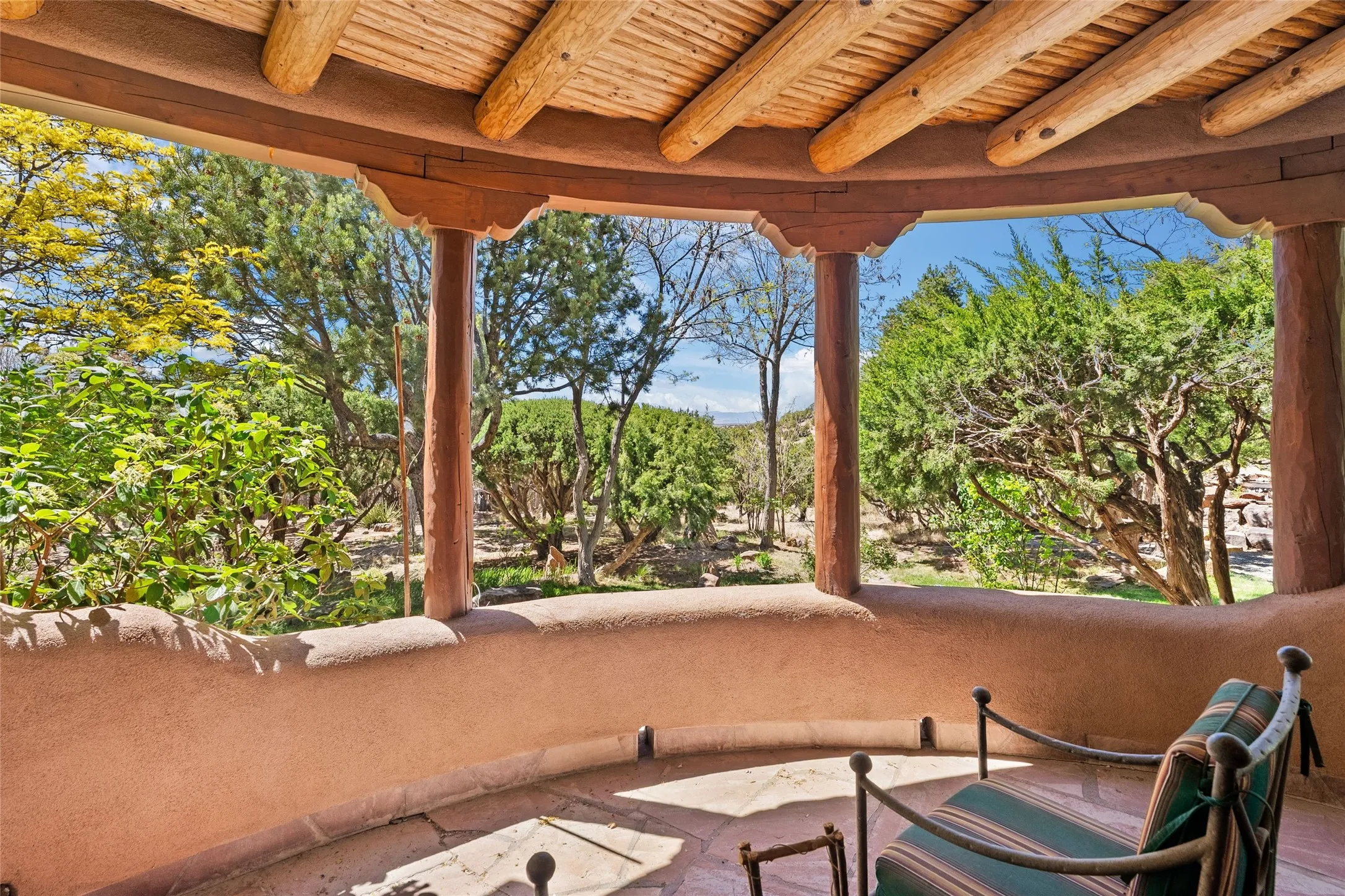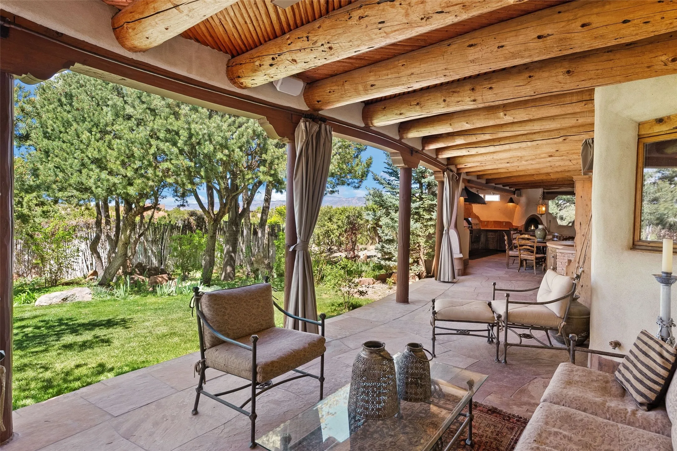 The elegant dining room opens onto the courtyard creating harmony with nature. The kitchen flows to a covered portal with a built-in grill, cabinetry, dual sinks and ample seatingāideal for entertaining. A flagstone stairway leads to a luminous office with built-ins, powder room and rooftop deck. With stunning views of Sangre de Cristo sunrises and Jemez sunsets, this elevated open-air living space includes a kiva fireplace, bancos and a ācrowās nestā retreat.