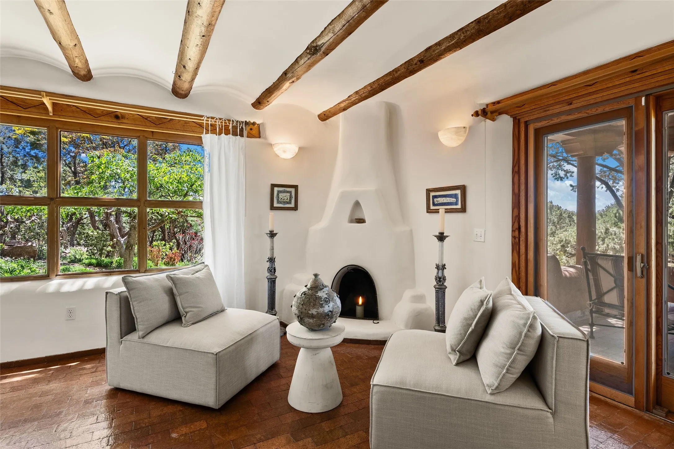 Curving adobe walls, Saltillo tile floors, carved wooden doors and kiva fireplaces echo throughout. The circular living room features a tiered beamed ceiling, kiva fireplace and intimate west-facing portal.