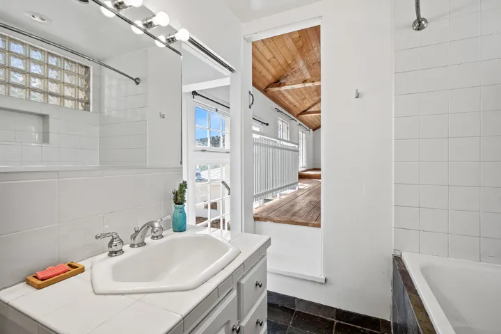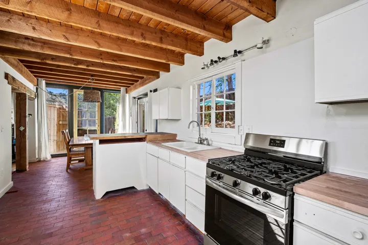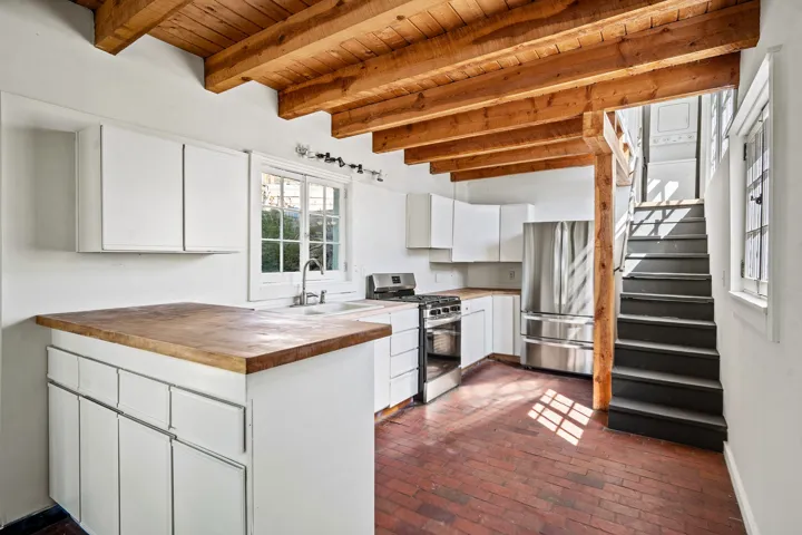 On a hillside within a few minutes walk of the entertainment and dining in Madrid, this well maintained two-story home is sure to charm. Outside, the terraced lot leads up to a separate studio space with loft. The white exterior and pitched metal roof add desert style, and a back patio provides space for outdoor relaxation. Inside, the home opens into a spacious living room with wood heat, wood flooring and a viga ceiling. The kitchen has brick flooring, large windows and a glass door to the patio, A large, open bedroom is situated on the second floor above the kitchen with ample light and The lot’s elevation allows for views over the town.