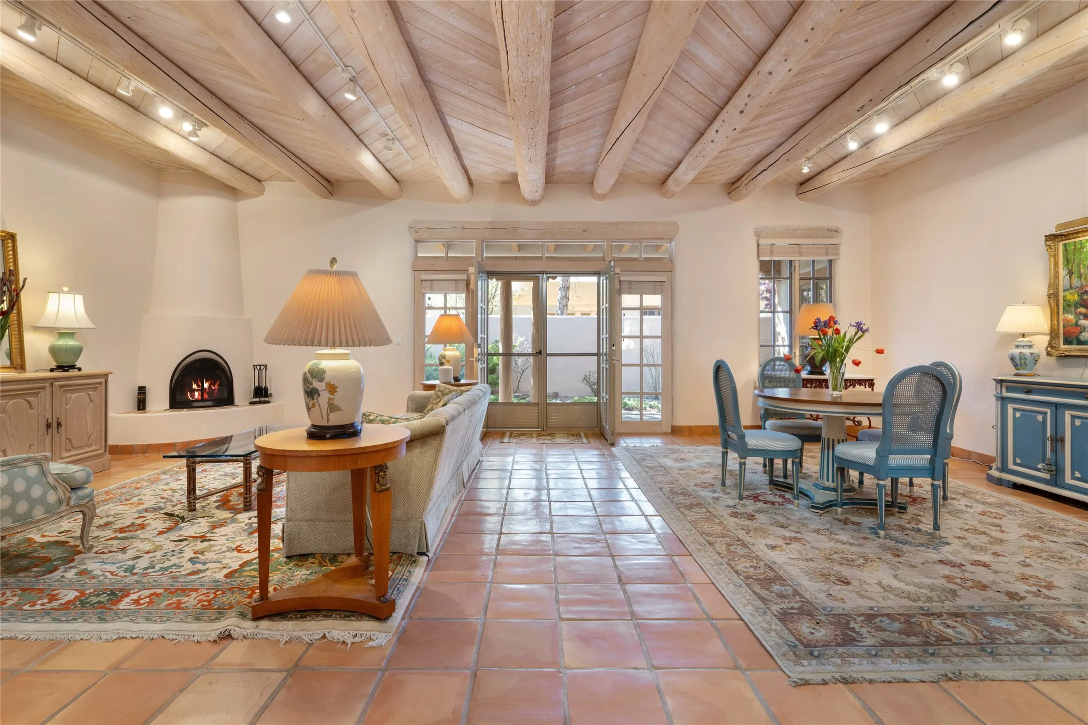 The chef’s kitchen is equipped with a gas stove, double oven, Sub-Zero refrigerator, and a generous island with banquet seating, catering to culinary enthusiasts. The living area features high viga ceilings, Saltillo tile flooring, and a traditional kiva fireplace, creating an inviting ambiance.
