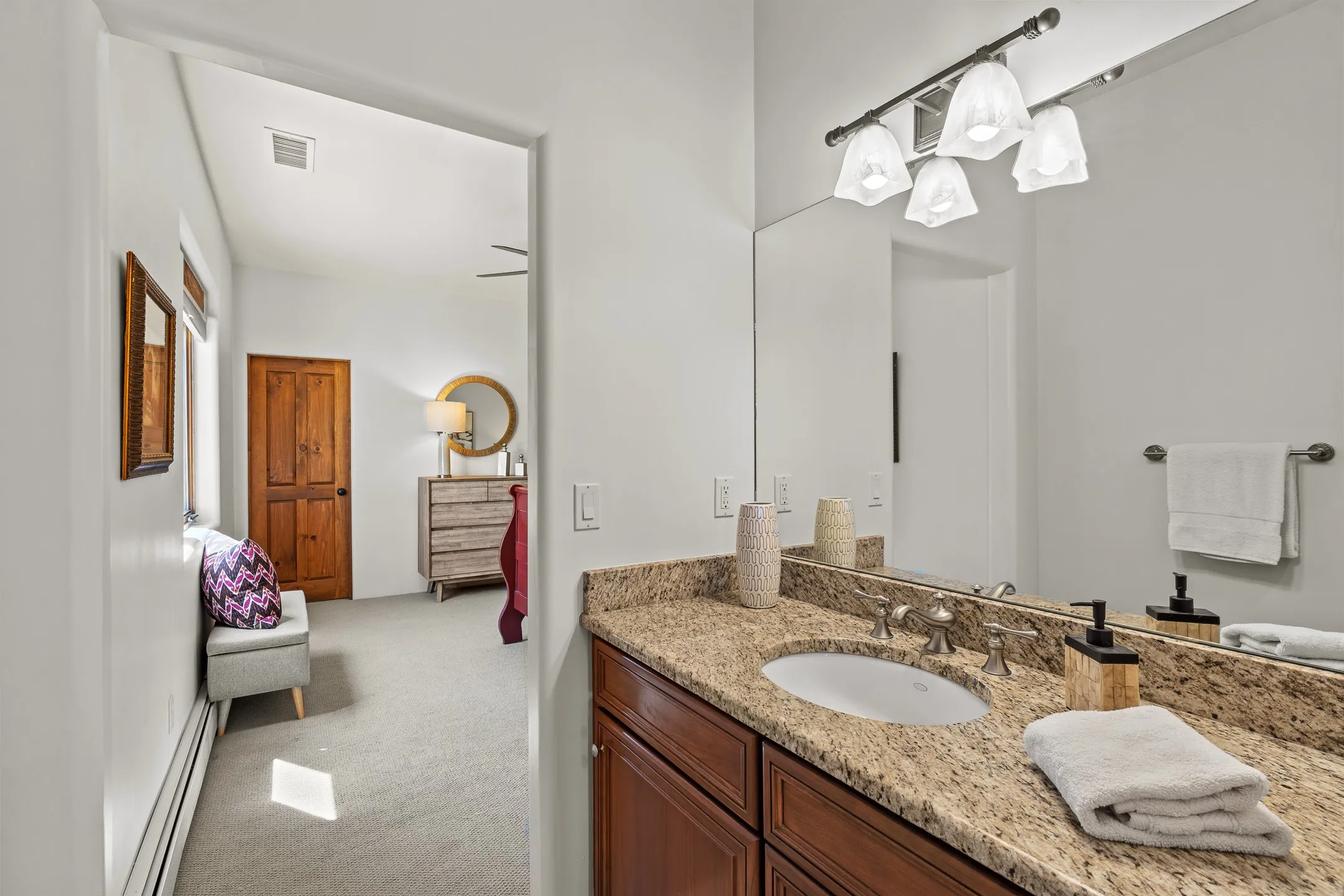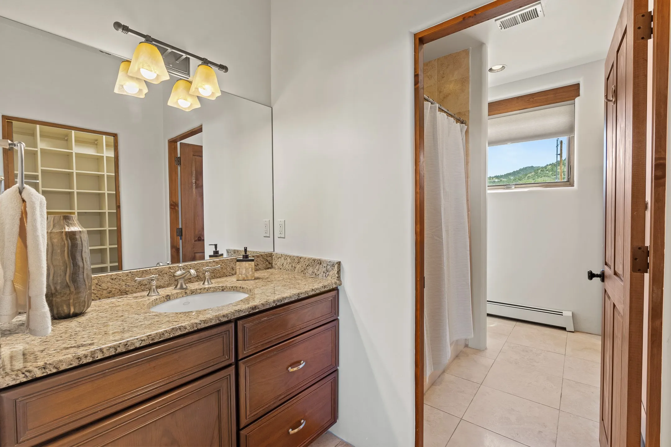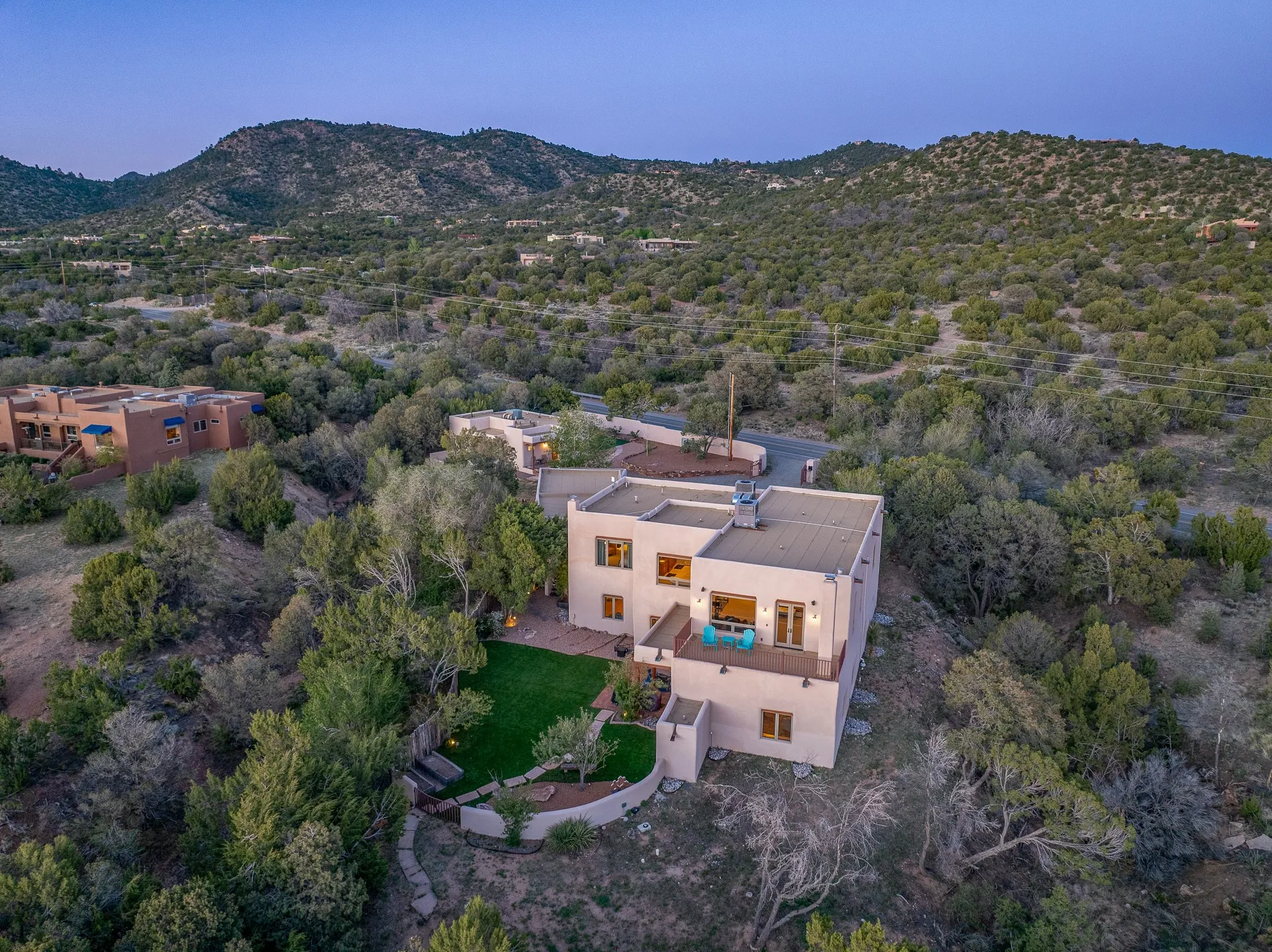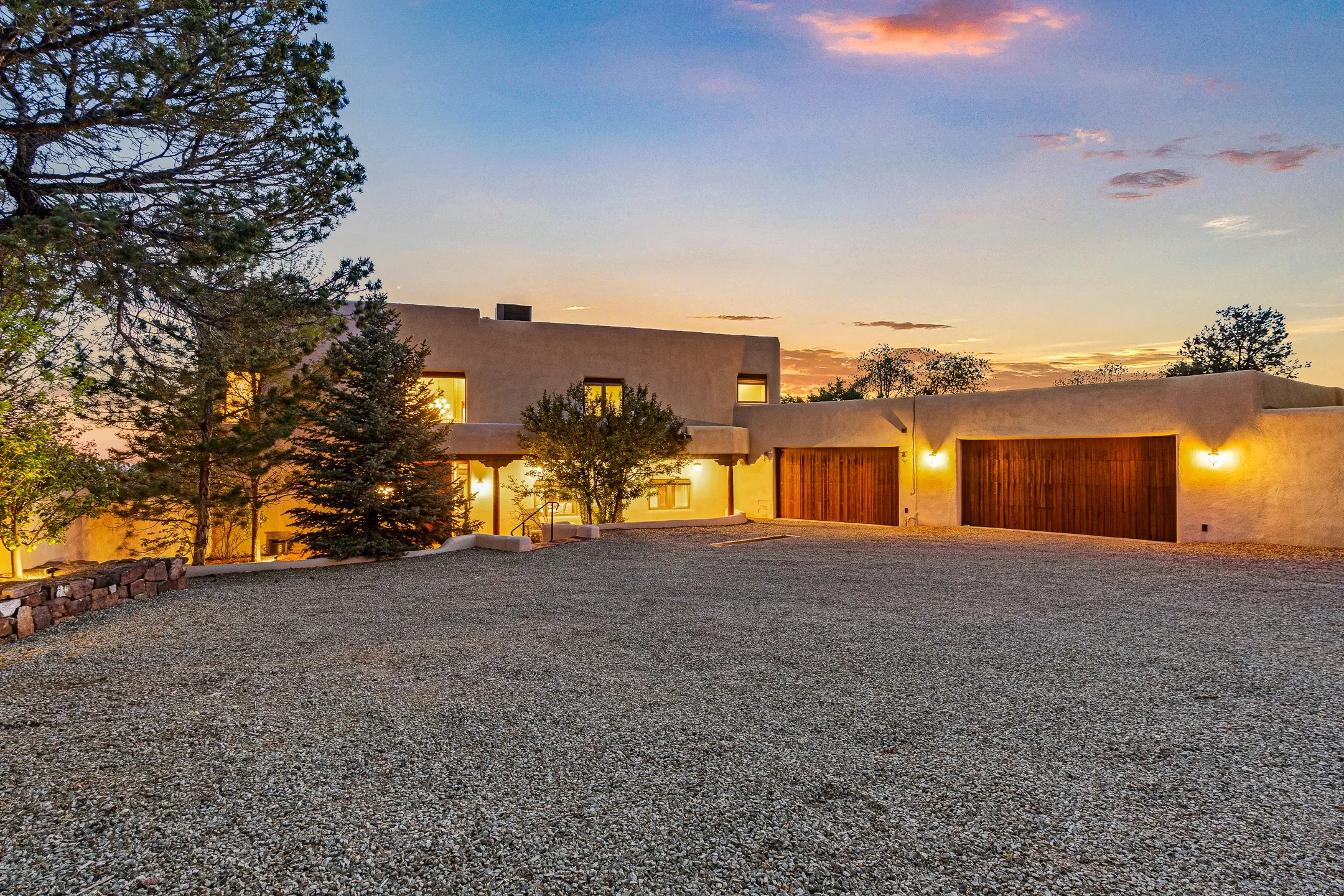 A private and gated sanctuary sitting on 2.77 acres just off of the historic Old Santa Fe Trail. The luxurious four bedroom, three and a half bath main home provides space and functionality for modern living. Elegant living downstairs includes refined diamond plaster finishes, viga beams, two fireplaces, and travertine tile. A chef inspired kitchen includes abundant granite countertops with Subzero and Thermador appliances. The kitchen flows into a lovely dining area with views to the West of the tranquil backyard space and portal ideal for outdoor living and entertaining. A cozy family room off the kitchen and dining area currently serves as a playroom, offering flexible use of space. A first-floor guest bedroom with full bath adds convenience and versatility. Upstairs, a gracious primary suite serves as a true retreat, complete with a fireplace, spa-style bath with large walk-in shower, and a clawfoot tub perfectly placed before a view window. Step out onto the private balcony to take in panoramic Western sunset and mountain views. Two additional upstairs bedrooms provide comfortable accommodations for family or guests. Additional features include a spacious laundry room, oversized three car garage, and additional ample storage space. A charming one bedroom, three quarter bath casita sits separately on the North side of the property boasting a full kitchen, dining area, and living room with fireplace providing a cozy hideaway for your family or guests. This property is the perfect blend of privacy, sophistication, and authentic New Mexico living just minutes from downtown Santa Fe.