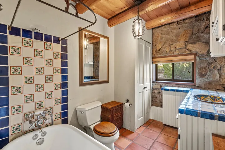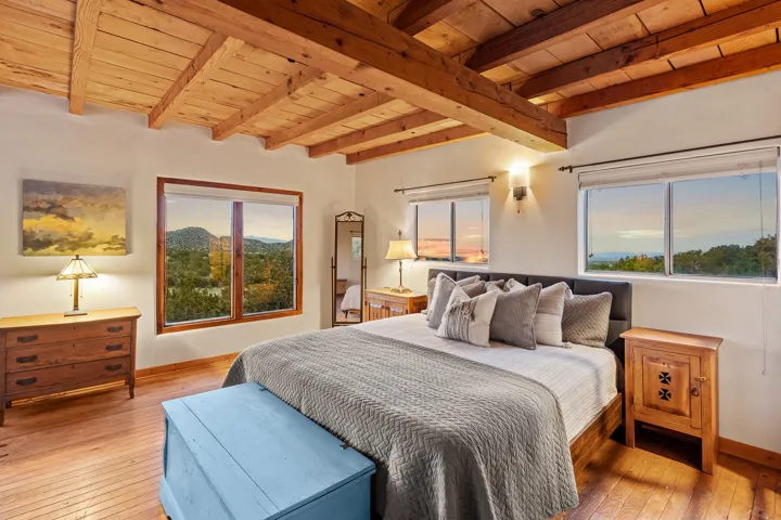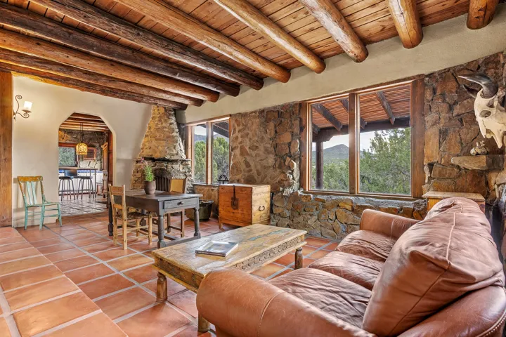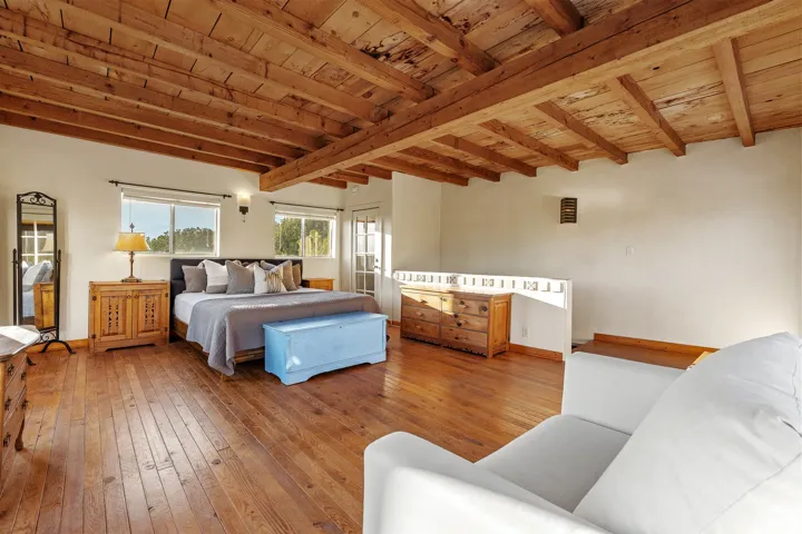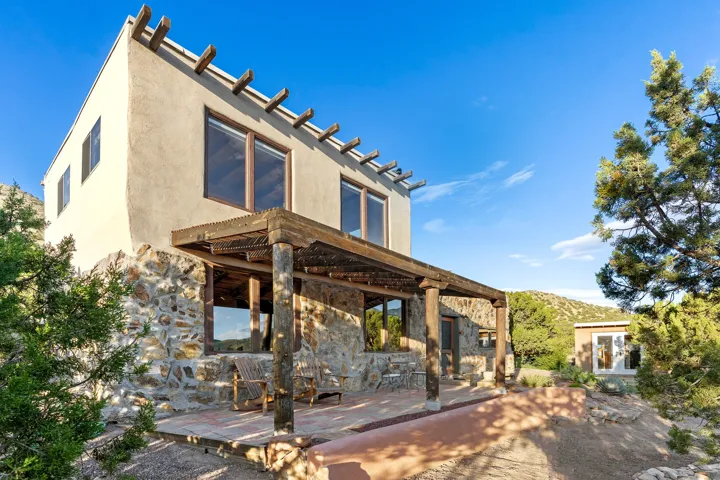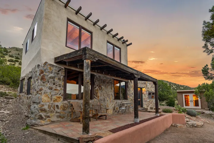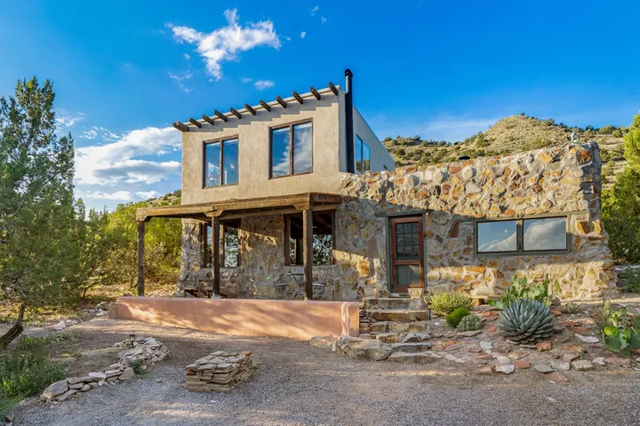 Experience sustainable Off-Grid living in a truly unique and artistically designed home. A One bedroom, one full bath Artist retreat in Madrid, New Mexico with solidly built craftsmanship. Every detail speaks to inspiration and integrityāfrom the hand-poured, etched entry threshold, the turquoise inlay to the artisan stone walls, hand-hewn vigas, and thick reclaimed timber beam window ledges. A mosaic tile inlay graces the foot of the richly grained hardwood staircase, and a striking stone-clad fireplace anchors the living space with warmth and enduring character. Designed for comfort and sustainability, this home offers a holistic lifestyle in a truly inspiring setting. The spacious bedroom opens to sweeping, unobstructed views set at the base of Cerro Chato and facing the majestic Ortiz Mountains. This solar-powered sanctuary offers privacy and breathtaking mountain vistas on over 10 rolling acresājust 3 minutes from the historic Turquoise Trail, under two miles from the Cultural Hub and Historic mining village of Madrid, and a short drive to Santa Fe. Live off-grid with confidence thanks to an upgraded solar system, backup generator, owned propane tank, private well 85-95 feet deep with 10-12 gallons per minute, new Norwesco 350 gallon well holding tank for the well water that fills in 40 minutes, new septic system and new leach field 2025 (infiltrator model wm-11-03-100, a newly built portal -2025, and 2021 roof. A bright, versatile outbuilding houses the solar batteries and offers additional space for storage, an office, or a creative studio. Bring your chickens, mini goats or a burro; the property includes a single stall, feed shed, and ample room for expansion. Whether youāre hiking, stargazing, or simply soaking in the beauty of the high desert, this land invites deep connection with nature. For anyone dreaming of an Off-grid lifestyle- whether you’re a homesteader, hobby farmer, or simply seeking peace and regeneration. Experience a rare blend of tranquility, creativity, and connection to the landājust moments from the vibrant arts, culture, and dining of Madrid and Santa Fe.