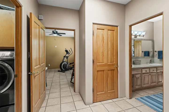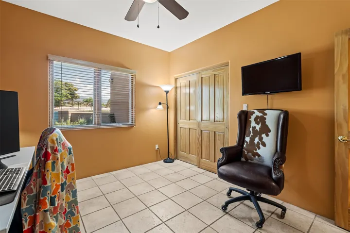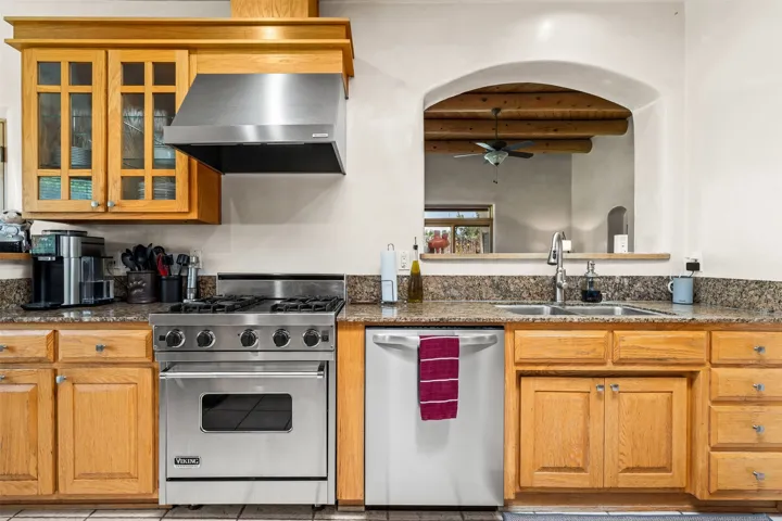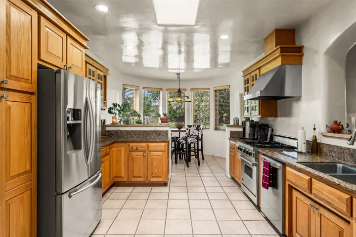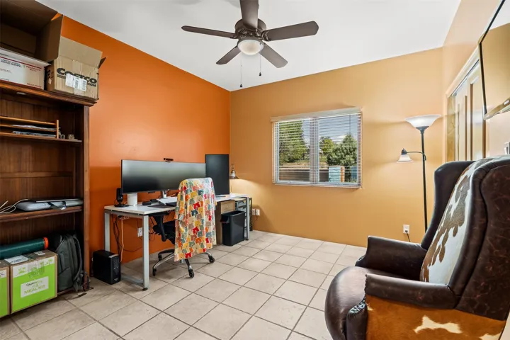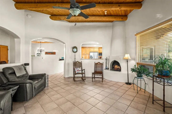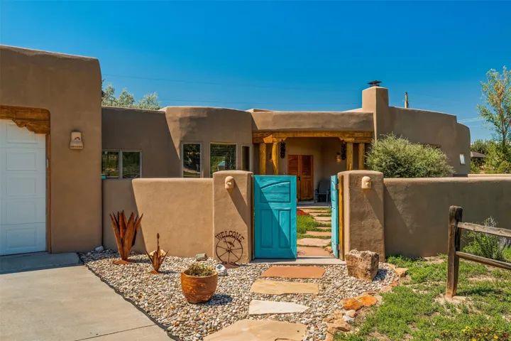 The property has been extensively upgraded to enhance both aesthetics and function, including a new professionally paved driveway, expanded water filtration with a reverse osmosis system, hot tub, and other improvements designed for long-term ease and enjoyment. Every enhancement reflects pride of ownership and investment in quality living. Step into the walled courtyard with mature landscaping and fruit trees, where sweeping mountain views and the iconic Sacred Heart Church create an unforgettable backdrop. Inside, the home is filled with natural light from skylights, smooth plaster walls, and charming Santa Fe architectural details like rounded walls and two traditional kiva fireplaces.