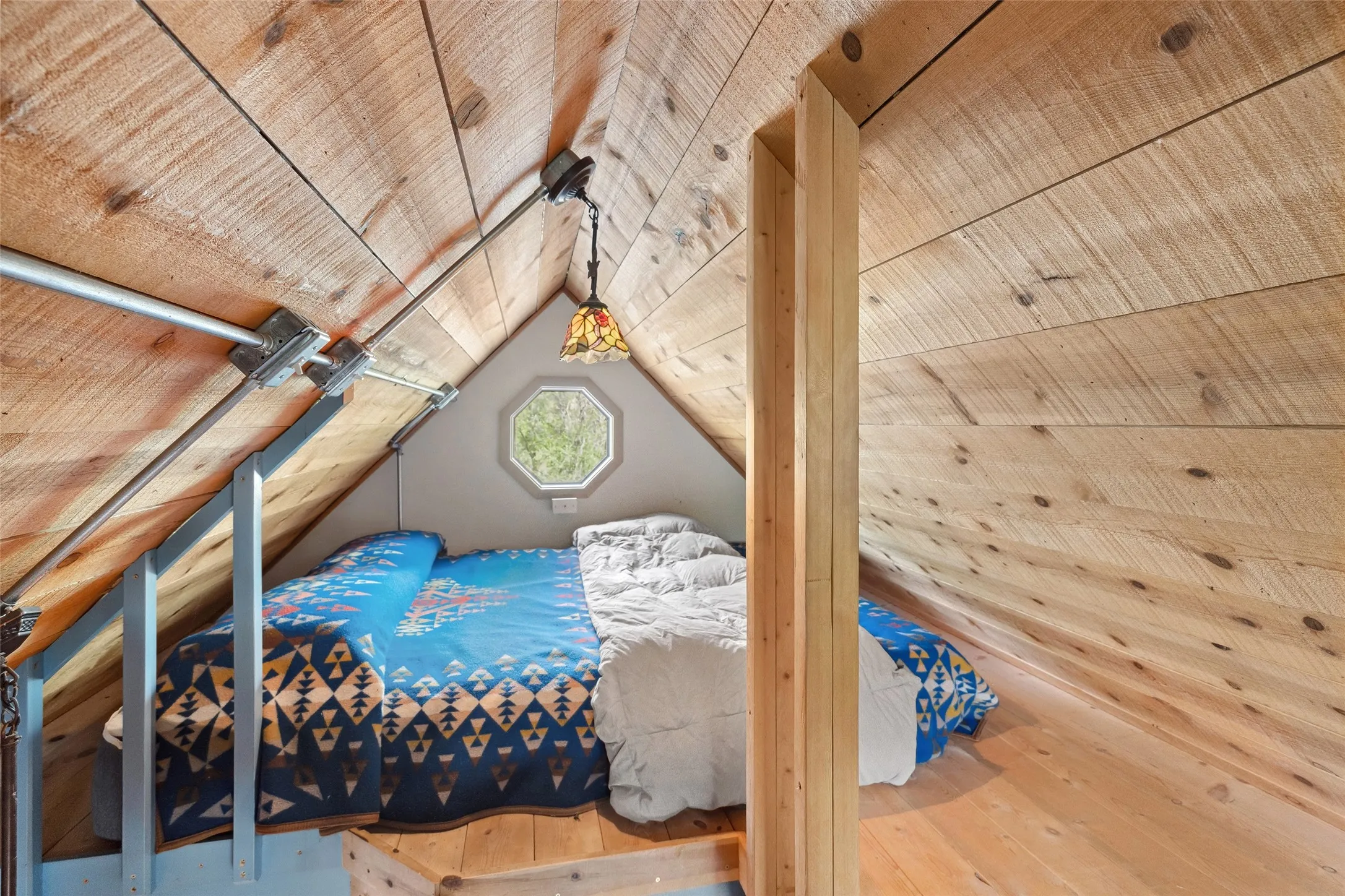 The hand-built guest house, perfect for visitors, rental income, or a creative studio, includes a cozy bedroom, ¾ bath, kitchenette, and a loft. Attached is a greenhouse for year-round gardening.