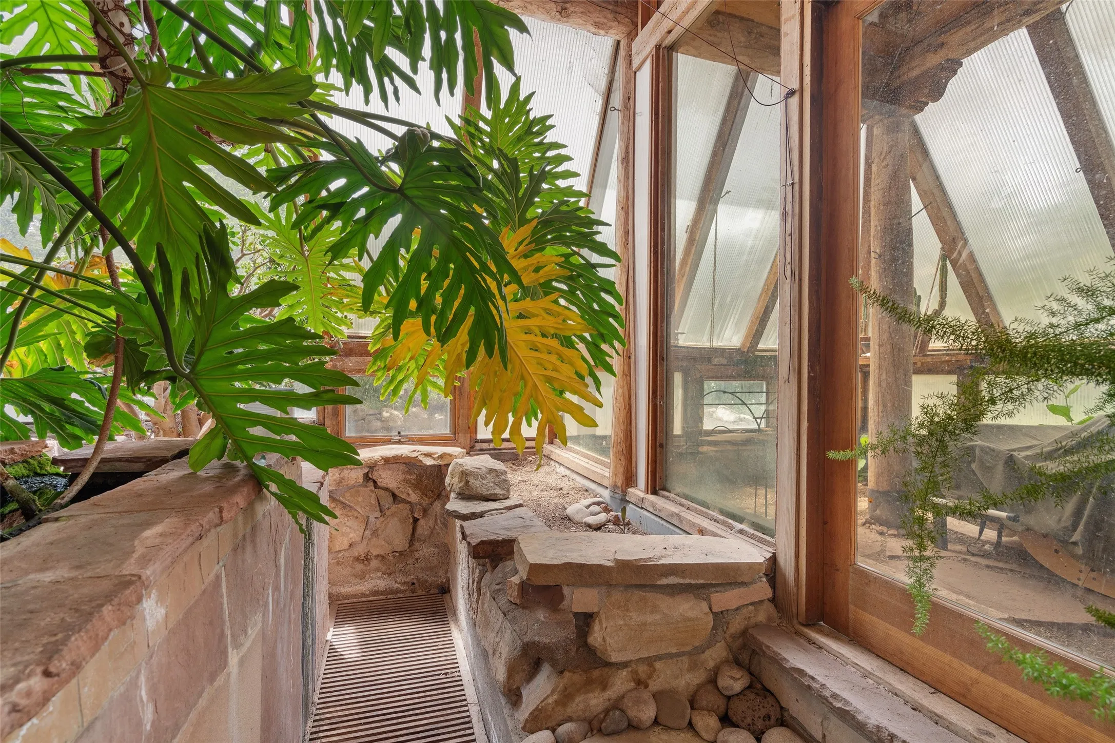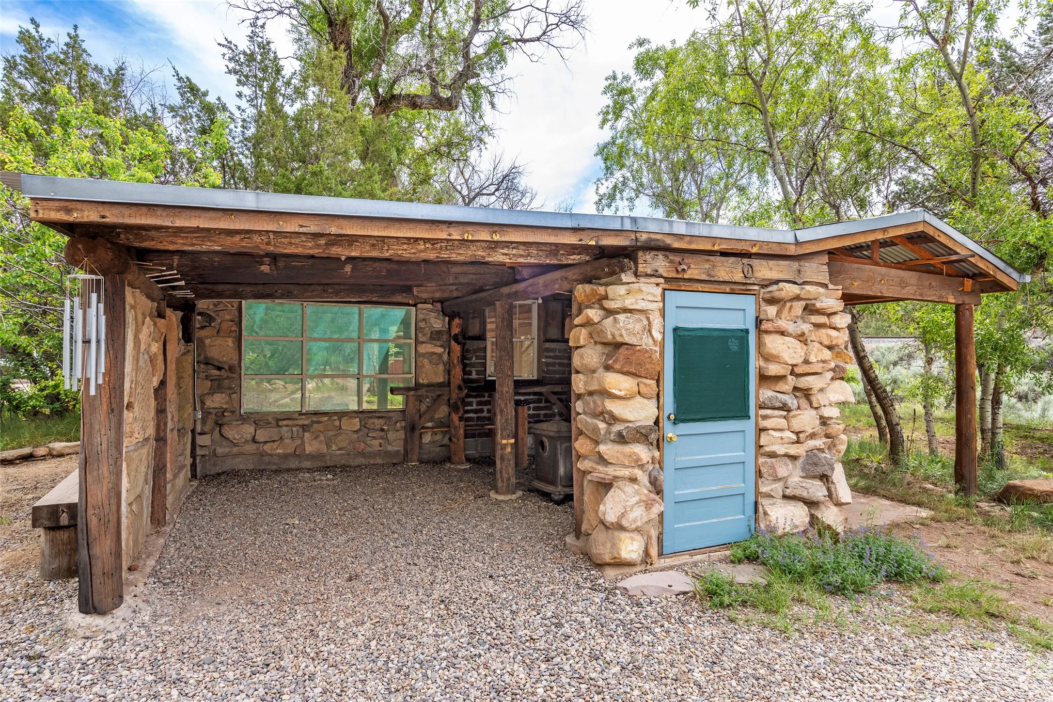 Outdoors, you’ll find a detached carport/shop featuring stonework sourced from the nearby Glorieta Mesa, which doubles as an open-air workspace or additional storage. A traditional underground kiva structure provides a private ceremonial space.