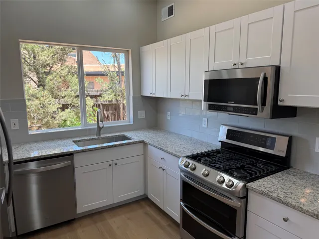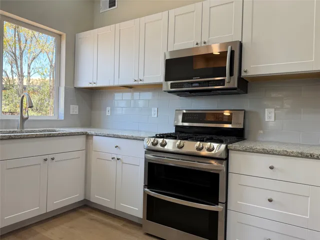 The kitchen has been re-designed with granite countertops, tile backsplash, new cabinets, a stainless steel under-mount sink, and a full suite of stainless steel appliances, including LG double ovens, range, microwave, refrigerator, and dishwasher.