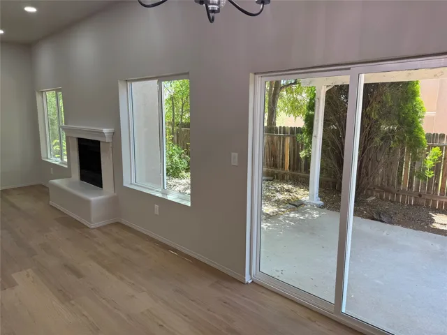 Adjacent open-format living and dining areas feature a custom fireplace with a limestone tile surround and handcrafted mantel. A sliding glass door opens to a rear covered portal and a fully fenced private yard with mature landscaping and large pine and juniper trees.
