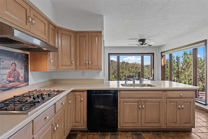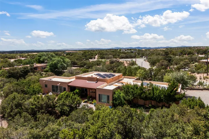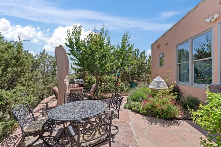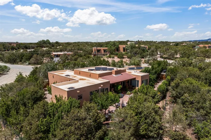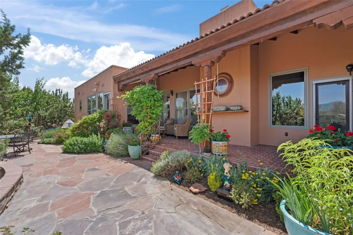 You will be so surprised to see this elegant Santa Fe home. The location almost feels rural, this large parcel is a corner lot, and you truly do not see or hear neighbors, affording great privacy. And because this house is tucked into the north hills, you will be about a 5 minute drive to the Plaza. Two steps down, into the grand sized living room, create a great sense of relaxation and calm. The kitchen, with plenty of room for an eat-in space, is such a delight: oversized windows on three sides show off established gardens and grand mountain views to the east. The mountain range is ever-present: the kitchen, shaded portal, living room, and primary bedroom all face the Sangre de Cristo mountains. The custom design of the house is so user-friendly and logical. The grand livingroom holds the center of the house. One side is completely dedicated to private spaces with 3 bedrooms, excellent walk-in closets and 2 full baths. You’ll even find a cedar closet handy for storing those winter coats. The other side of the living room is a generous kitchen, entertaining bar space, and elegant dining room with full sized windows – which look out to greenery. The light in the house is really lovely and very cheering. The attached, direct entry garage makes your life easy and is generous with a wall of storage cupboards plus an extra refrigerator. For economy the sellers had solar installed, and the house is very practical in terms of utility costs. No HOA restrictions in this neighborhood. Beautiful established gardens will amaze you – and you don’t need a green thumb because almost all are perennials!