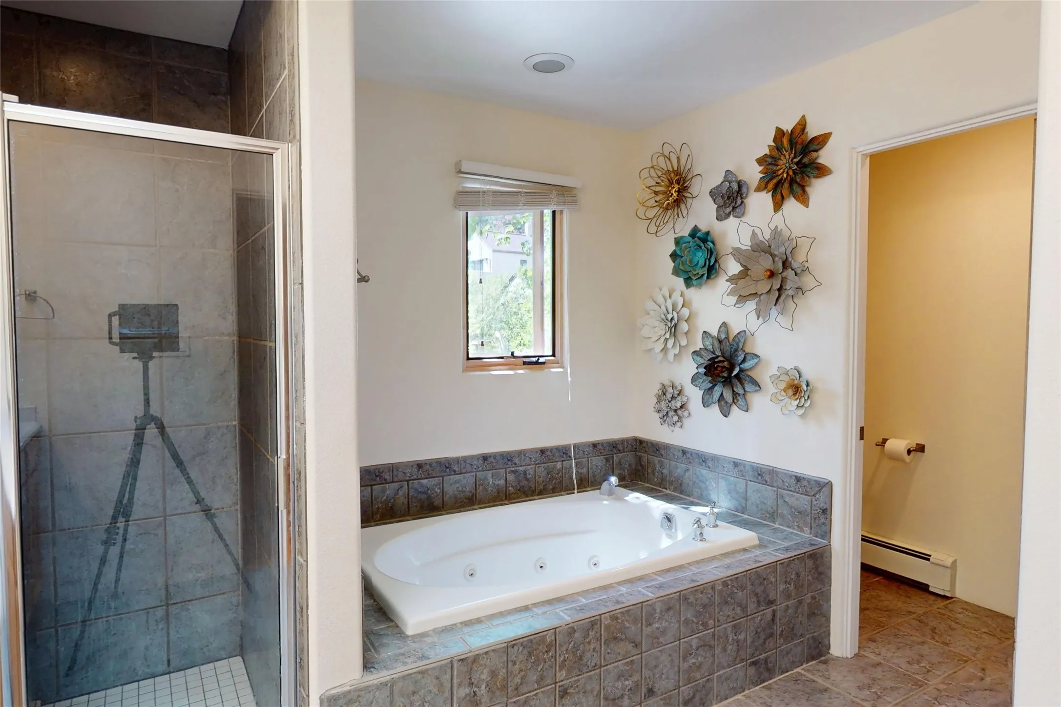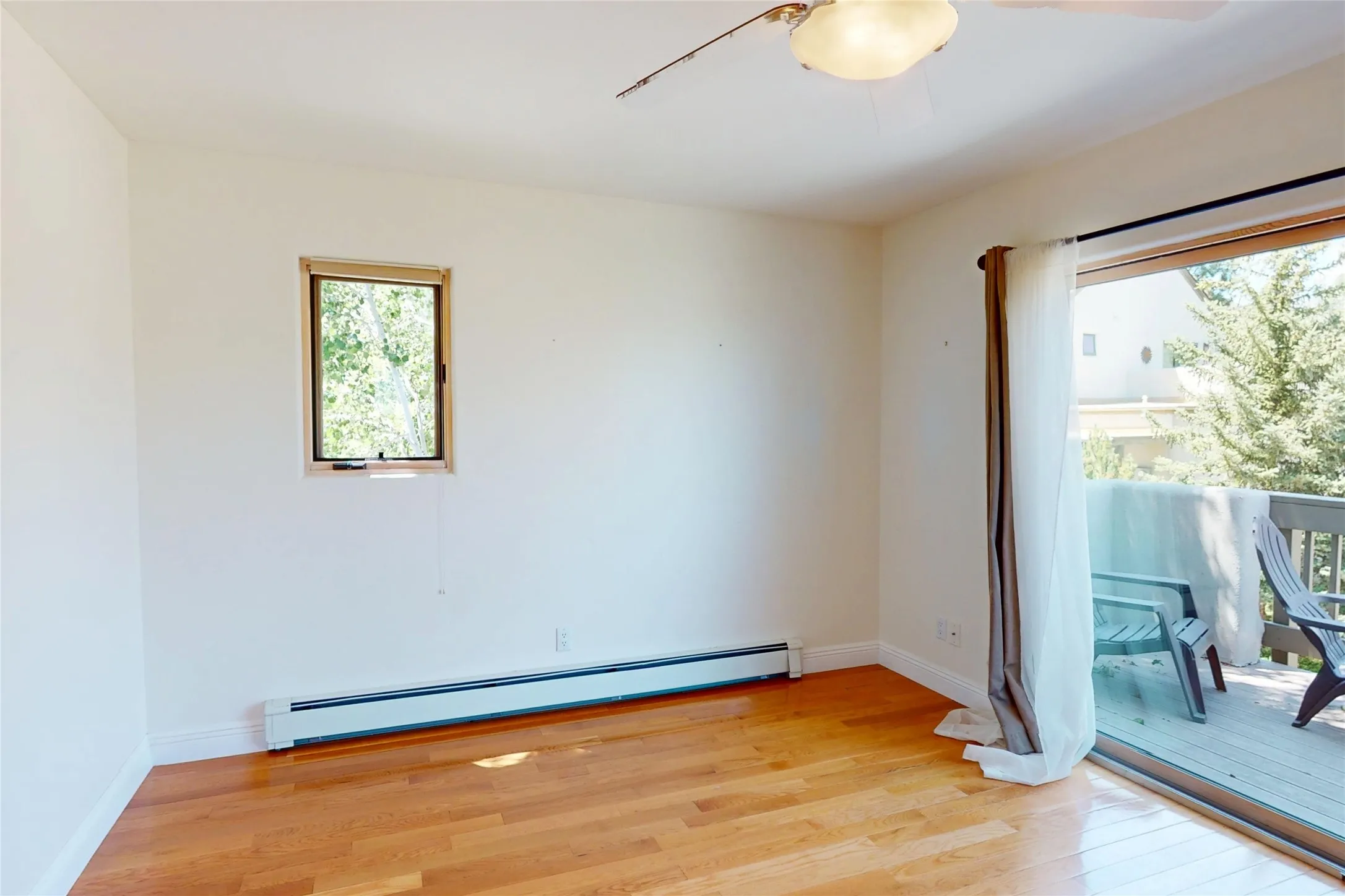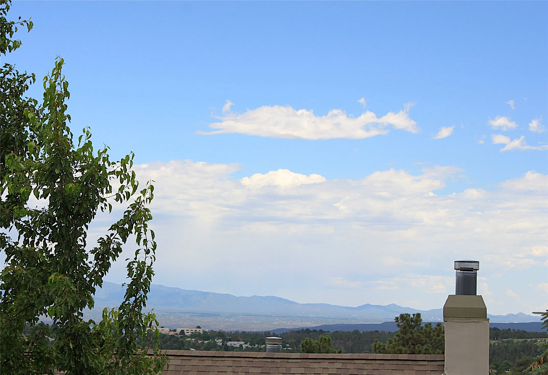 Beautiful and spacious end-unit townhome in the highly desirable Quemazon community. This light-filled 4-bedroom, 2.5 bath home offers sweeping views from every balcony. The open-concept living and dining area features 10-foot ceilings, slate tile floors, and a raised flagstone wood/gas fireplace that adds warmth and character. Large sliding glass doors open to a private, fenced courtyard that seamlessly extends the living space to the outdoors, perfect for relaxing, BBQās and entertaining. Out the back porch gate is a #4 free city bus stop for easy access to the lab or town. The kitchen is both functional and stylish, complete with a gas stovetop, double ovens, a second sink at the wet bar, ample cabinetry, and a generous breakfast bar for casual dining. At the front of the home, a cozy sitting room, with pocket-doors for privacy, provides a versatile space, ideal as a home office/den, media or wine room, or library. A half bath and a coat closet with a large hidden finished storage area add convenience to the main level. Upstairs, youāll find beautiful hardwood floors. The serene ownerās suite features a private balcony, a walk-in closet, with adjustable organizers and a luxurious five-piece bath with double vanities, a jetted tub, walk-in shower, and a separate water closet. Three additional bedrooms, each with their own deck share a full guest bath with natural sky-lighting. Additional highlights include a bright stairwell with natural hardwood finishes and built-in window seating (with hidden storage), ceiling fans in the living room and all bedrooms, upstairs laundry, and a two-car garage. As an end unit, the home benefits from enhanced natural light, Aspen tree shading and added privacy. Roof replaced in 2017 and stucco repaired in 2025. Located near hiking/biking trails and open space, this exceptional townhome offers comfort, quality, and convenience, all in one of Los Alamosās most sought-after neighborhoods.