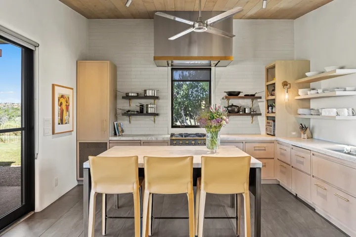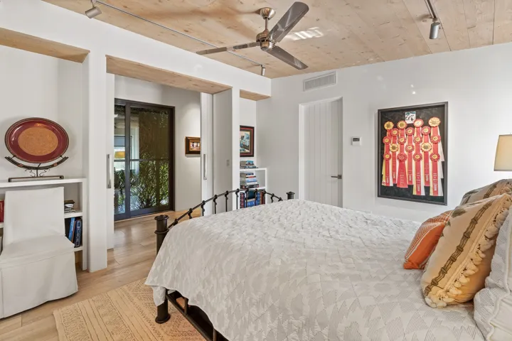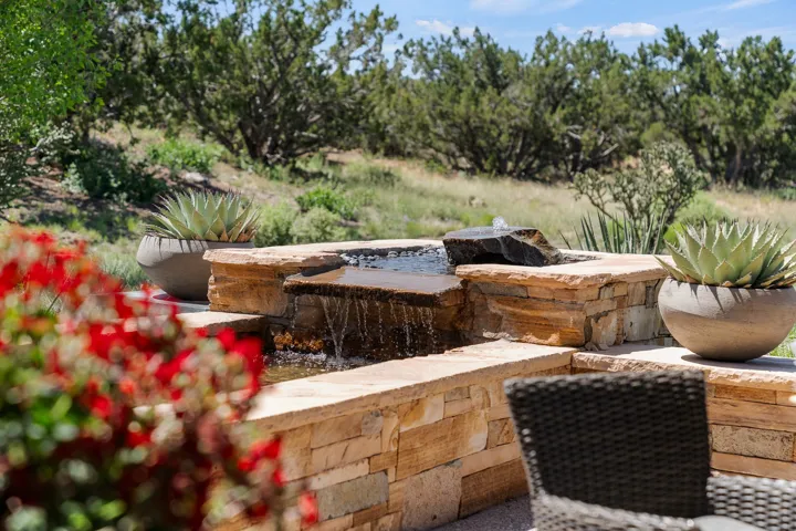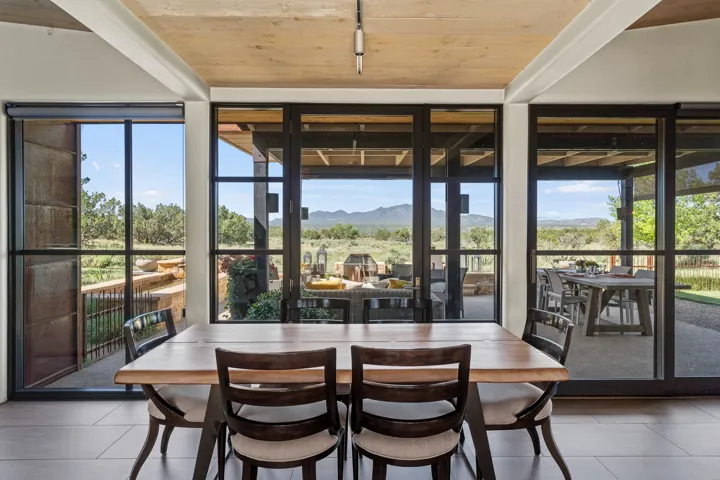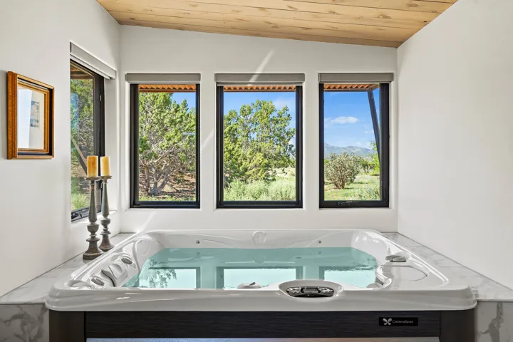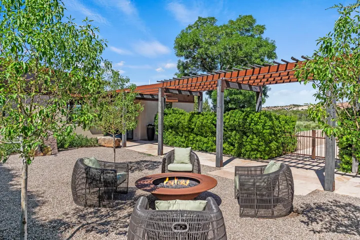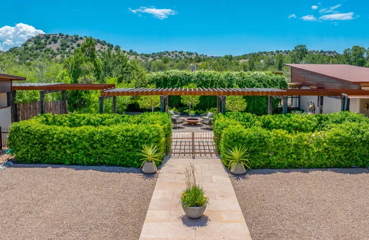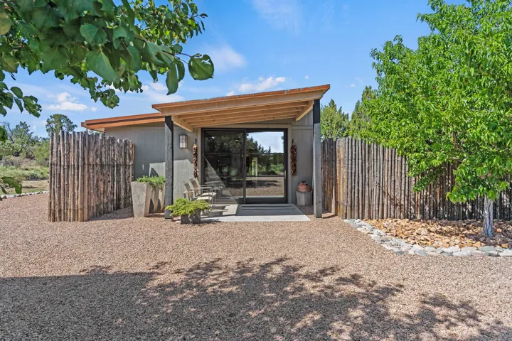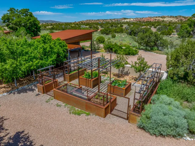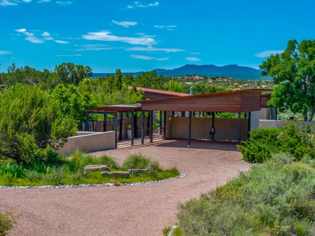 The layout offers both simplicity and flexibility, with two bedrooms and a third space perfectly suited for a guest suite, office, or creative studio. Every detail is intentionalācustom built-ins and integrated storage maintain clean lines without sacrificing utility. Expansive ceilings and precisely placed windows draw in natural light and frame breathtaking panoramas from nearly every room. The chefās kitchen is a showpiece of design and performance, anchored by a La Cornue range, Sub-Zero refrigerator and freezer, and Miele dishwasher. Raked German oak cabinetry and honed Taj Mahal marble countertops offer a warm, sculptural backdrop for both cooking and gathering. The primary suite is a peaceful retreat, complete with a spa-like bath featuring a Caldara salt-water hot tub, a custom walnut vanity with black Caesarstone counters, and a beautifully crafted walk-in shower. Seamless indoor-outdoor living defines the home. A welcoming entry courtyard, stone patios and covered areas extend the living space, perfectly oriented for sunrise coffee and sunset gatherings. A custom water feature adds a meditative element and is fed by a 12,000 gallon rain-catchment system that also supports the landscaping and garden irrigation. A 52-inch propane firepit, built-in pizza oven, and drought-tolerant yet lush landscaping complete the inviting feel of the exterior spaces. A 21 gal/min private well ensures abundant, high-quality water. A fenced and irrigated raised-bed vegetable garden/orchard and equipment/tractor workshop are adjacent to the 2 car carport (with EV car charger). The perimeter of the acreage is fenced and offers a perfect setting for equestrian facilities, including over two miles of scenic private riding/hiking trails that wind through rolling high desert terrain. An adjacent 20 acre parcel is also available for those seeking even more space and privacy. Rarely does a property of this architectural caliber and ecological sensitivity come to market. This is an extraordinary opportunity to own a soulful, design-forward retreat in one of Northern New Mexicoās most scenic and serene settings. Only 10 minutes to Madrid and 20 minutes to Santa Fe.