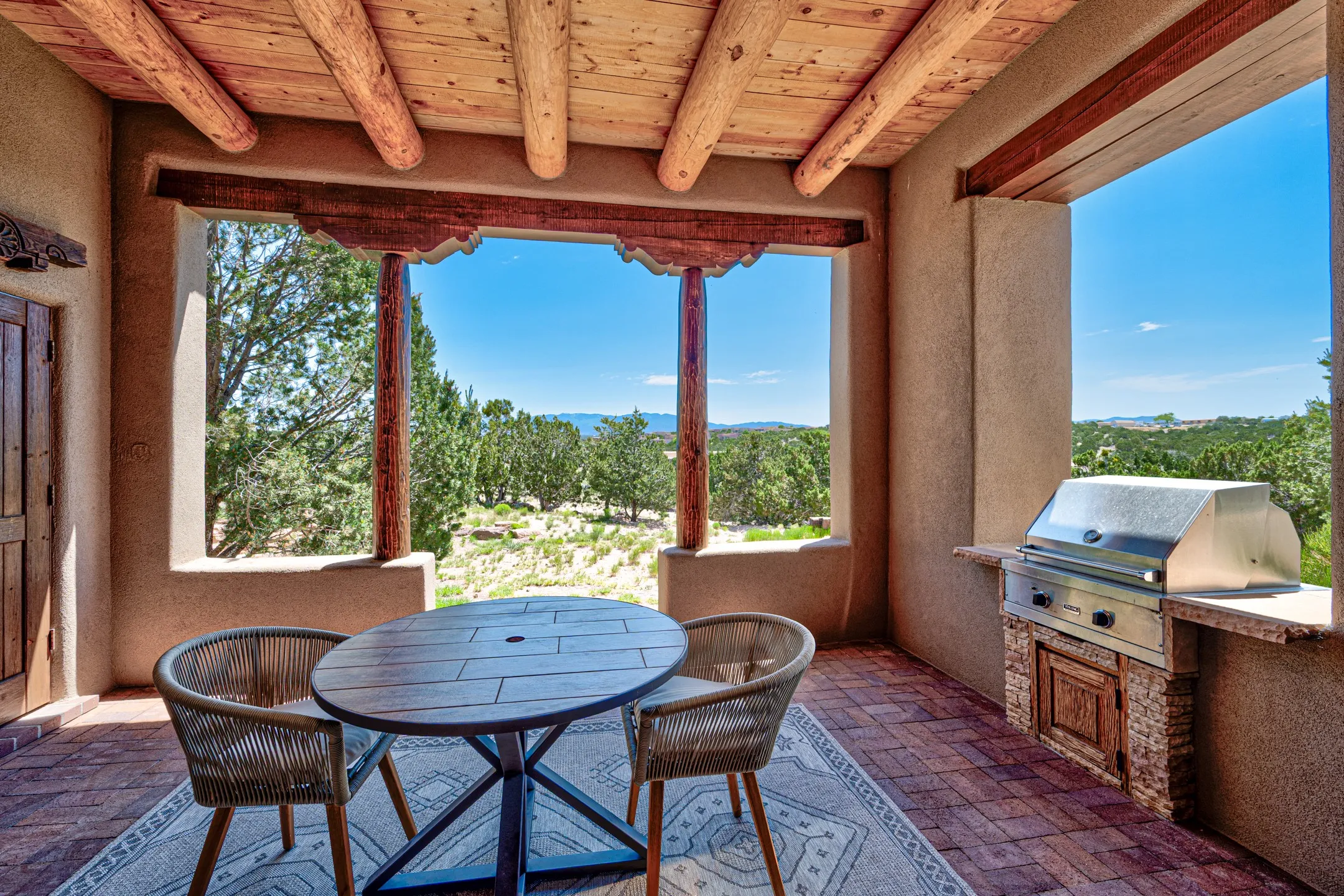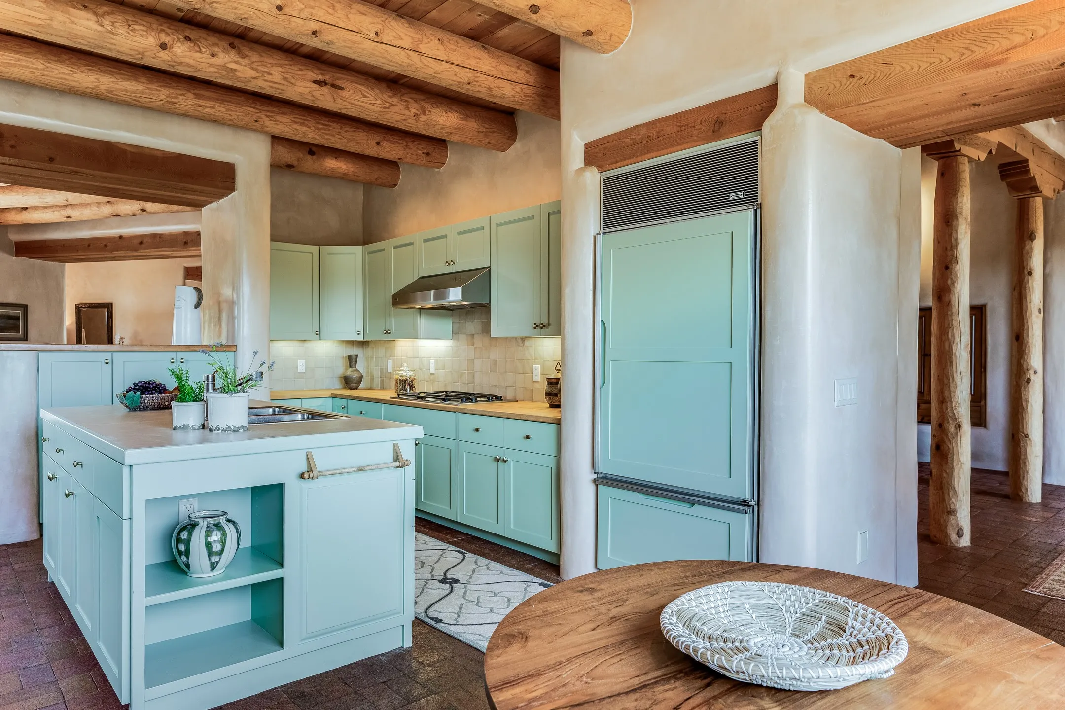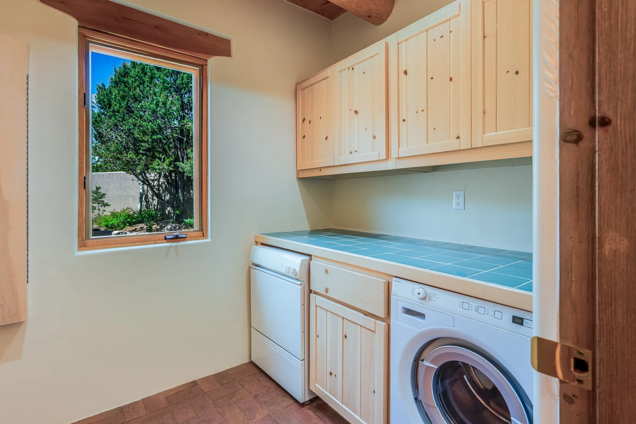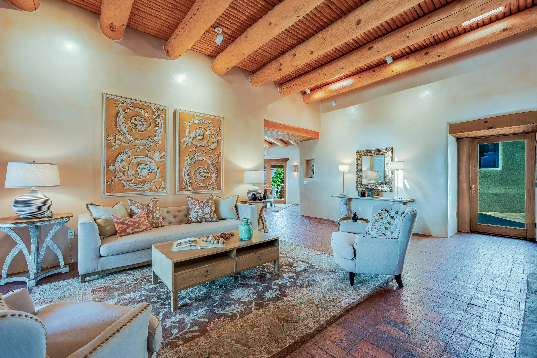 With form and function seamlessly integrated, the sense of a relaxed elegance is promoted by the dwellingās creature comforts: tall ceilings, single-level open plan layout, large windows, natural materials, and strategically placed outdoor living areas. Contemporary touches, seen in the selections of materials, finishes, and fixtures, are balanced with the acknowledgement given toward āSanta Fe charmā through the use of plaster wall finishes, brick flooring material, and exposed kivas.