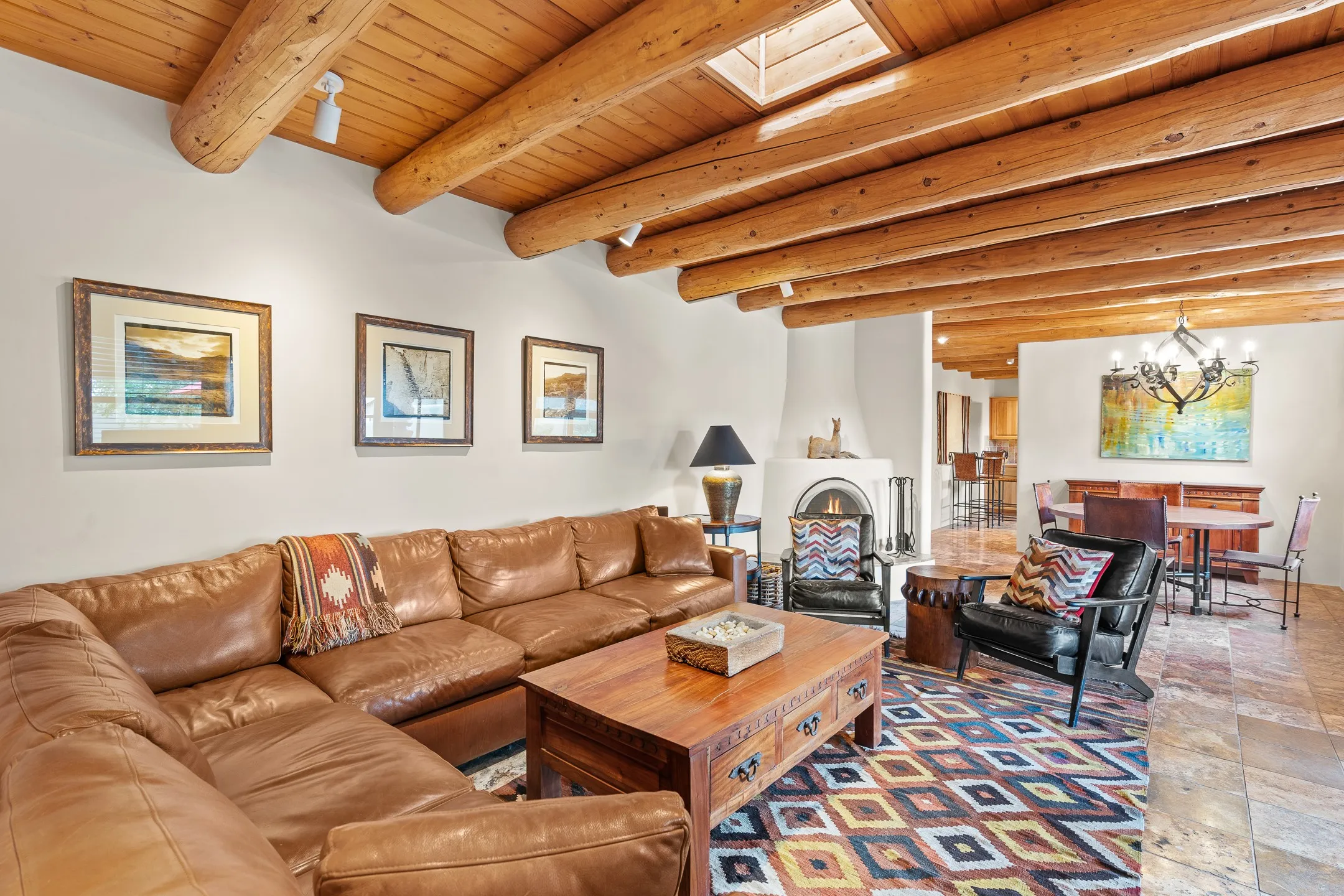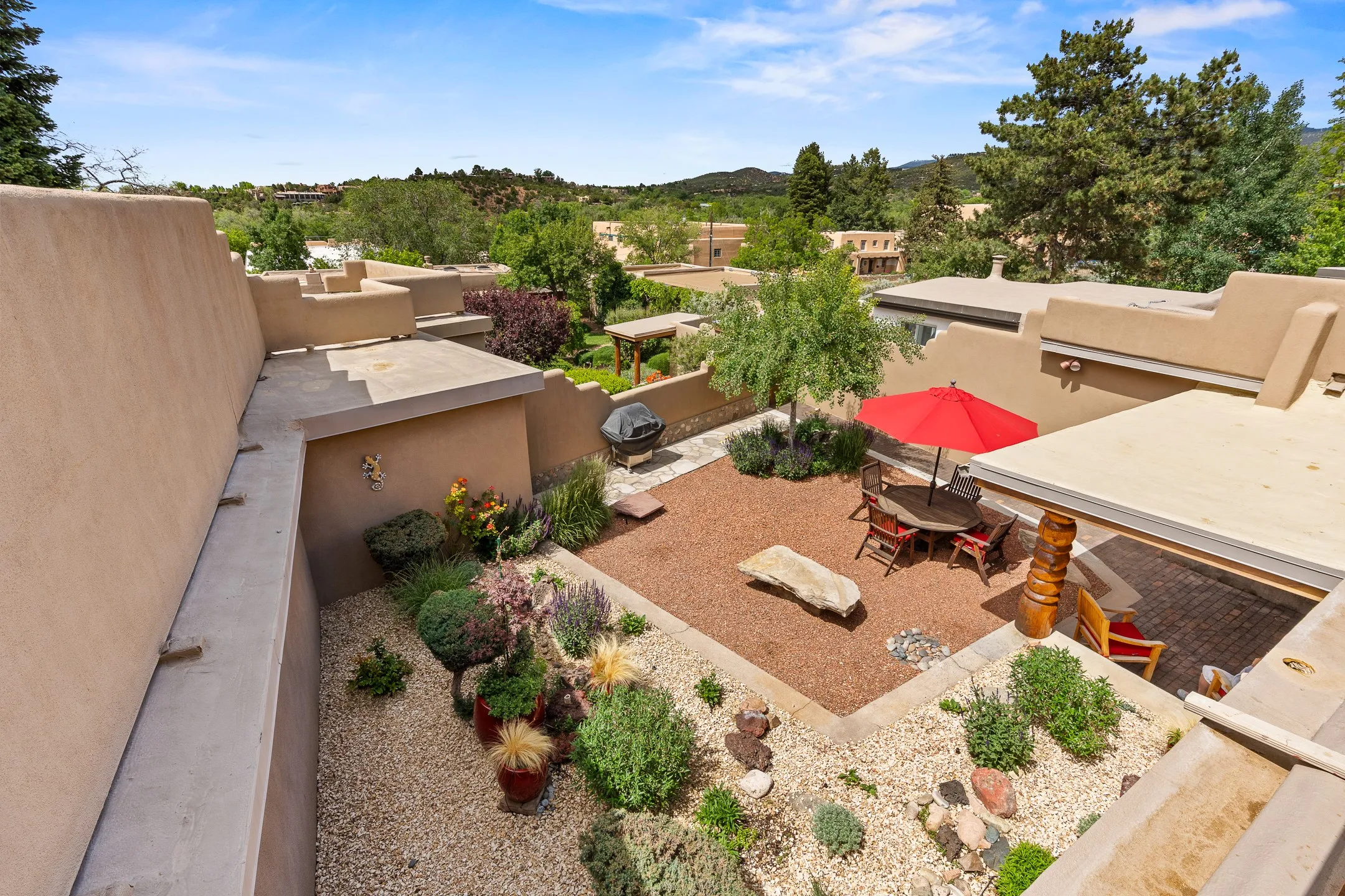 This Historic Eastside home is in the gated Girard Gardens Compound located a block from the Canyon Road arts district. It consists of a beautifully appointed main home and a guest casita. The casita has the possibility of being used as a wonderful studio, home office space or as an income generating rental. The location of this property has close proximity to all Santa Fe has to offer. Hiking, skiing, mountain biking, along with the fabulous restaurants and cultural activities for which it is famous. Mountain views from the expansive upstairs deck, a large private outdoor garden space. 3 large bedrooms, 3.5 bathrooms with ample closet space. The fully equipped kitchen has stainless appliances and is a bright welcoming space for the cook in the family. A detached garage is included with the main home. The guest casita has its own parking space. This is a turn-key sale which includes all designer selected furnishings.