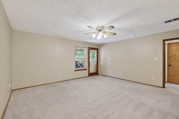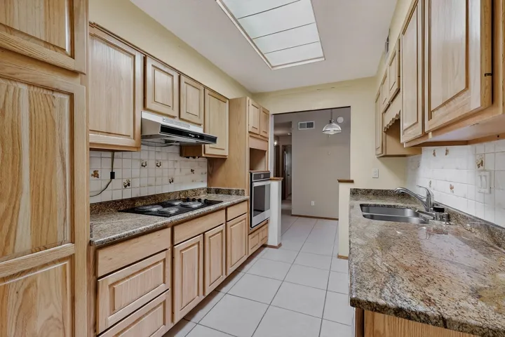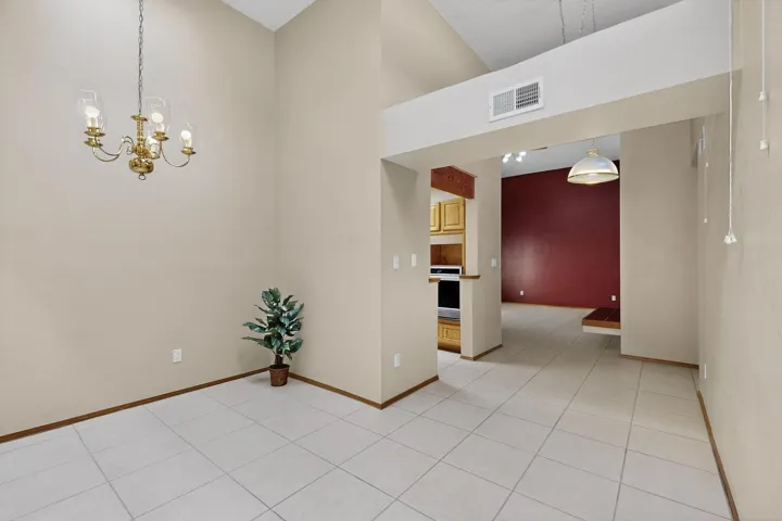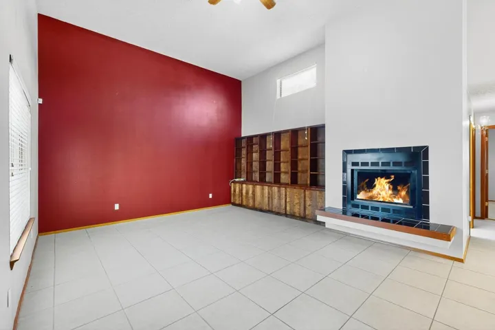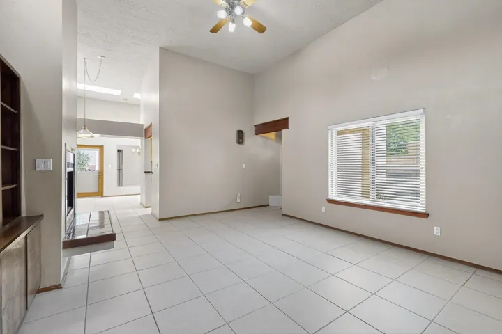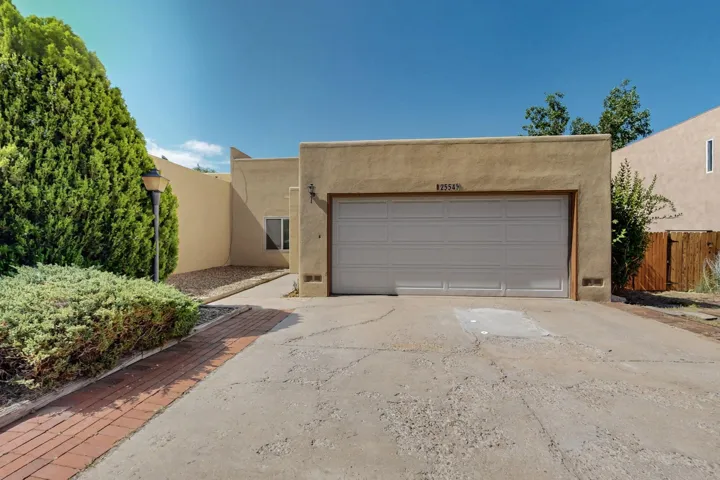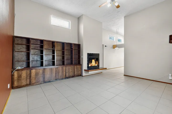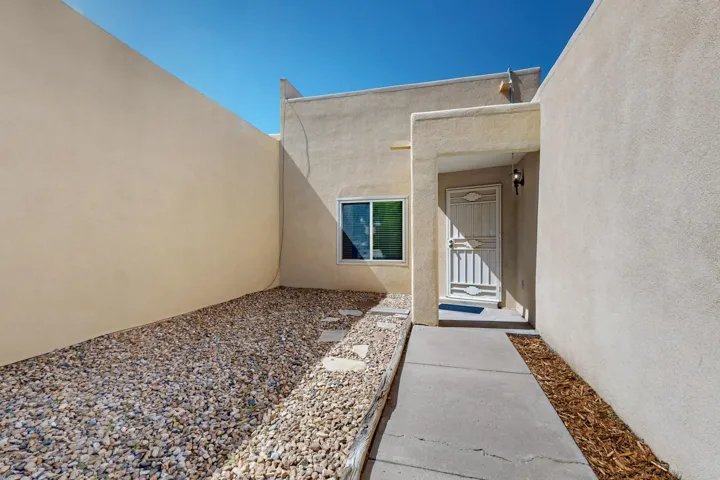 This beautifully, well-maintained single-level two-bedroom home with a two-car garage is exactly what you’ve been looking for today! High ceilings and a wood-burning fireplace in the living area welcome you with a great first impression. The efficient galley kitchen, clerestory windows, and tile everywhere except for the bedrooms make for very comfortable Santa Fe living. The custom flagstone patio looks over an arroyo with great sunset views. Wonderful covered patios to entertain! There are cherry & pear trees and grape vines in the backyard. The second bedroom has outside access to the patio. This property is conveniently located near shopping and schools.