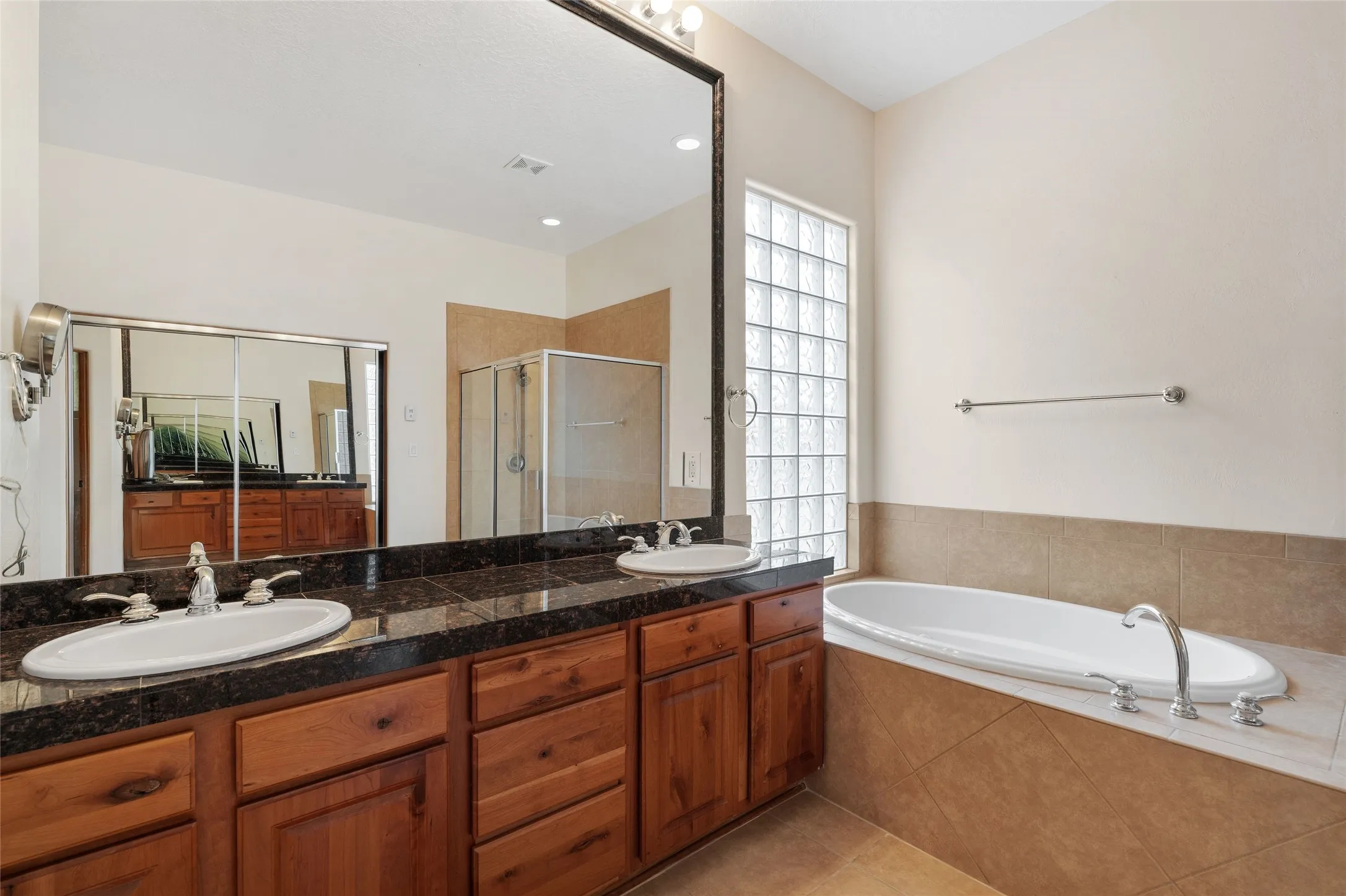 The spacious home features a large open kitchen, dining and living area floor plan with large view windows, patio/portal access, 12 ft ceilings with vigas, and a corner kiva fireplace with custom screen. The primary suite has total separation, boasts an oversize walk-in closet, a spacious bath with a big double vanity area, jetted tub, walk-in shower and private WC. The substantial 4th bedroom offers versatility with its own French doors entrance for private office, family room or your own desired application.